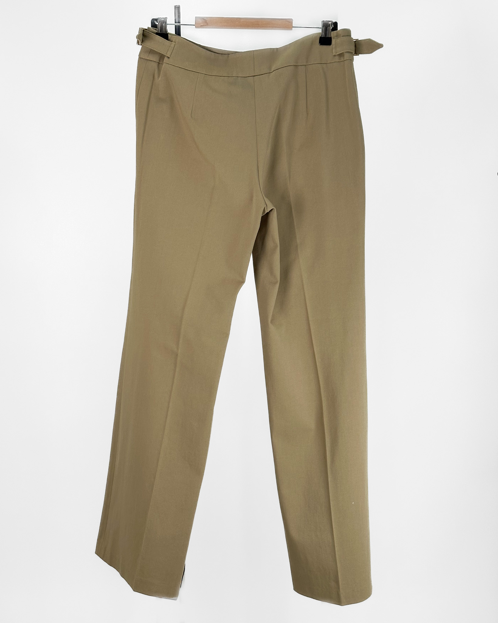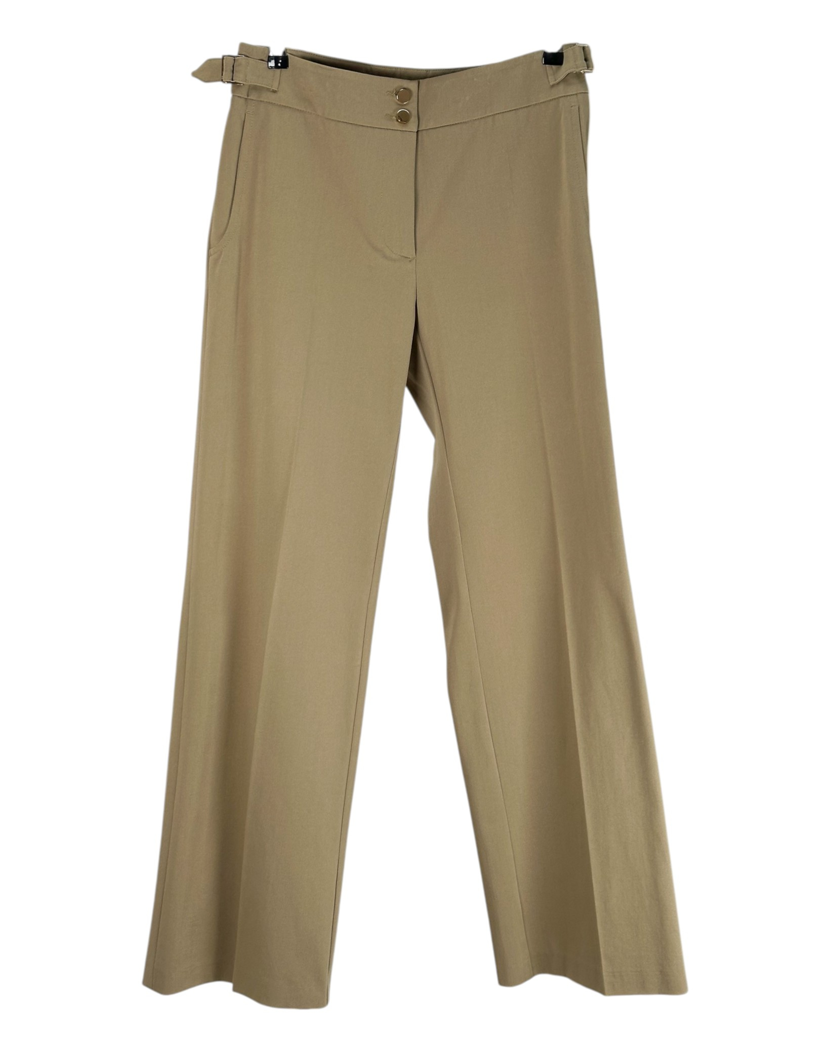 "Khaki spodnie w kant, delikatnie rozszerzane, po bokach złote klamerki, zapinane na dwa złote guziki. Rozmiar 42, wymiary: Szerokość 40cm, długość 107cm. Skład 95% bawełna, 5% elastan, z metką."