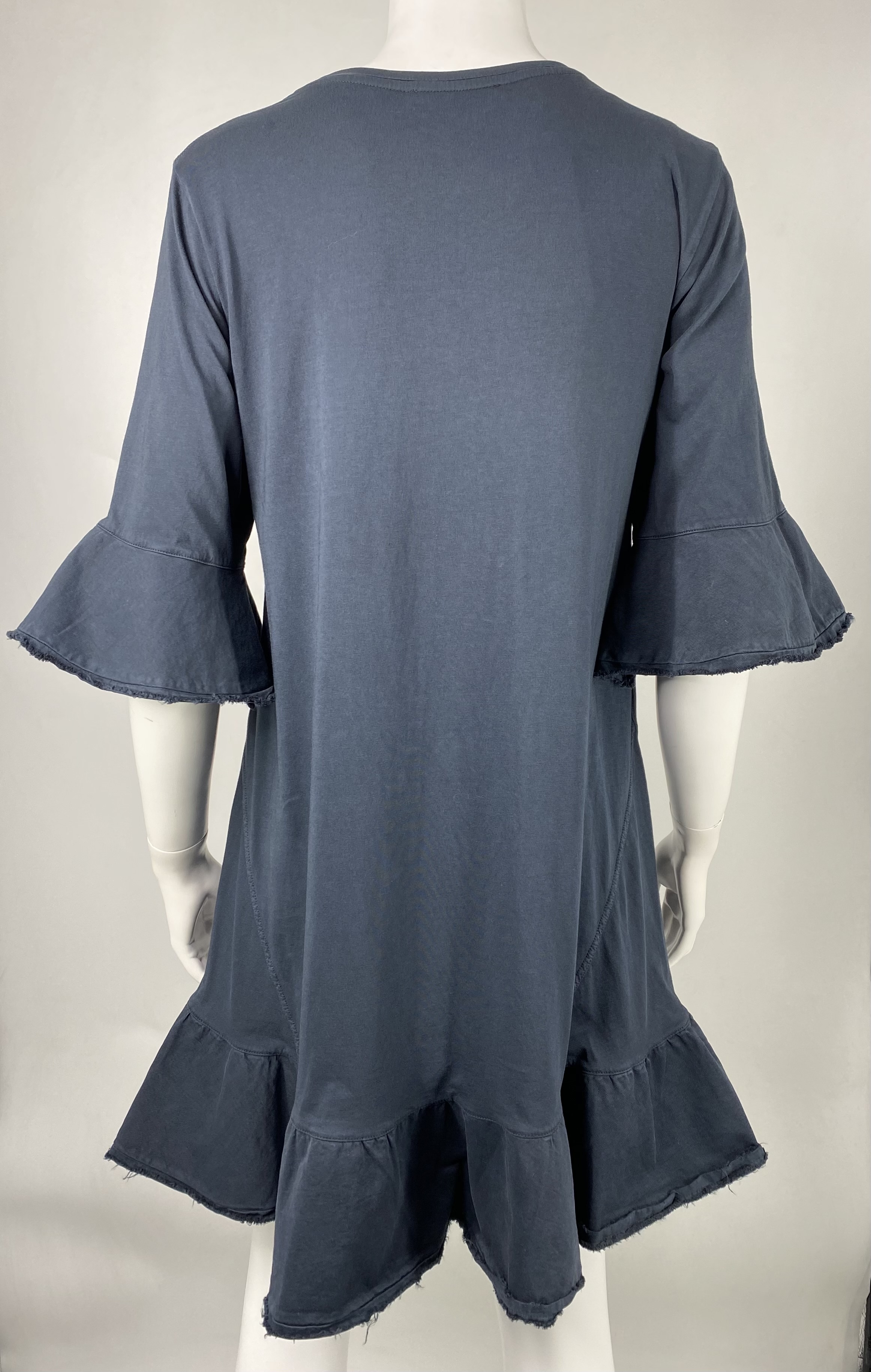 "granatowa bawełniana sukienka typu oversize, krótki rękaw, dół sukienki oraz rękaw zakończony falbankami, roz. z metki 0, skład: 100% bawełna.Wymiary: dł. całkowita 79 cm, szer.biust 44 cm, szer. ramiona 44 cm"