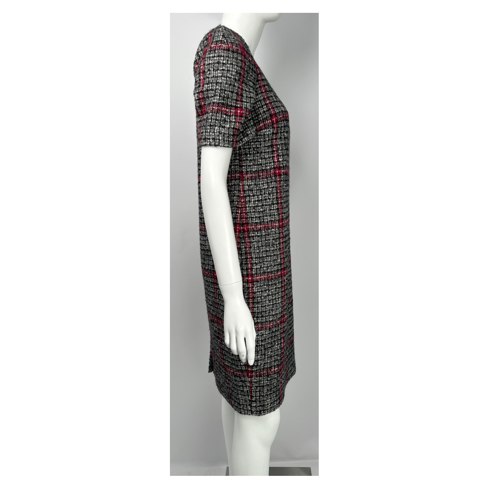 "Tweedowa sukienka z krótkim rękawem. Ma wzór w szeroką, szaro-czerwoną kratę, dekolt wykończony w literę V oraz zapięcie na kryty suwak i pojedynczą haftkę. Od spodu podszyta jest materiałem w beżowo-brązową panterkę. Z tyłu ma delikatne rozcięcie. Kobiecie średniego wzrostu będzie sięgała do kolan. Stan: bardzo dobry. Rozmiar: M. Skład: 37% wełna, 20% poliamid, 15% alpaka, 15% moher, skład podszewki: 97% poliester, 3% elastan. Wymiary: dł. (mierzona od linii karku): 88 cm., szer. (mierzona od pachy do pachy): 42 cm, szer. rękawa (mierzona na wys. pachy): 17 cm., szer. (mierzona w pasie): 43 cm."