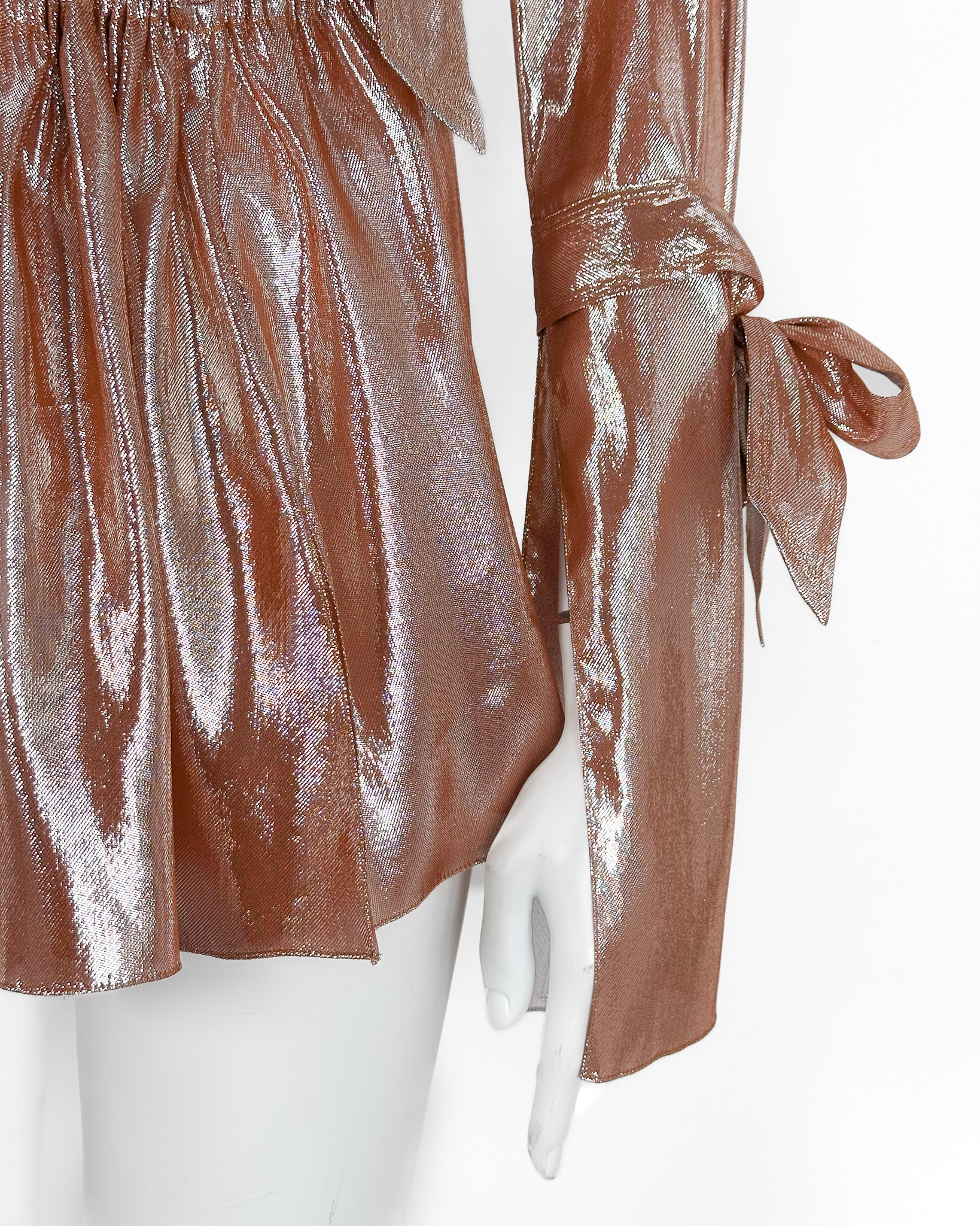 "Pomarańczowo-srebrna połyskująca jedwabna koszula, półtransparentna, dłuższy krój, taliowana, wiązana przy dekolcie, na rękawach i w pasie, głęboki dekolt w serek, stójka, bardzo długie rękawy, szersze i rozcięte mankiety, zakończona delikatną falbaną. Rozmiar z metki IT 42. Skład: 60% jedwab, 40% poliester."