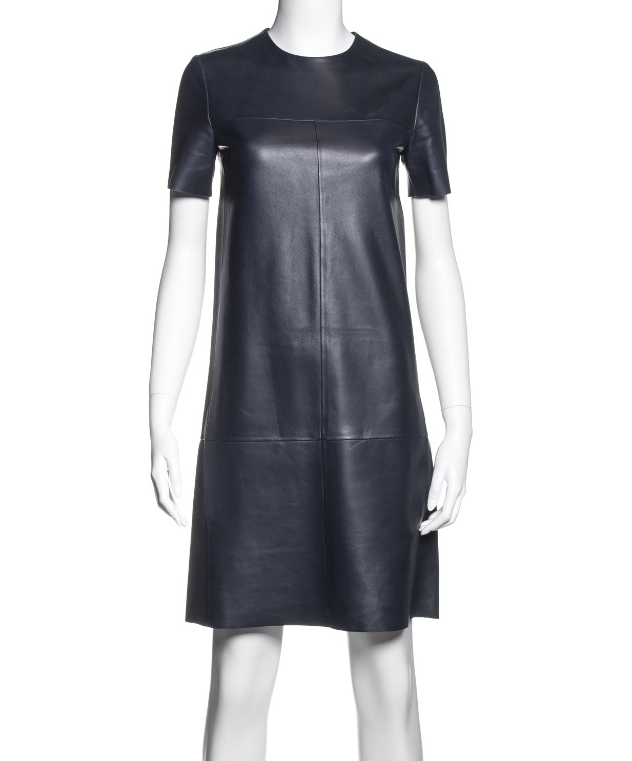 "granatowa, skórzana sukienka, krótki rękaw, prosta, z kieszeniami, przeszyciami, zapinana z tyłu na suwak r.36