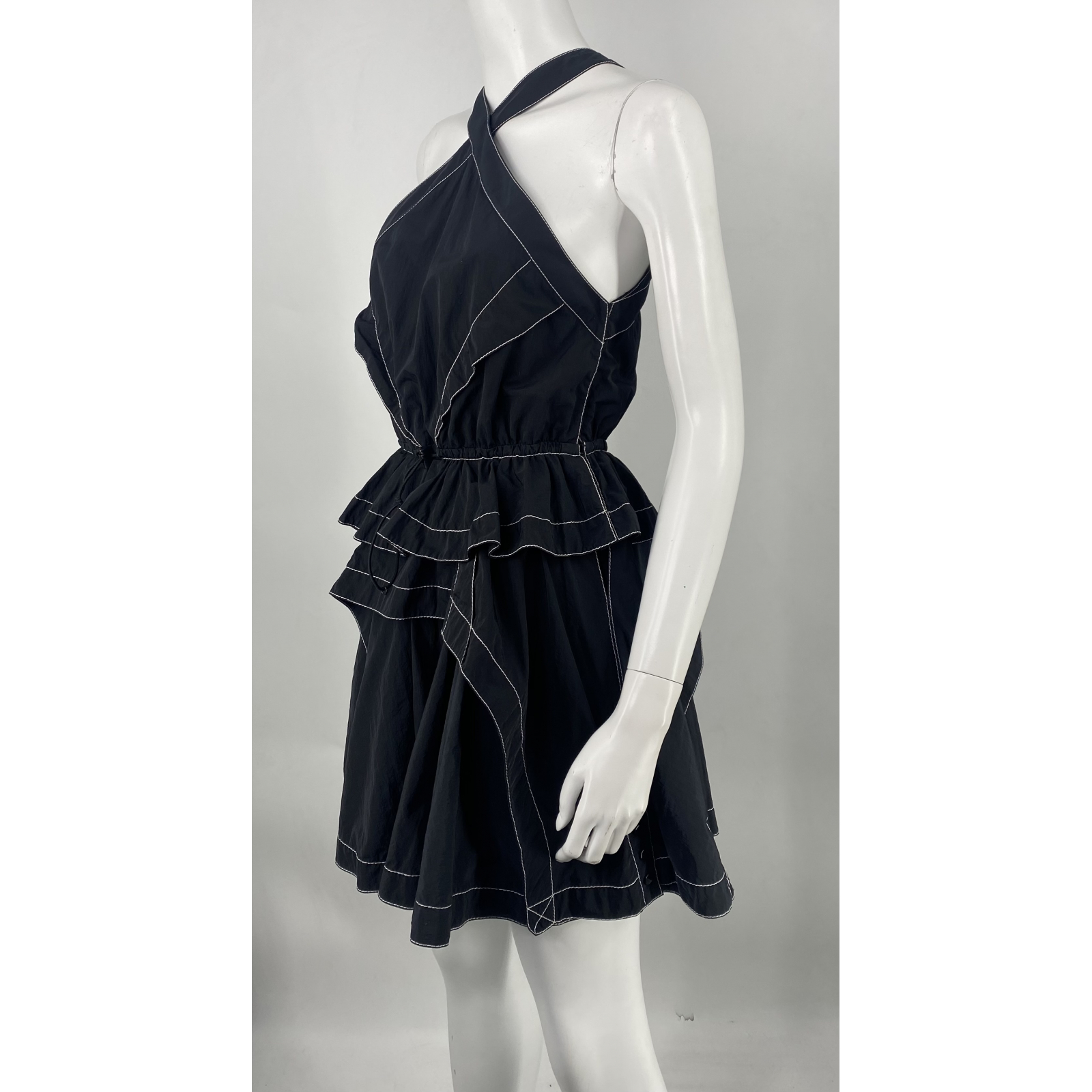 "czarna sukienka ortalionowa, po całości białe przeszycia, ściągacz w talii, rozkloszowana, mini. Rozmiar 4. 100% nylon."