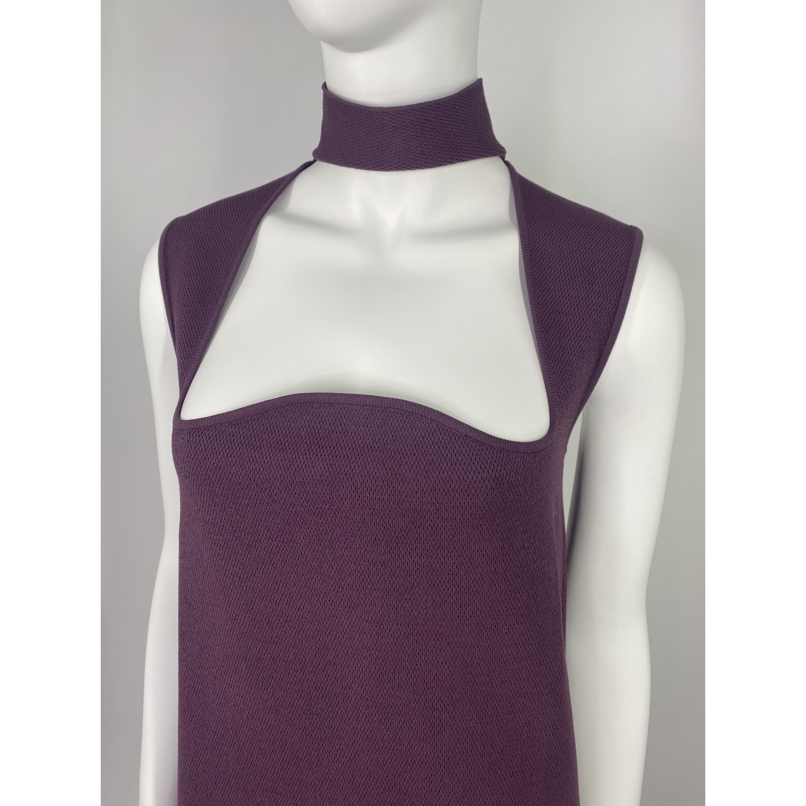 "długa fioletowa sukienka bez rękawów, mocno wycięty dekolt ze wstawką wokół szyi, zapinana z tyłu na kryty suwak. Rozmiar IT 44. Skład:77% bawełna, 16% poliester, 6% poliamid, 1% elastan. Wymiary: szer. ramion 36 cm, szer. biustu 40 cm, szer. talii 44 cm, dł. całkowita 108 cm."