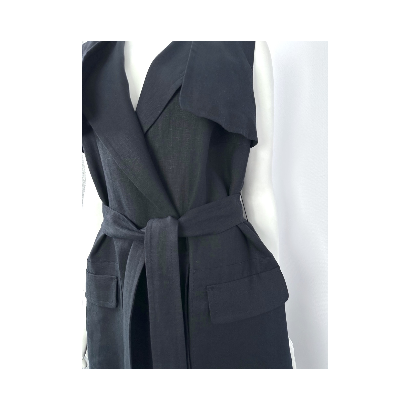 "granatowa zakładkowa kamizelka/sukienka, zapinana na dwa zatrzaski oraz wiązana paskiem w talii, boczne kieszenie z klapami zaszyte. Rozmiar IT 44. Skład: 100% len. Wymiary: szer ramion 35 cm, szer. biustu 46 cm, szer. talii 49 cm, dł. całkowita 93 cm."