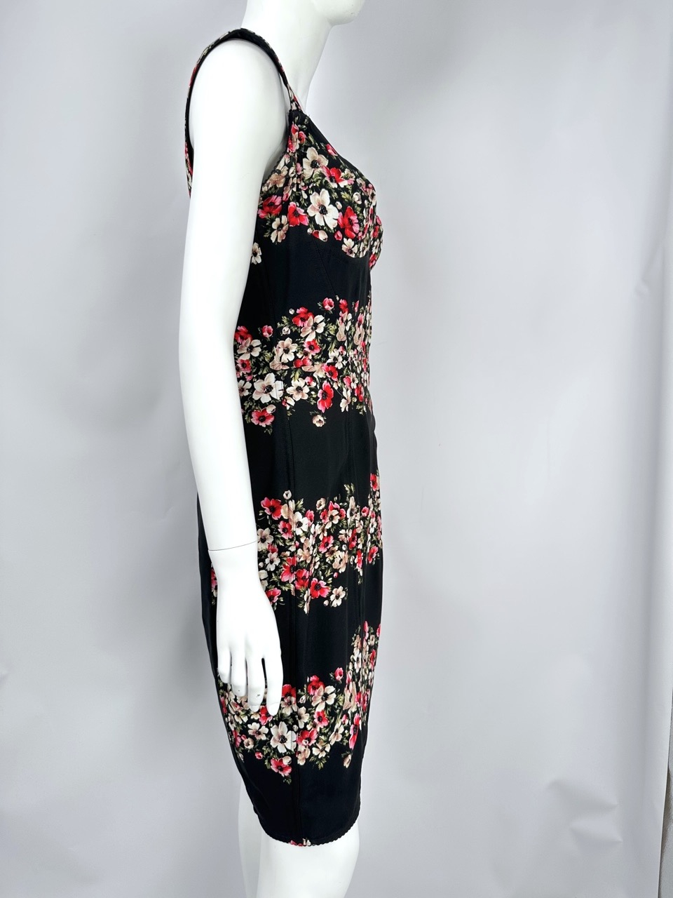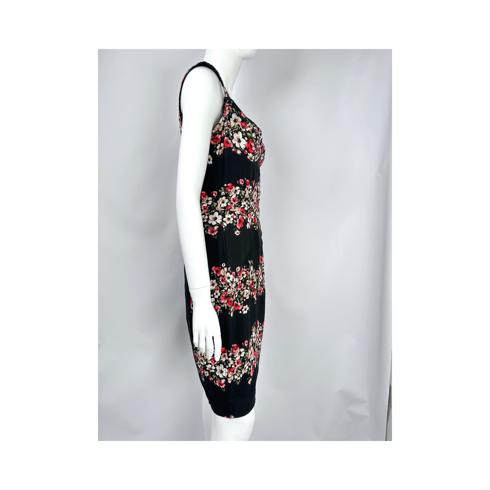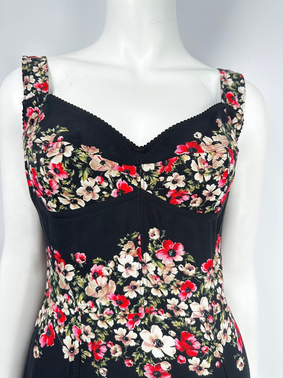 "czarna gorsetowa sukienka w kwiaty, na grubych ramiączkach, góra z fiszbinami, zapięcie z tyłu na suwak. Rozmiar IT 42. Brak metki ze składem. Wymiary: szer. ramion 35 cm, szer. biustu 44 cm, szer. talii 35 cm, dł. całkowita 94 cm."