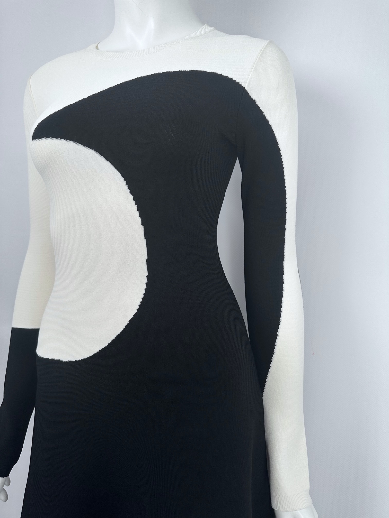 "czarno biała dzianinowa sukienka mini z długim rękawem. Nowa z metką. Rozmiar XS. Skład: 83% wiskoza, 17% poliester. Wymiary: szer. ramion 34 cm, szer. biustu 36 cm, szer. talii 30 cm, dł. całkowita 88 cm, dł. rękawa 61 cm."