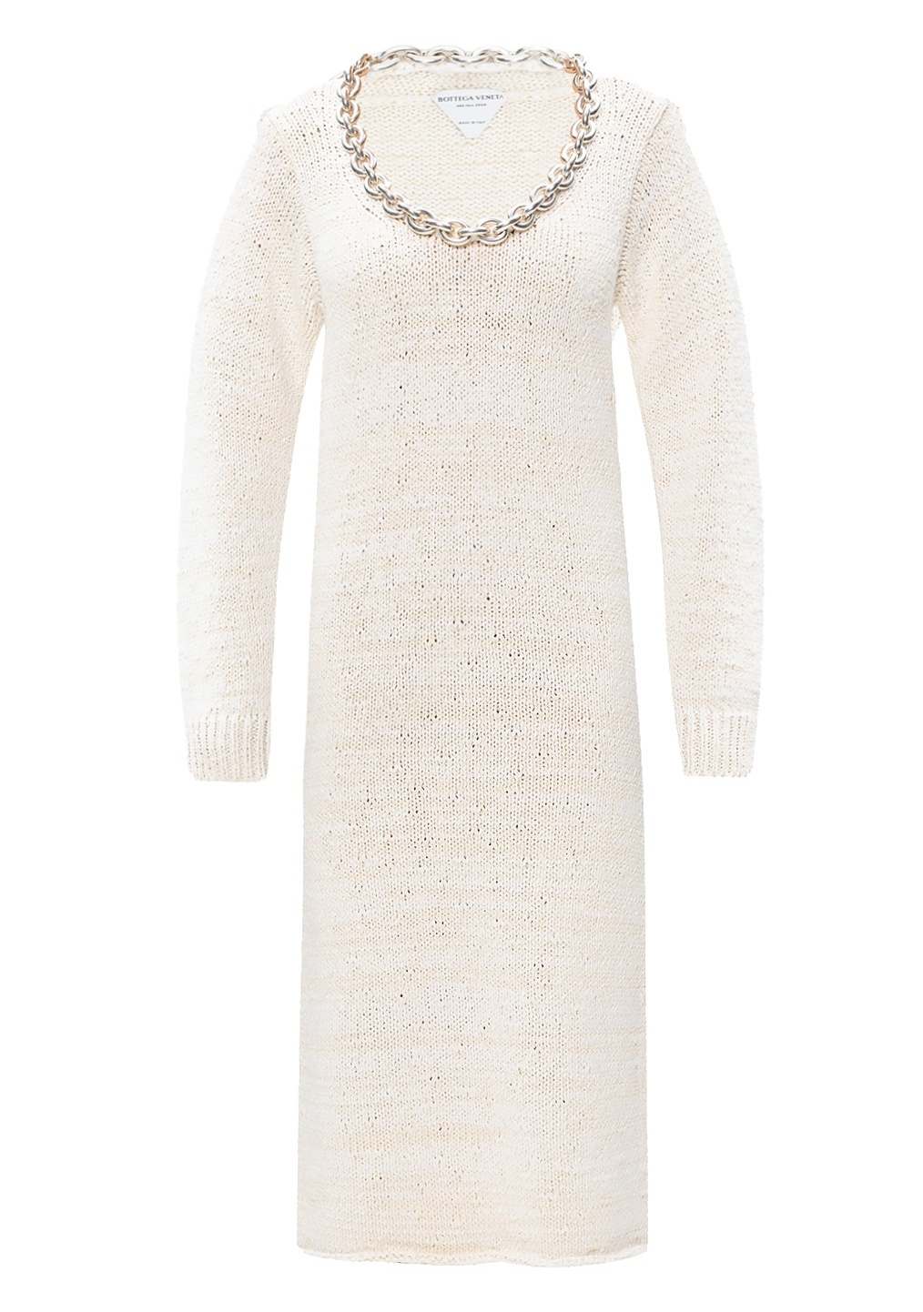 "Kremowo-biała pleciona sukienka wykończona srebrnym łańcuchem przy dekolcie, lekko transparentna, ciężka, okrągły głękoki dekolt, długie rękawy zakończone ściągaczem, wywinięty dół. Rozmiar z metki M. Skład: 93% bawełna, 7% poliamid. Wymiary: dł. całkowita 126 cm, szer. ramiona 40 cm, szer. biust 45 cm, dł. rękaw 73 cm"