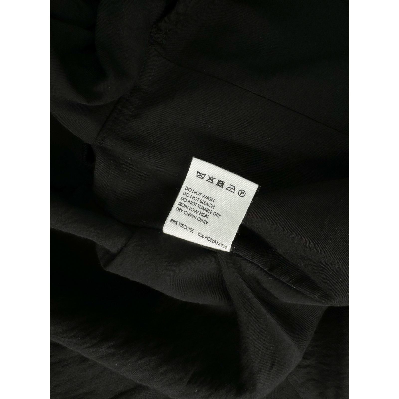 "Czarna koszulowa sukienka, głęboki dekolt, zapinana na guziki, taliowana, ozdobiona marszczeniem w centralnej części, rozpinane mankiety, asymetryczna, zaokrąglony dół. Stan nowa z metką. Skład: 88% wiskoza, 12% poliamid. Rozmiar z metki FR 36. Wymiary: szerokość mierzona od pachy do pachy 41cm, długość całkowita 86cm."
