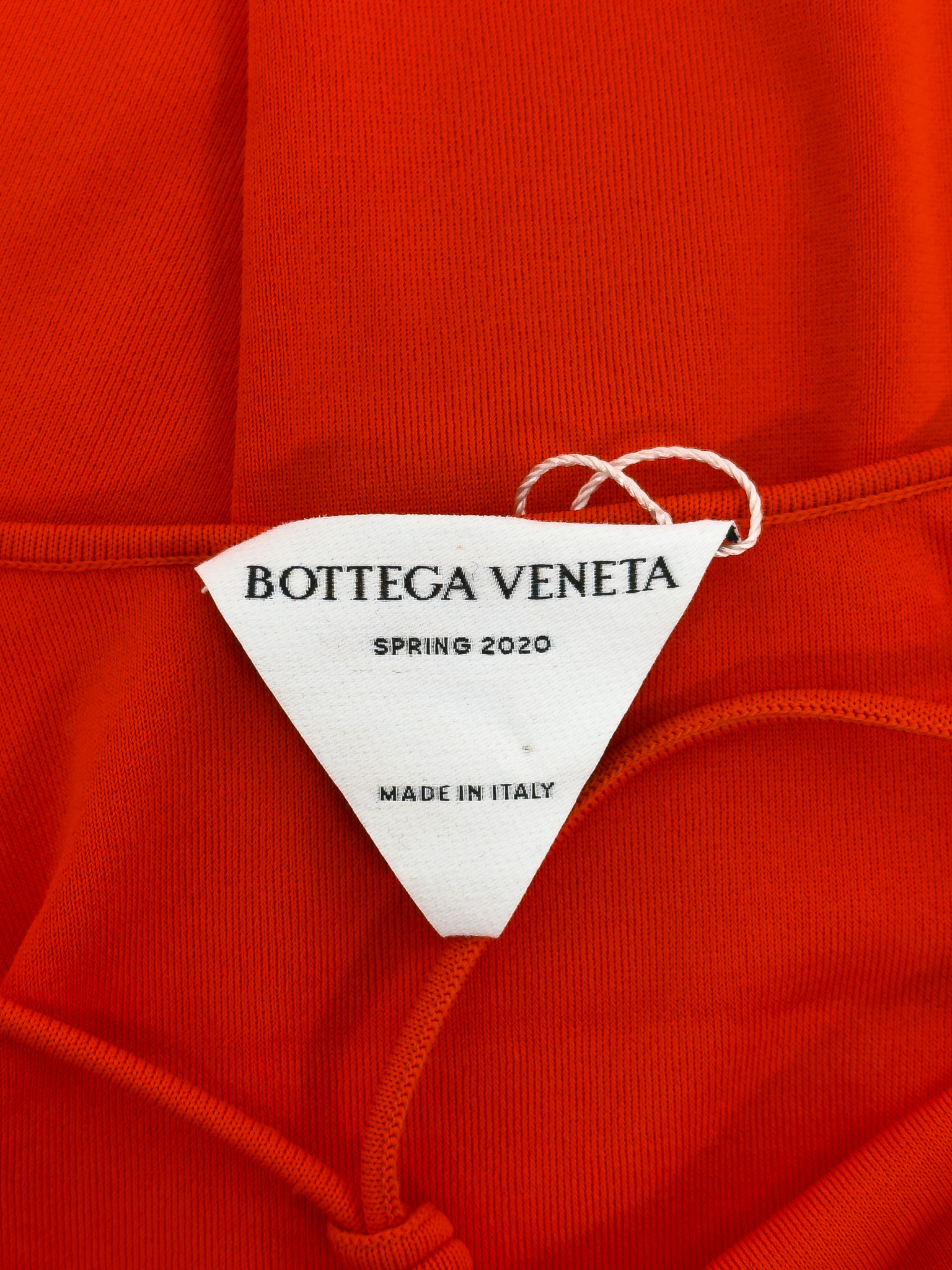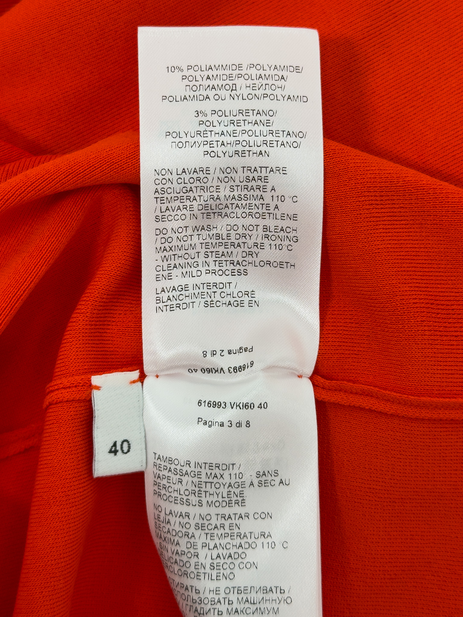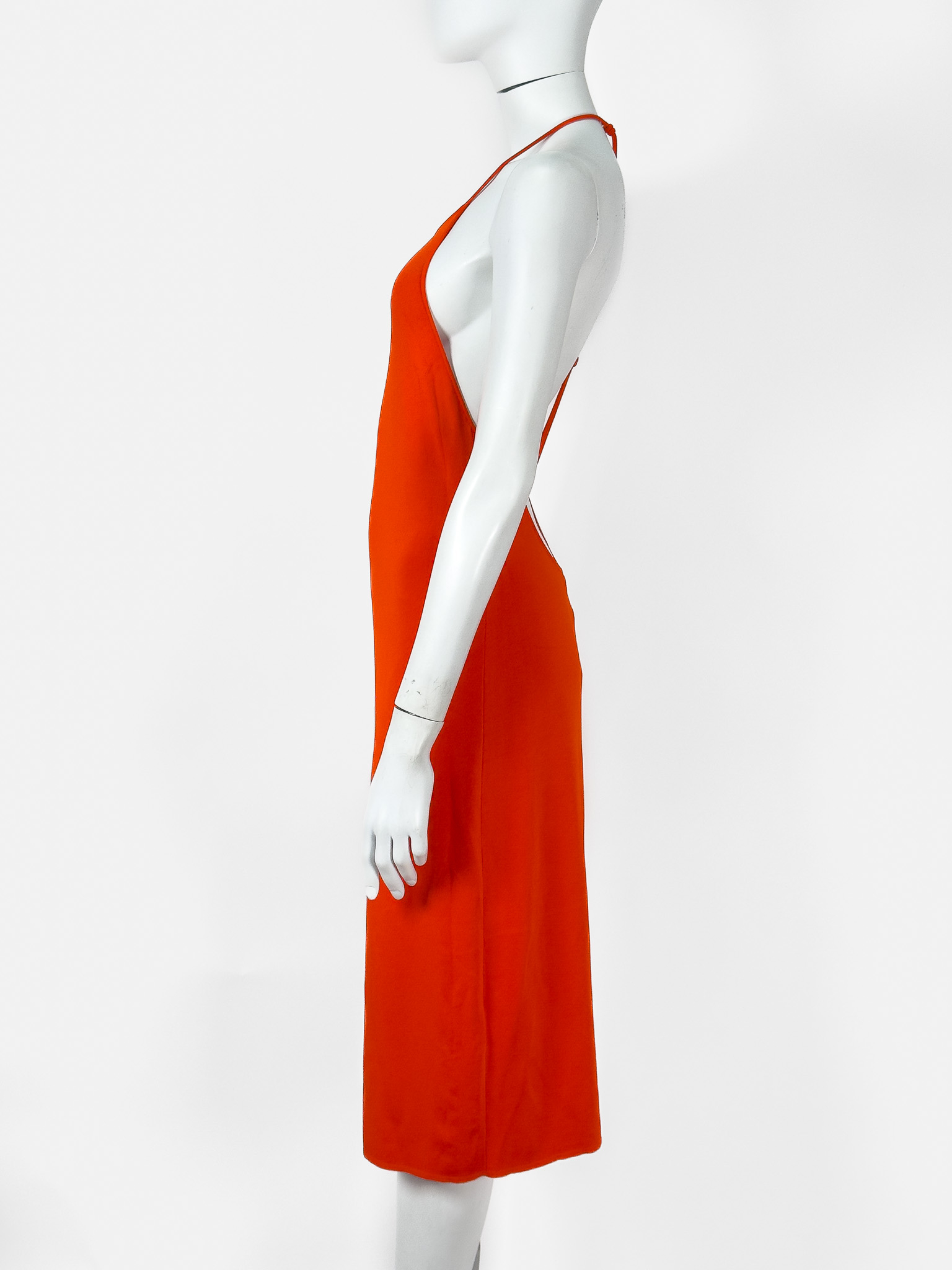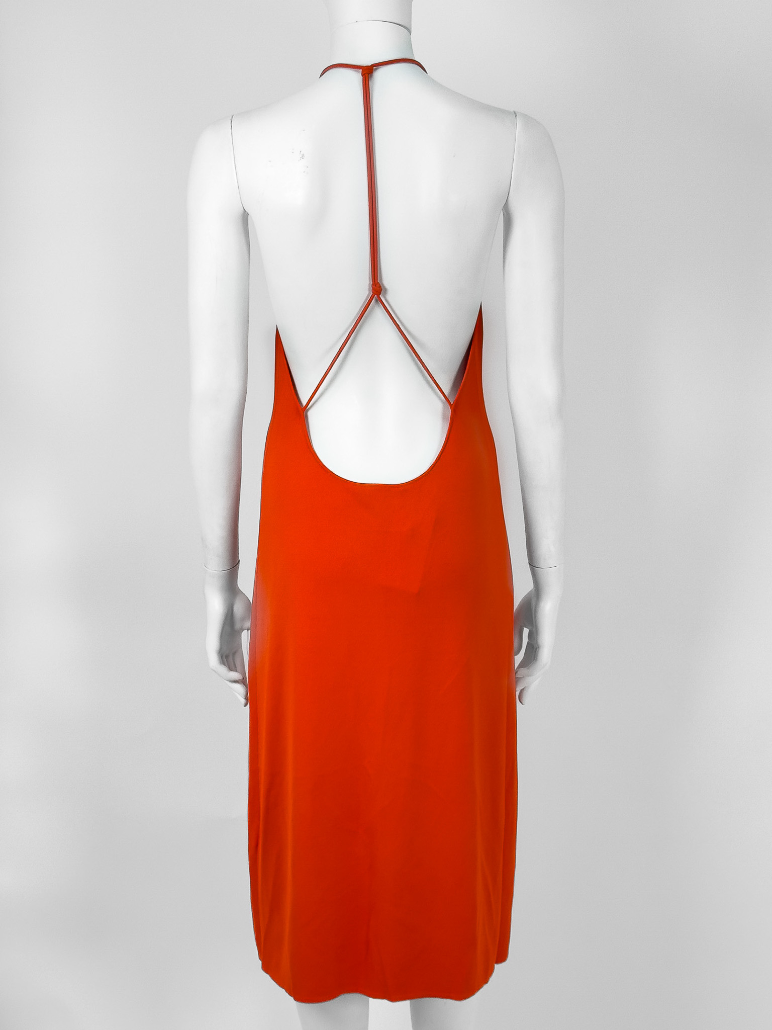 "kolekcja spring 2020; Pomarańczowa sukienka, w kształcie litery "A", cienkie ramiączka, dekolt halter, długość midi, odkryte plecy. Rozmiar z metki IT 40. Skład: 87% wiskoza, 10% poliamid, 3% poliuretan. Wymiary: szerokość mierzona od pachy do pachy 44cm, długość całkowita 113cm."