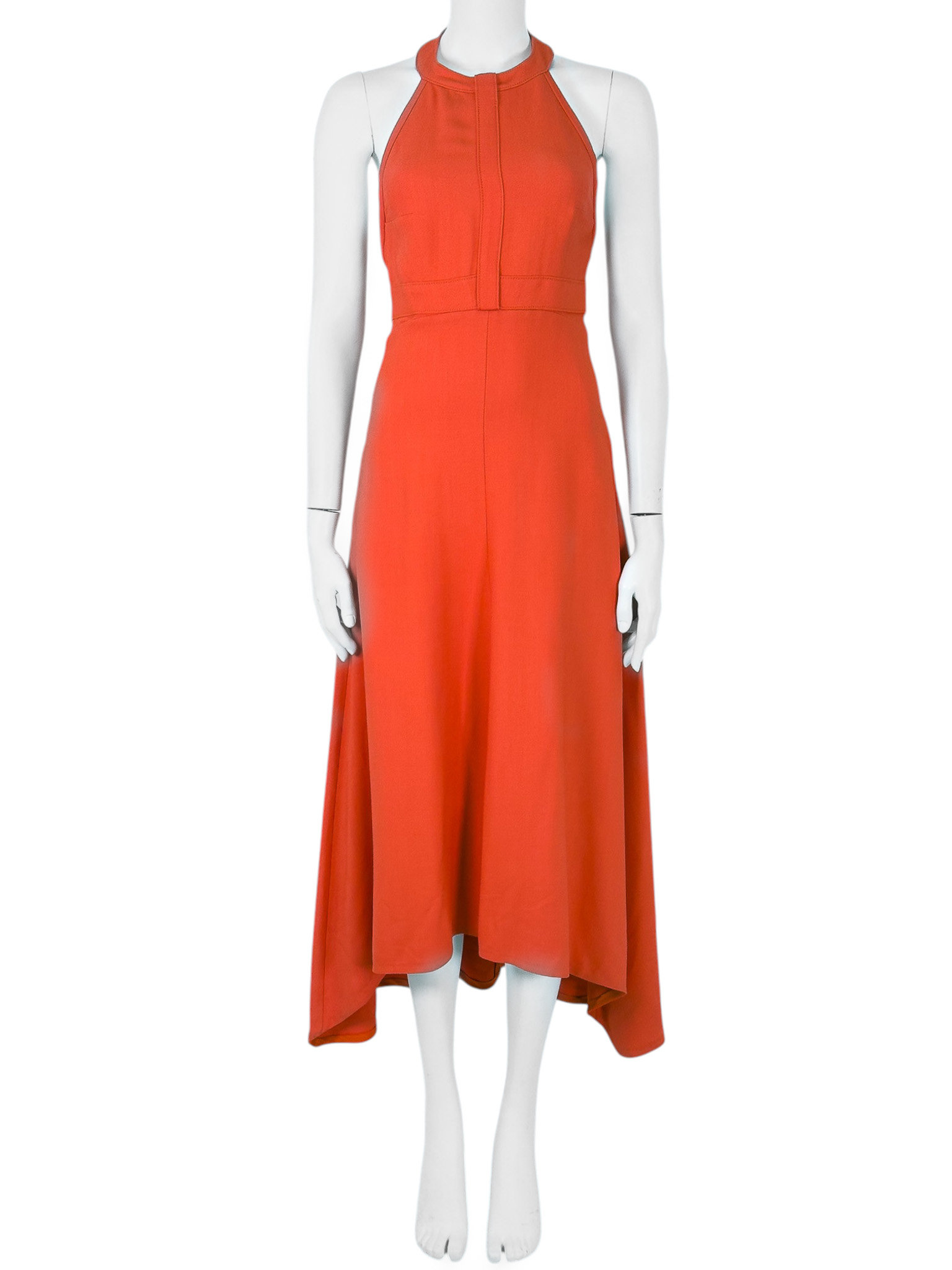 "Koralowa sukienka ozdobiona przeszyciami, długość maxi, rozkloszowany, asymetryczny dół, zapinana w tylnej części na zatrzaski, suwak oraz haftkę, zaokrąglony dekolt, odkryte plecy. Rozmiar z metki 1. Skład: 97% wiskoza, 3% elastan. Wymiary: szerokość mierzona od pachy do pachy 38cm, długość całkowita 139cm."