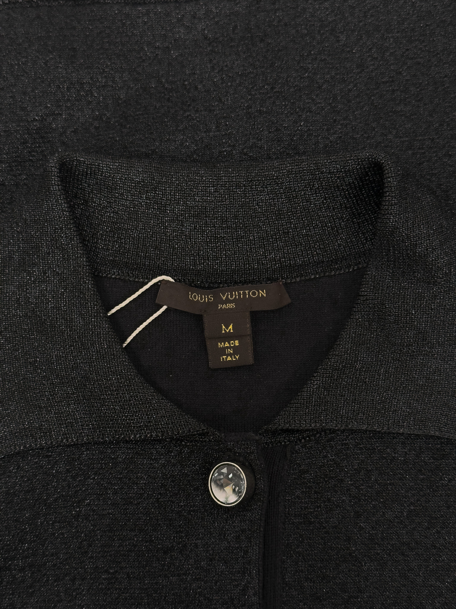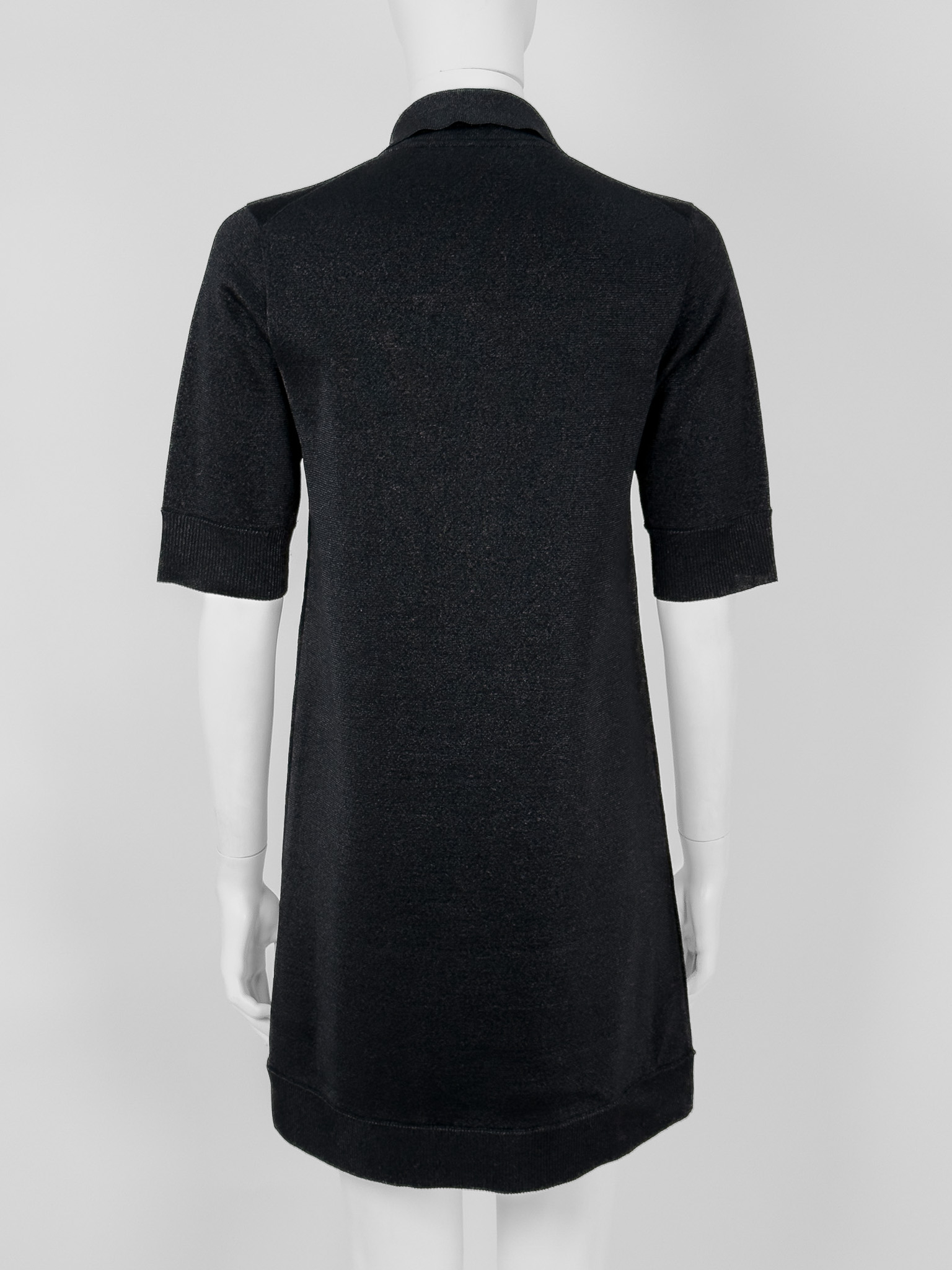 "Czarna brokatowa sukienka o pudełkowym kroju, krótki rękaw, kołnierzyk, wykończona prążkowanym ściągaczem, zapinana na trzy guziki z połyskującymi dużymi cyrkoniami, długość przed kolano, prosty krój. Stan bardzo dobry. Rozmiar z metki M. Wycięta metka ze składem. Wymiary: szerokość mierzona od pachy do pachy 47cm, długość całkowita 86cm."