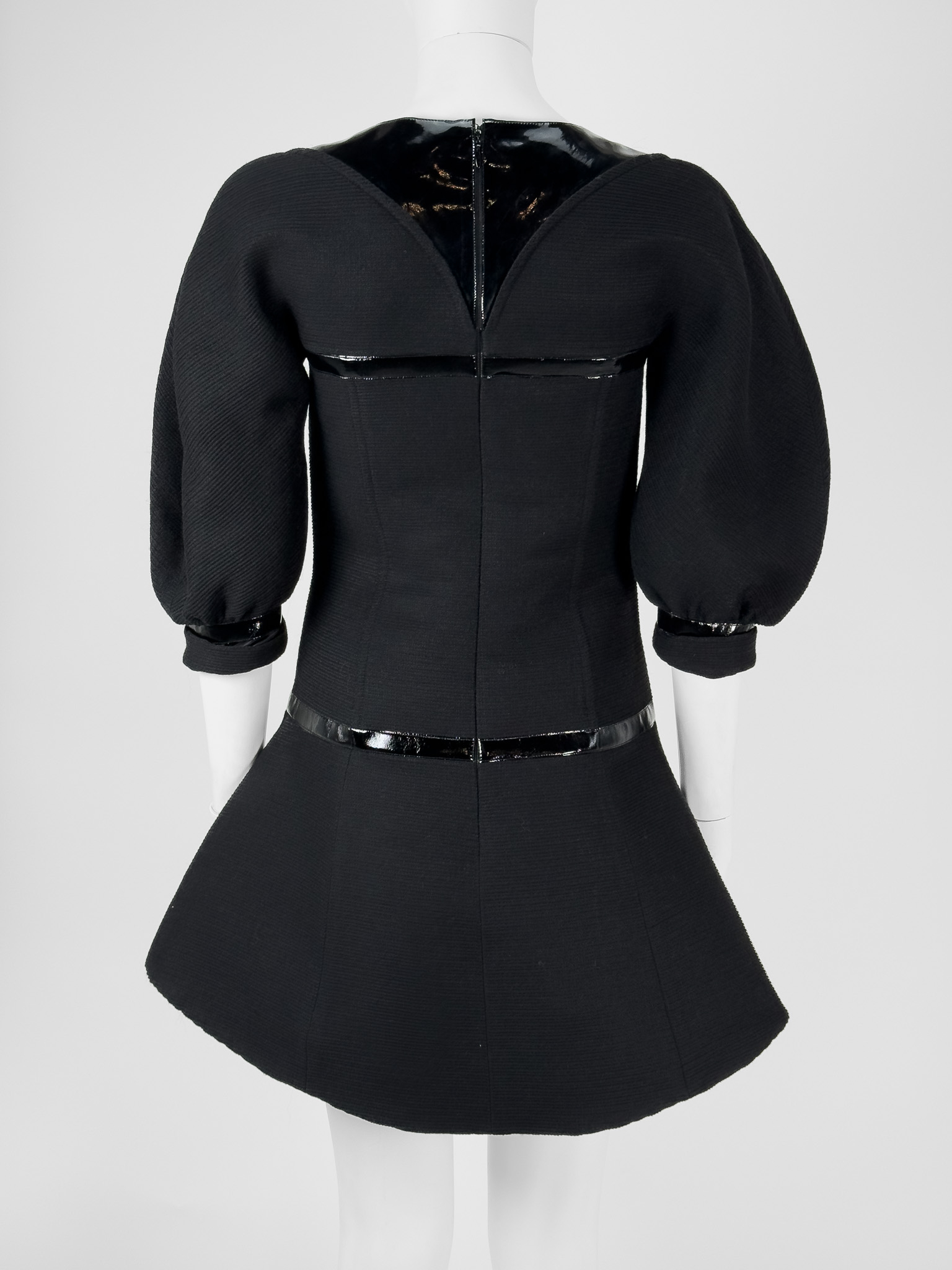 "Czarna tunika, piankowa forma, tył dłuższy od przodu, wykończona lakierowanymi wstawkami, dwie kieszonki na przodzie, bufiaste rękawki. Rozmiar z metki FR 34. Skład: 73% wełna, 27% poliamid, podszewka: 100% jedwab. Stan bardzo dobry. Kolekcja z 2013 roku. Wymiary: szerokość mierzona od pachy do pachy 42cm, długość całkowita 75cm."