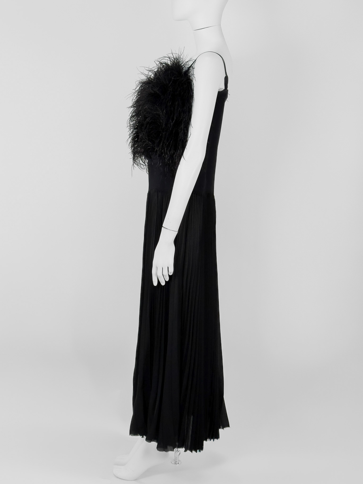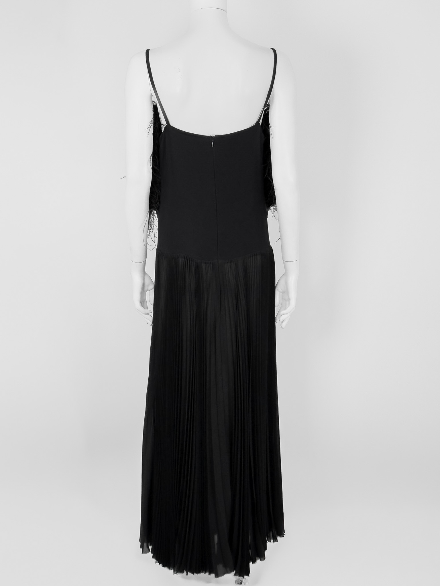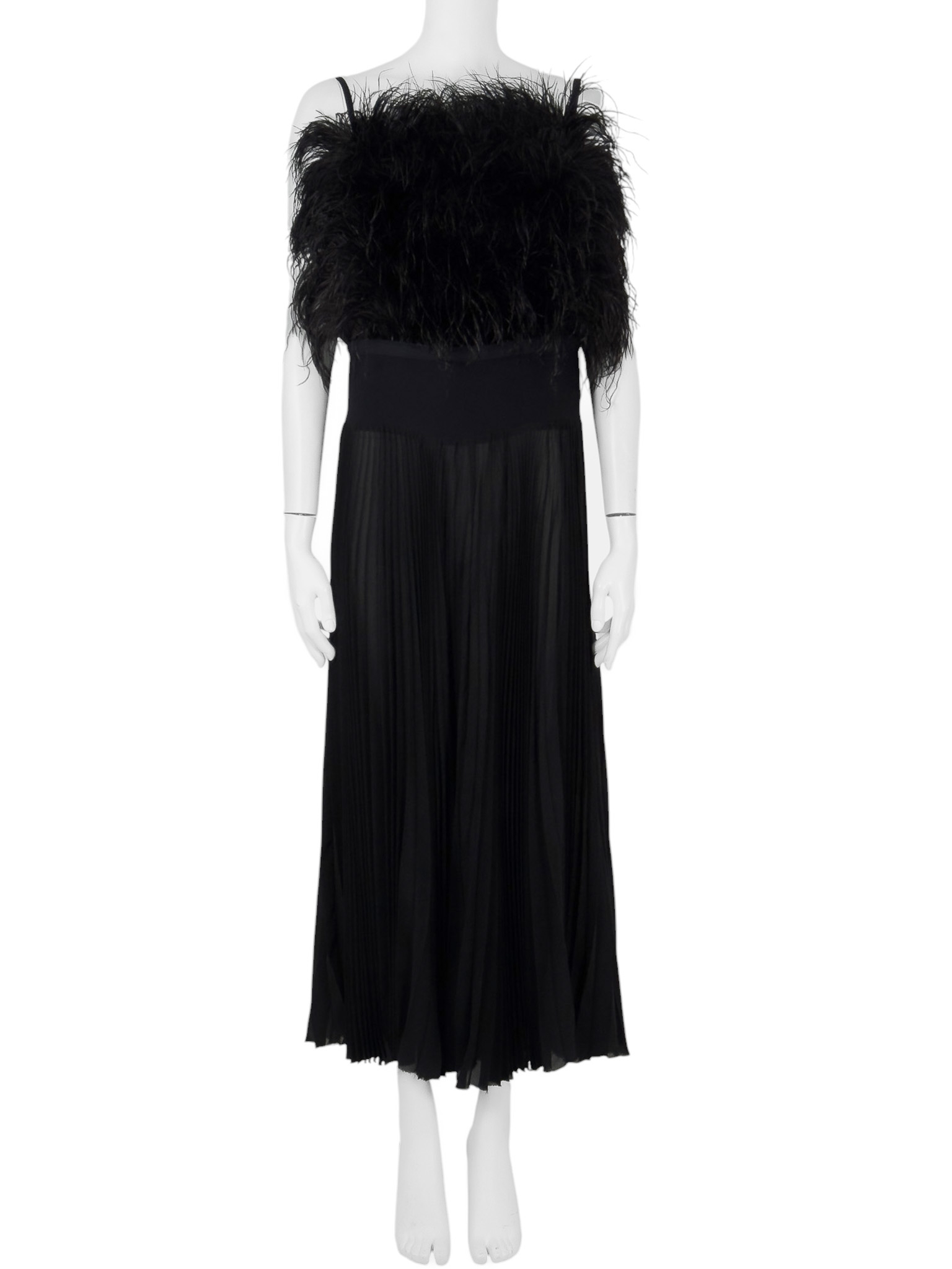 "Czarna sukienka na ramiączkach, w biuście obszyta piórami, dół plisowany, rozkloszowany, podkreślona talia, z tyłu zapinana na suwak, długość maxi, półtransparentna w dolnej części. Brak metki z rozmiarem i składem. Wymiary: szerokość mierzona od pachy do pachy 42cm, długość całkowita 146cm. Rozmiarowo wypada jak S/M."