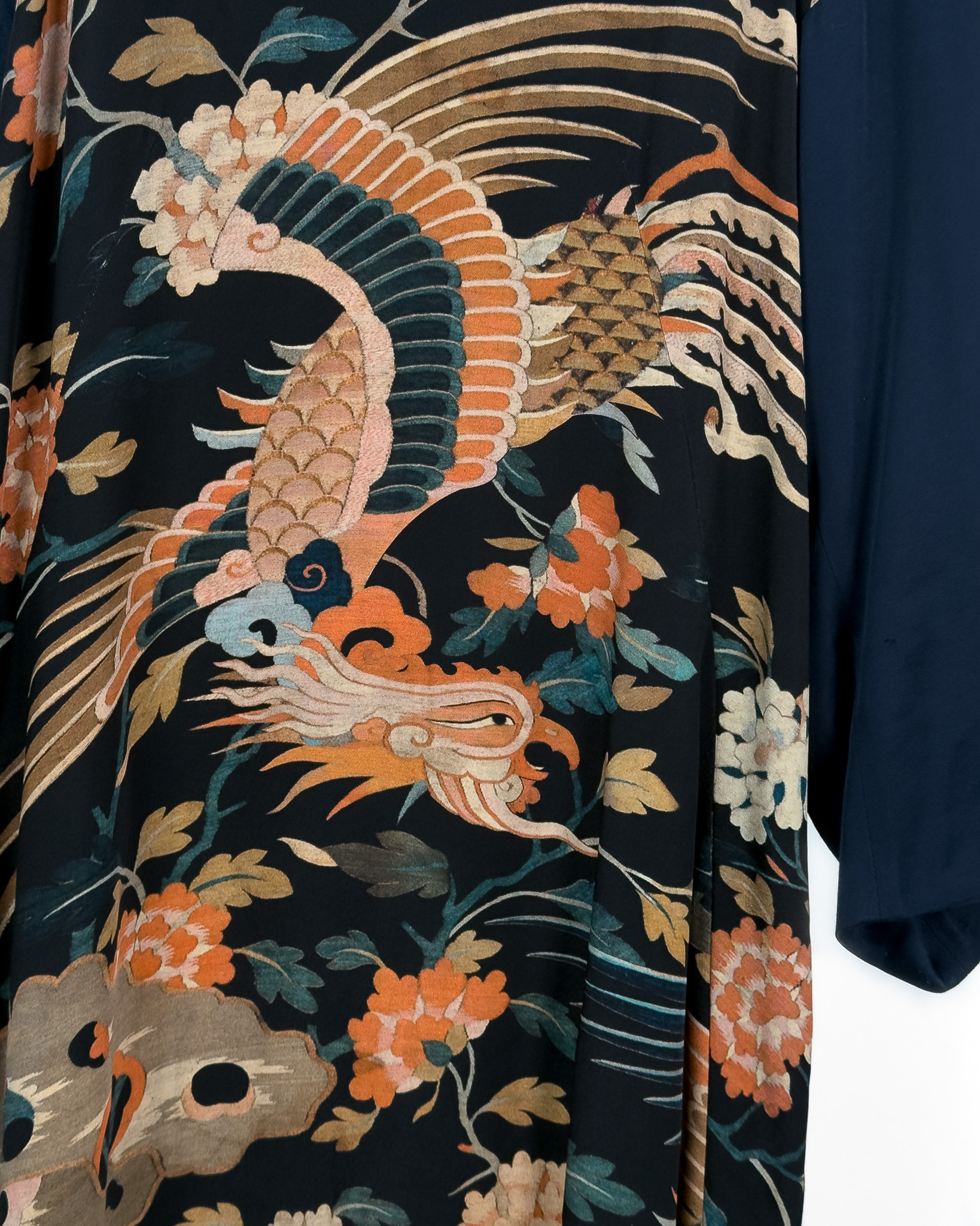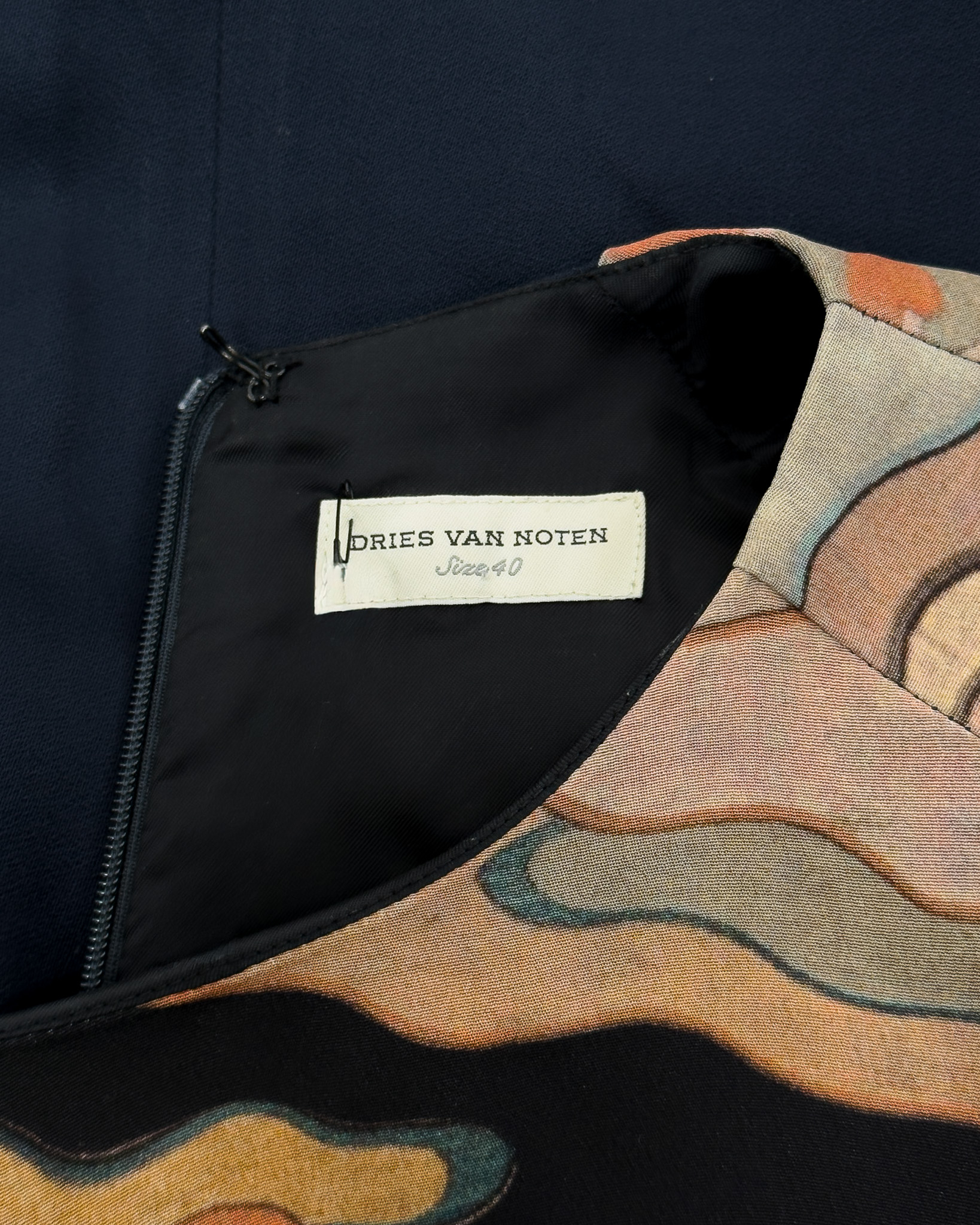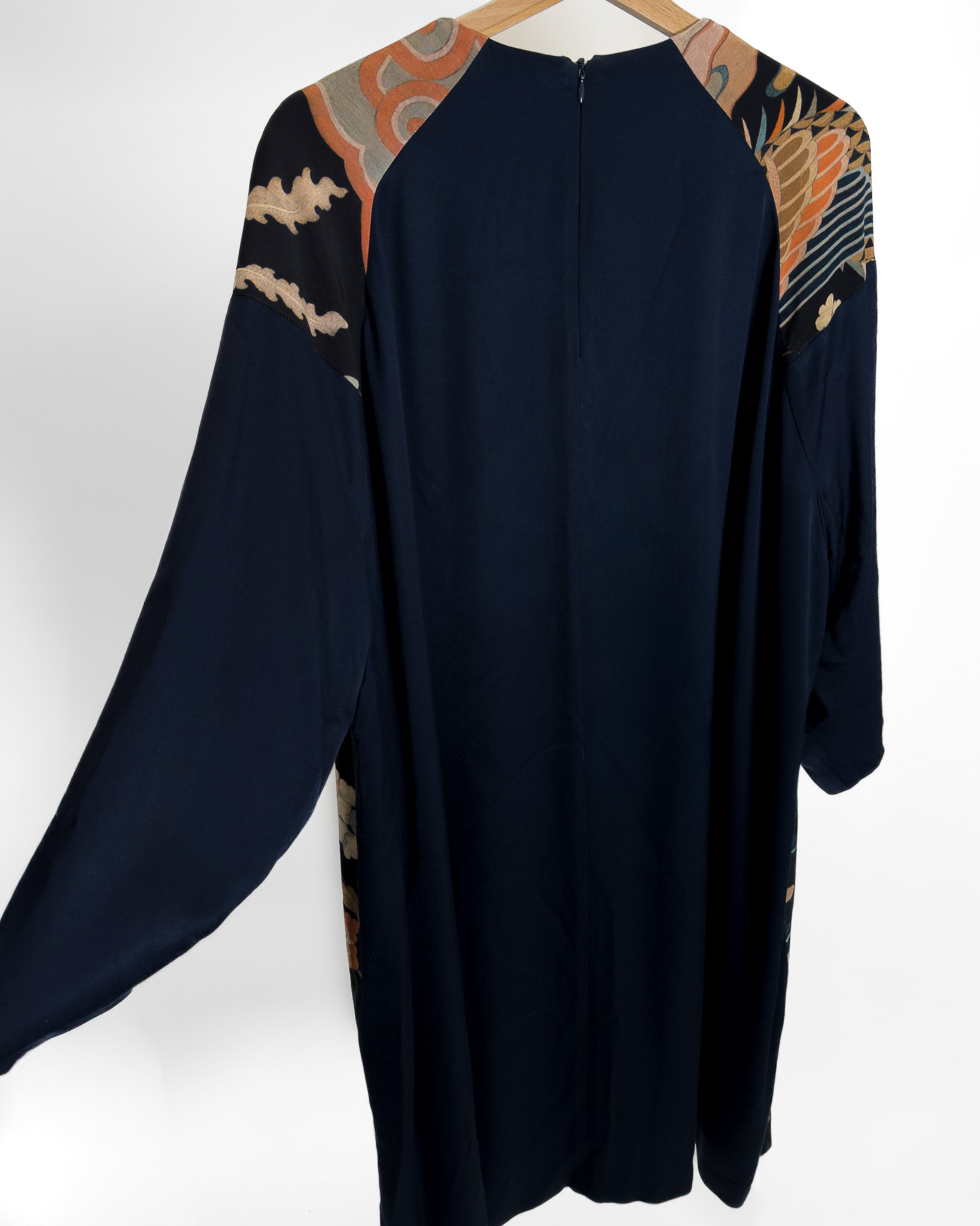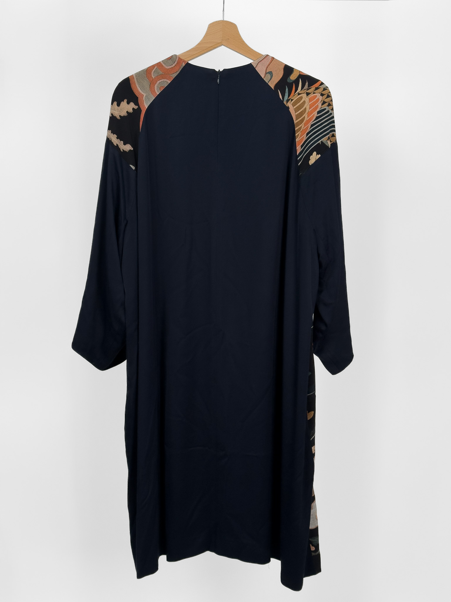 "Granatowa jedwabna sukienka ozdobiona wielobarwnym wzorem w odcieniach różu, pomarańczu oraz beżu, długość za kolano, prosty krój, obniżona linia ramion, długi rękaw, zaokrąglony dekolt, zapinana w tylnej części na suwak oraz haftkę, podszewka. Stan bardzo dobry. Rozmiar z metki 40. Skład: 100% jedwab. Wymiary: szerokość mierzona od pachy do pachy 63cm, długość całkowita 96cm."