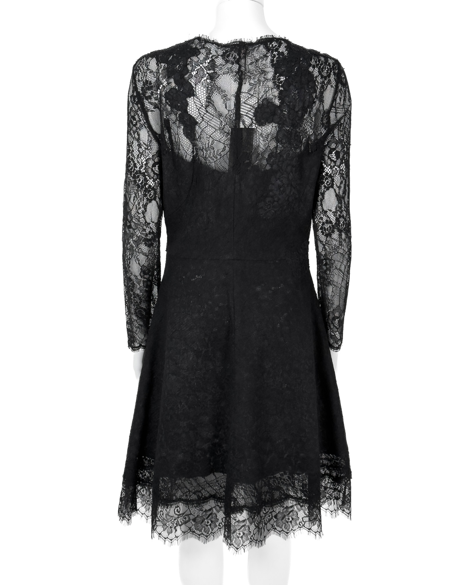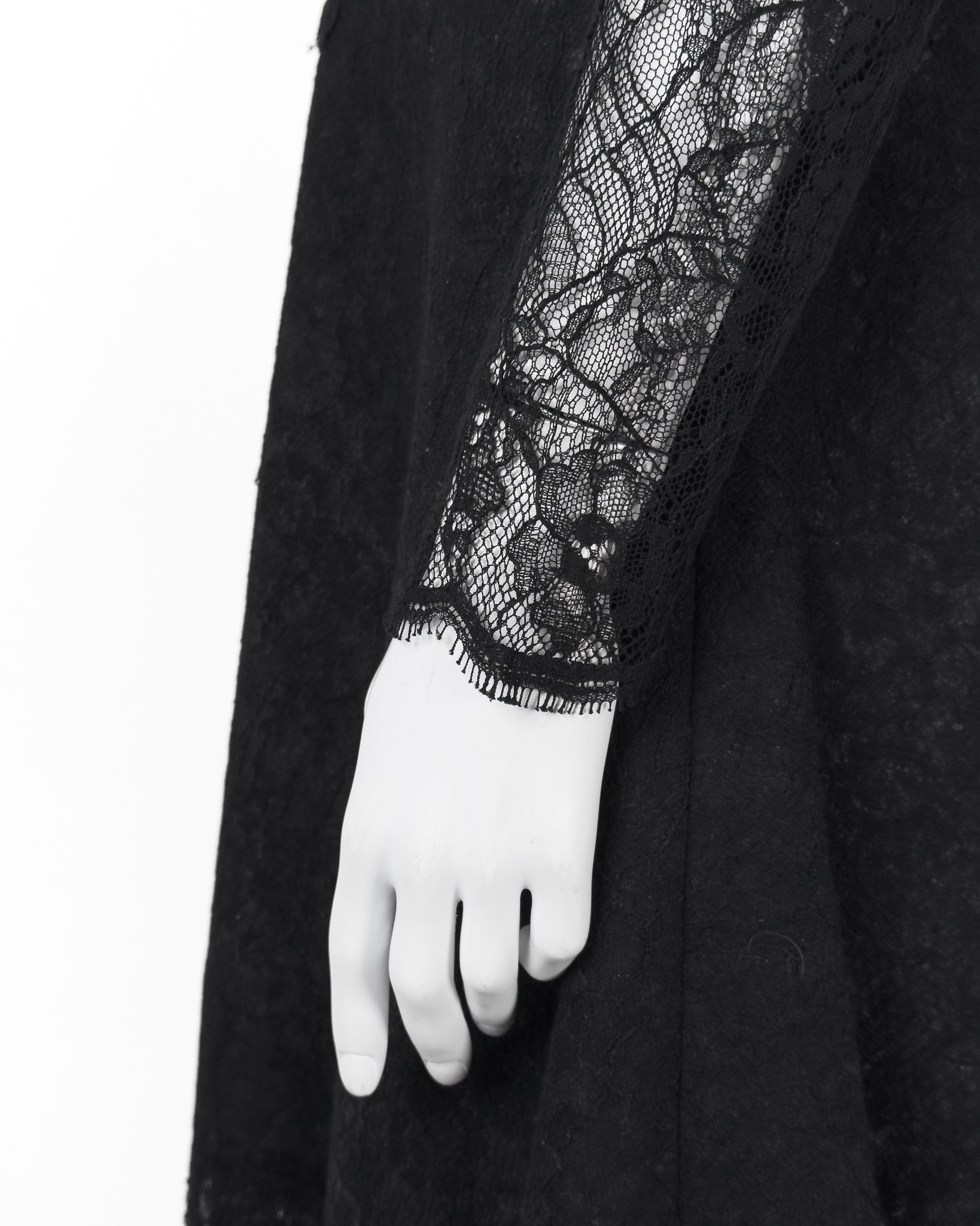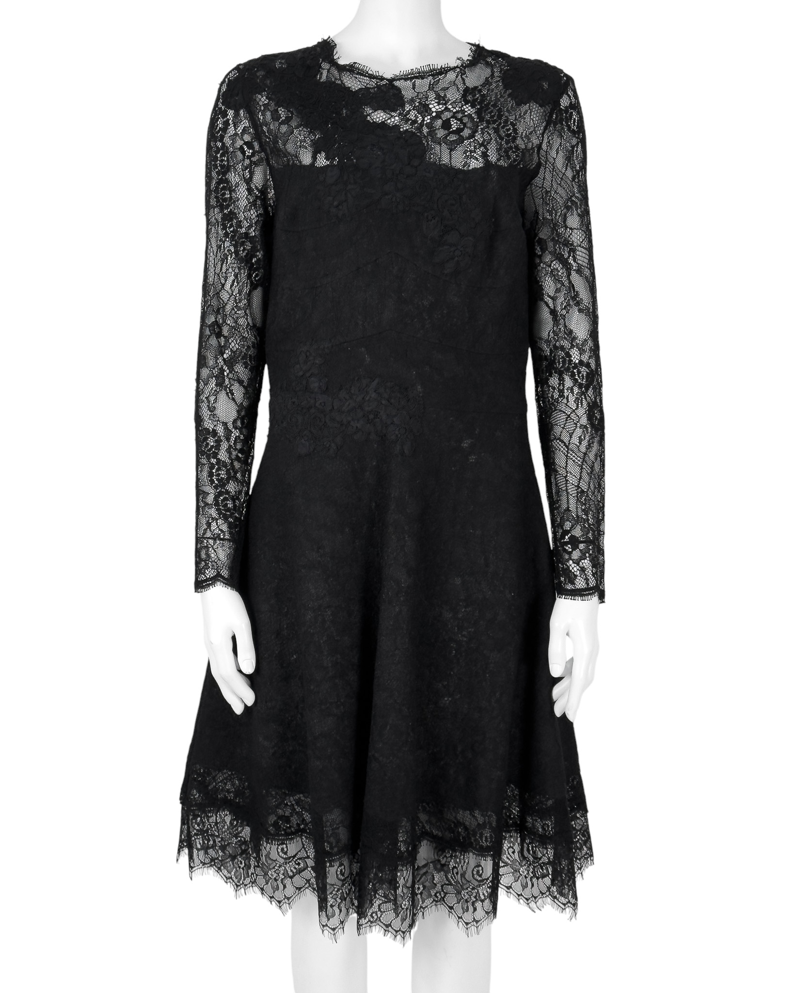 "Czarna sukienka z długim rękawem, koronkowa. Posiada okrągły dekolt i przeszycia na materiale w okolicach talii, lekko rozkloszowana ku dołowi. Zapinana na boczny, kryty zamek. Sukienka podszyta jest podwójnym materiałem. Nowa z metką. Skład: 94% bawełna, 6% poliamid. Rozmiar z metki IT48. Wymiary: szerokość mierzona od pachy do pachy 49cm, długość całkowita 107cm,"
