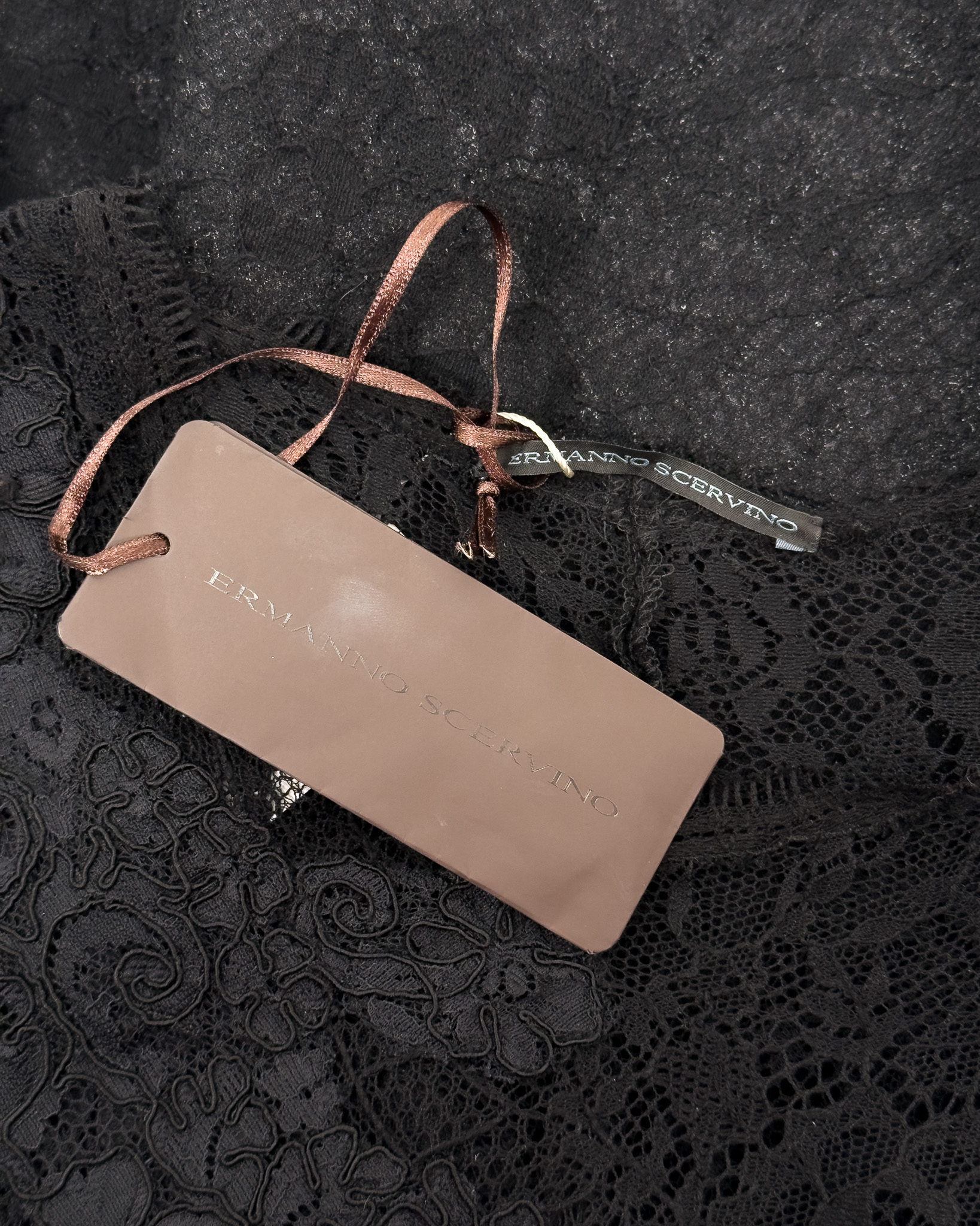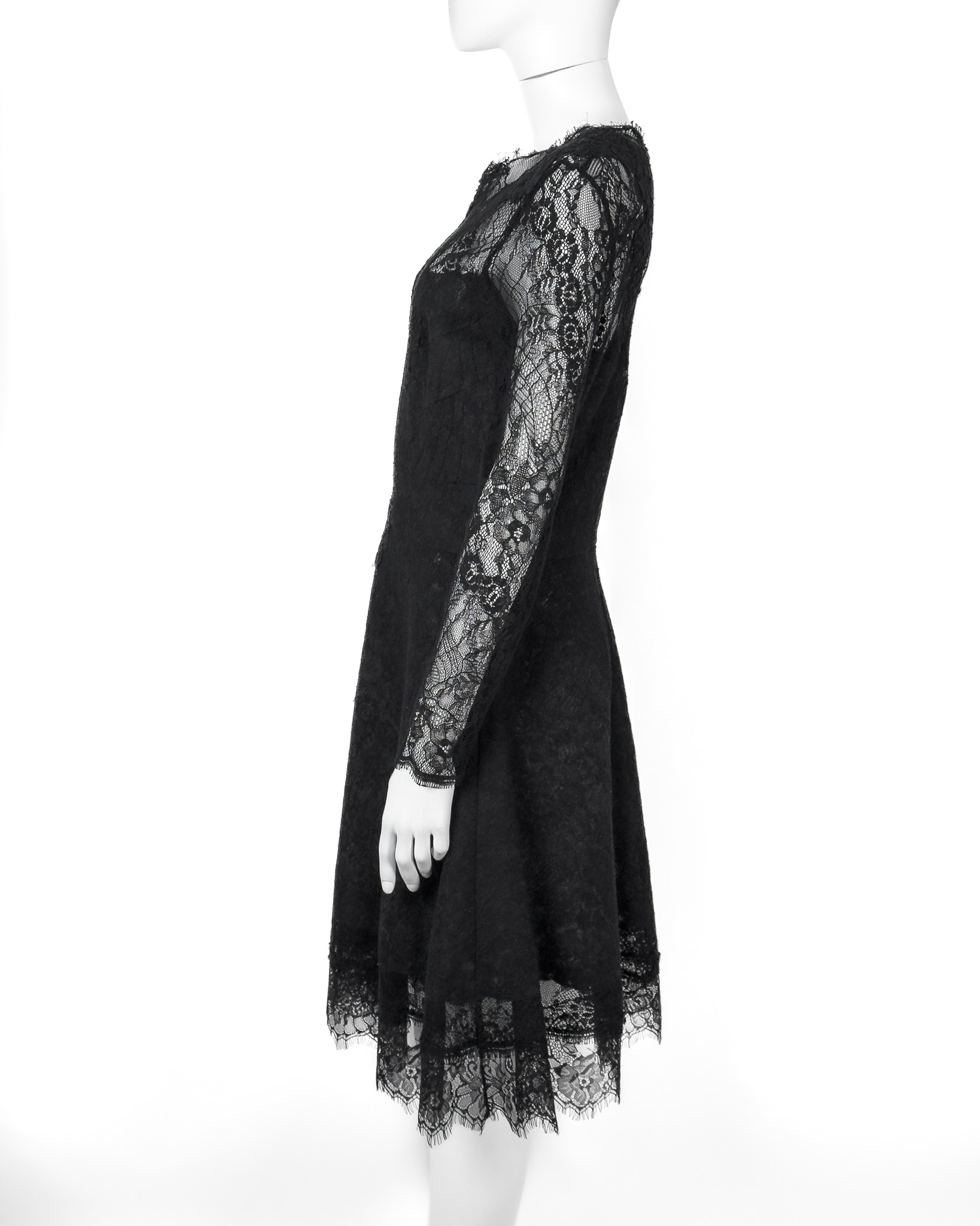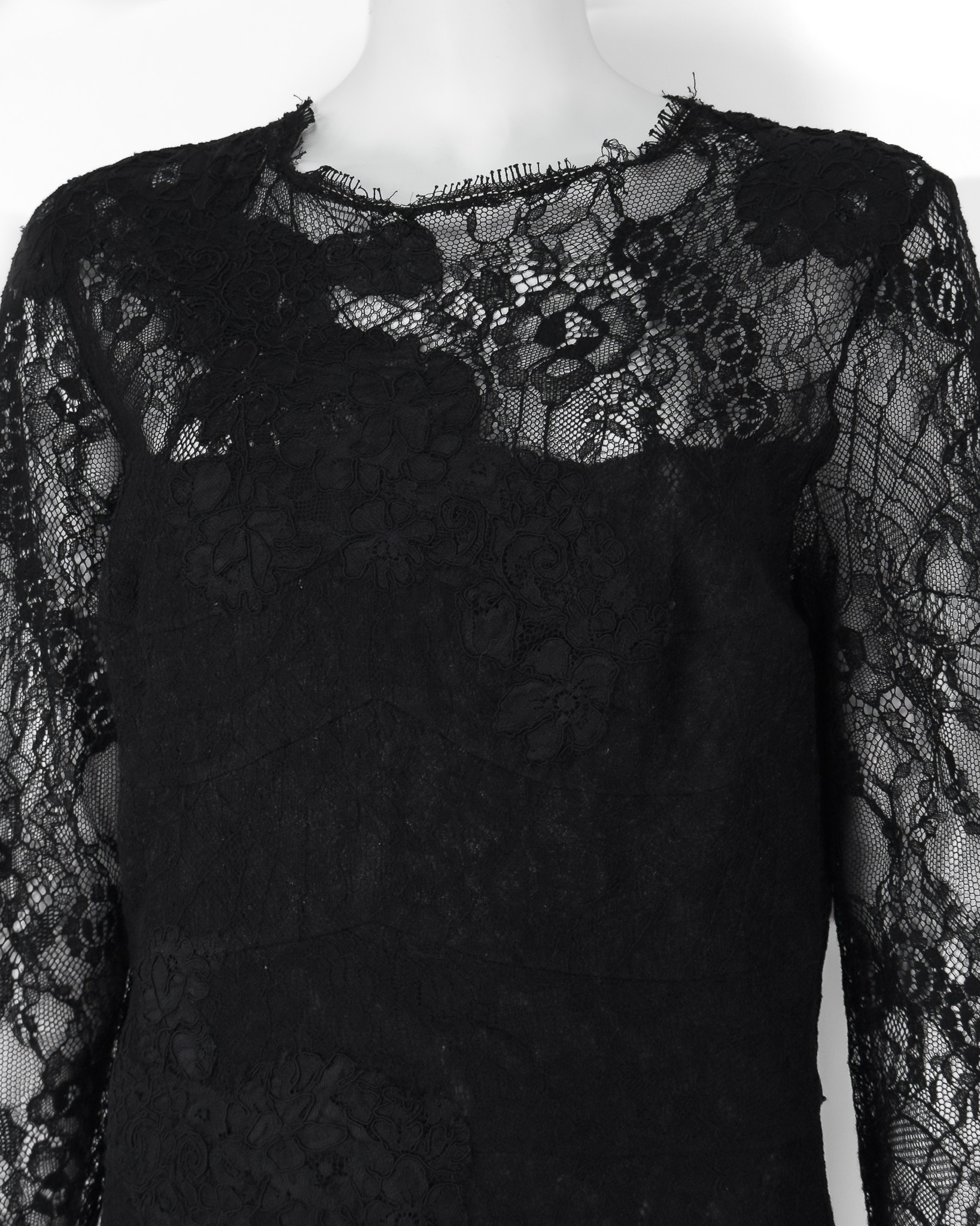 "Czarna sukienka z długim rękawem, koronkowa. Posiada okrągły dekolt i przeszycia na materiale w okolicach talii, lekko rozkloszowana ku dołowi. Zapinana na boczny, kryty zamek. Sukienka podszyta jest podwójnym materiałem. Nowa z metką. Skład: 94% bawełna, 6% poliamid. Rozmiar z metki IT48. Wymiary: szerokość mierzona od pachy do pachy 49cm, długość całkowita 107cm,"