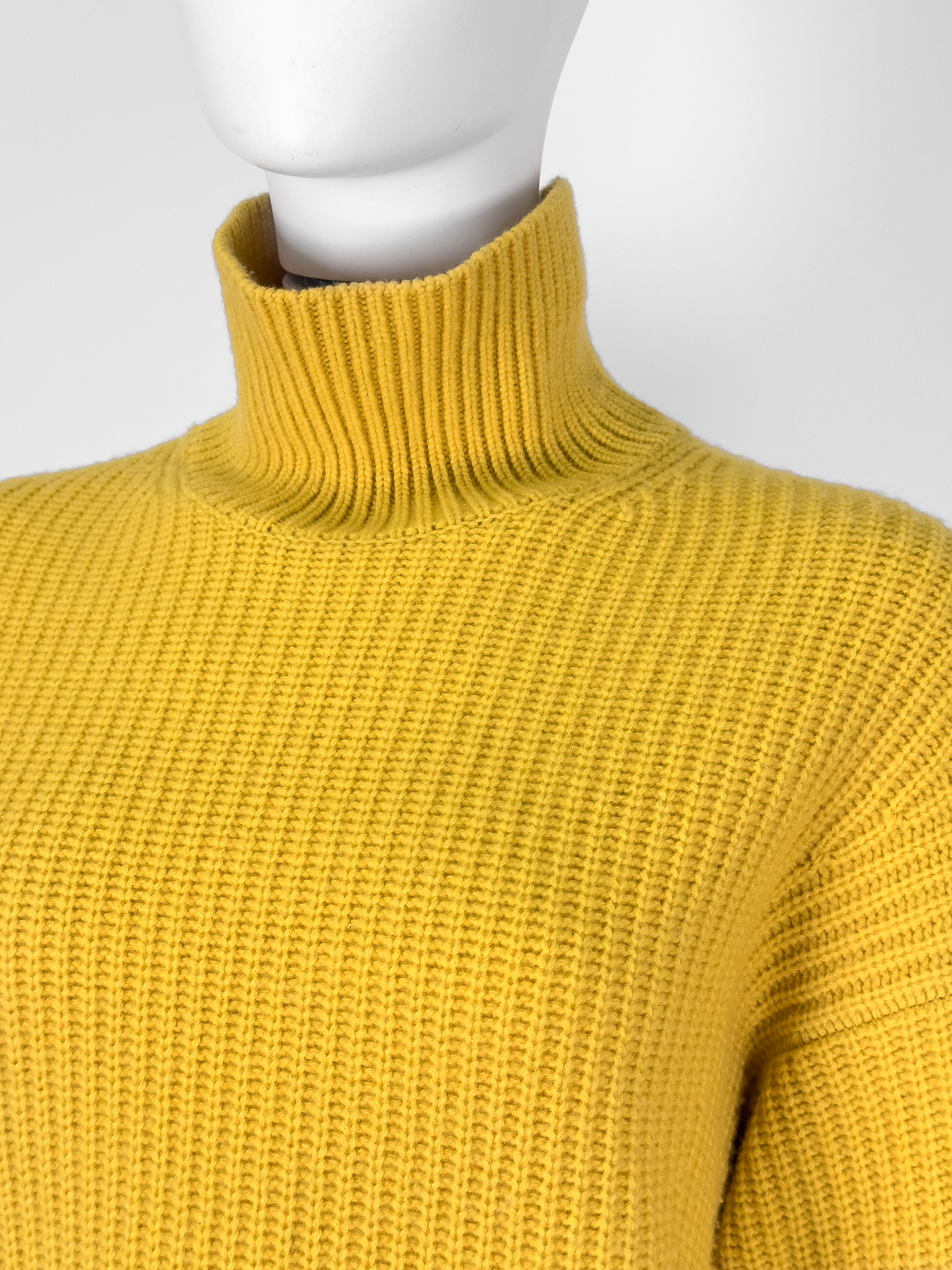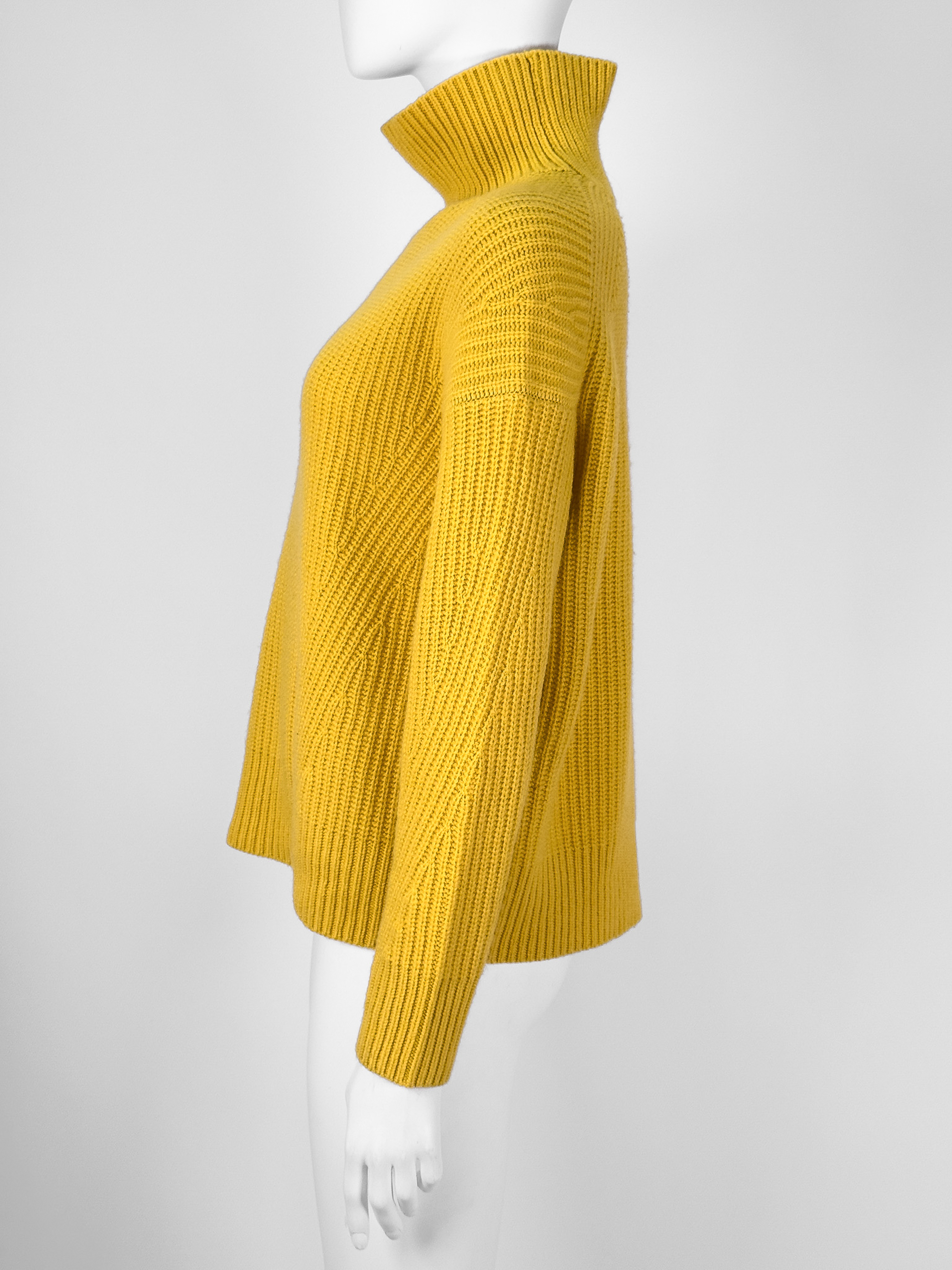 "Kaszmirowy musztardowy klasyczny golf, prążkowany, wykończony ściągaczem. Rozmiar z metki XS. Skład: 100% kaszmir. Wymiary: szerokość mierzona od pachy do pachy 57cm, długość całkowita 59,5cm."