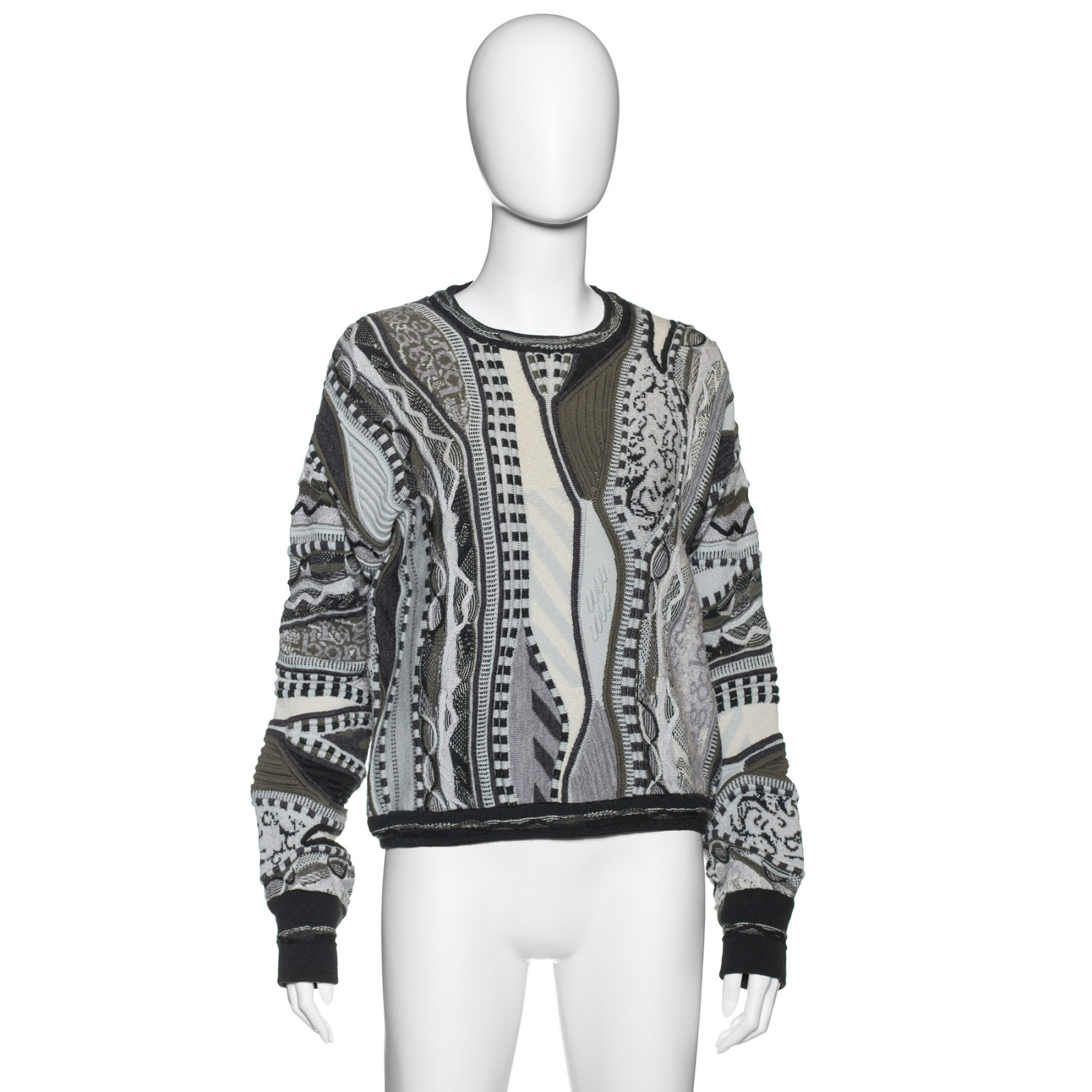 "Sweter w wielokolorowy splot (khaki-szary-biały). Rozmiar S, Skład: 100% wełna merino. Wymiary: szerokość 51 cm. długość 55 cm. dł. rękawów 63"