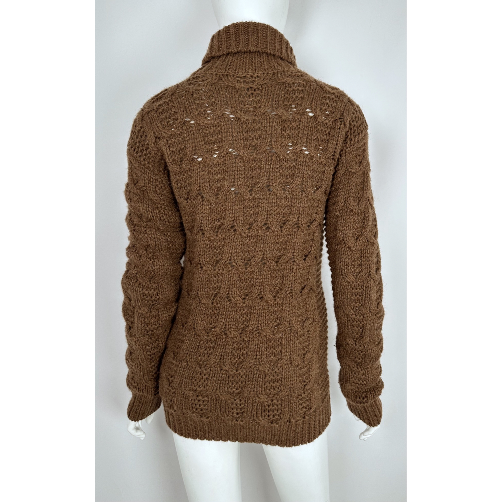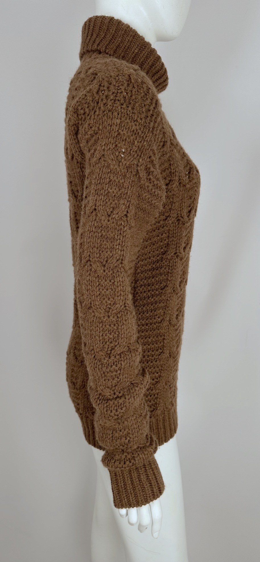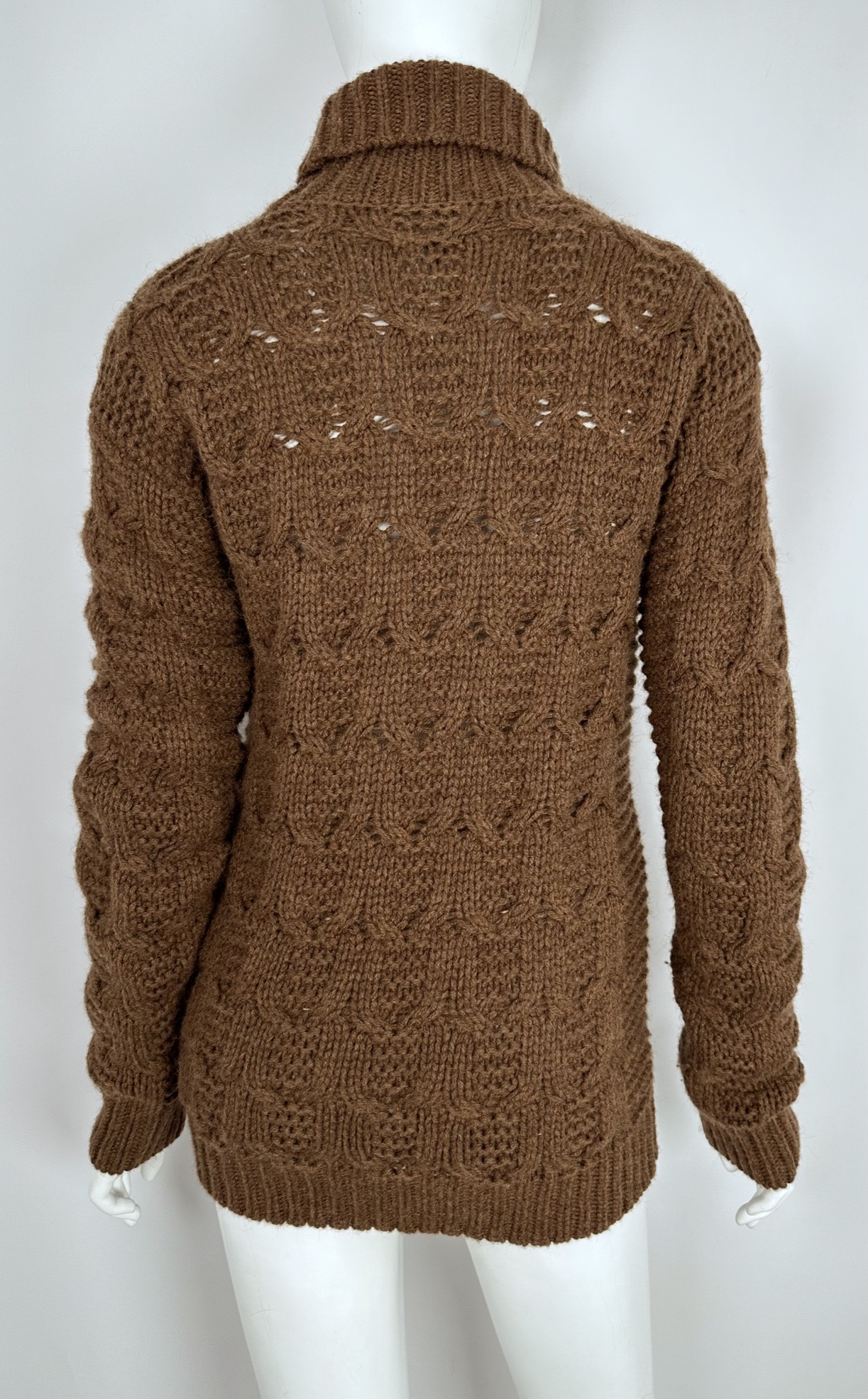 "Brązowy sweter z naturalnego włosia wielbłąda. Ma wyróżniający splot w łódkę. Rękawy oraz dół swetra wykończone są elastycznym ściągaczem. Przy szyi ma wywijany komin. Stan: bardzo dobry. Rozmiar: M Skład: 100% włosie wielbłądzie. Wymiary: dł. (mierzona od linii karku): 65 cm., wys. kołnierza: 17 cm., szer. (mierzona od pachy do pachy): 48 cm, szer. rękawa (mierzona na wys. pachy): 17 cm., szer. (mierzona w pasie): 42 cm., dł. rękawa (mierzona od pachy): 60 cm."