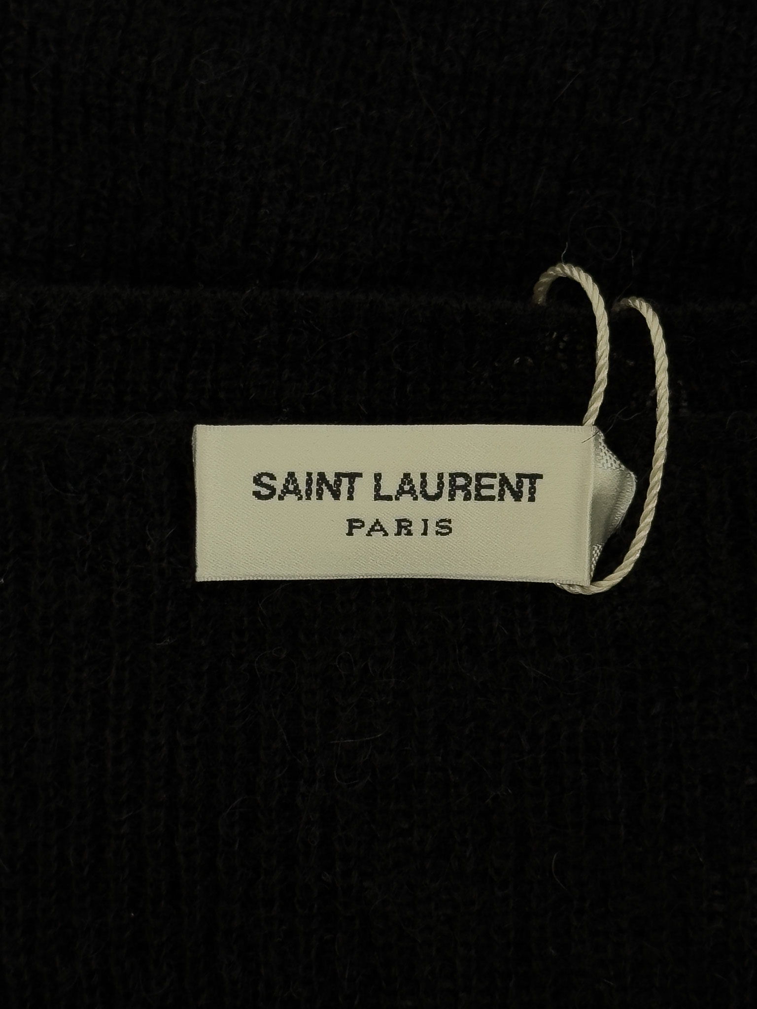 "Czarny cienki sweter, poduszki na ramionach, głęboki dekolt w serek, krój oversize. Rozmiar z metki XS. Skład: 70% alpaka, 30% poliamid. Wymiary: szerokość mierzona od pachy do pachy 59cm, długość całkowita 64cm."