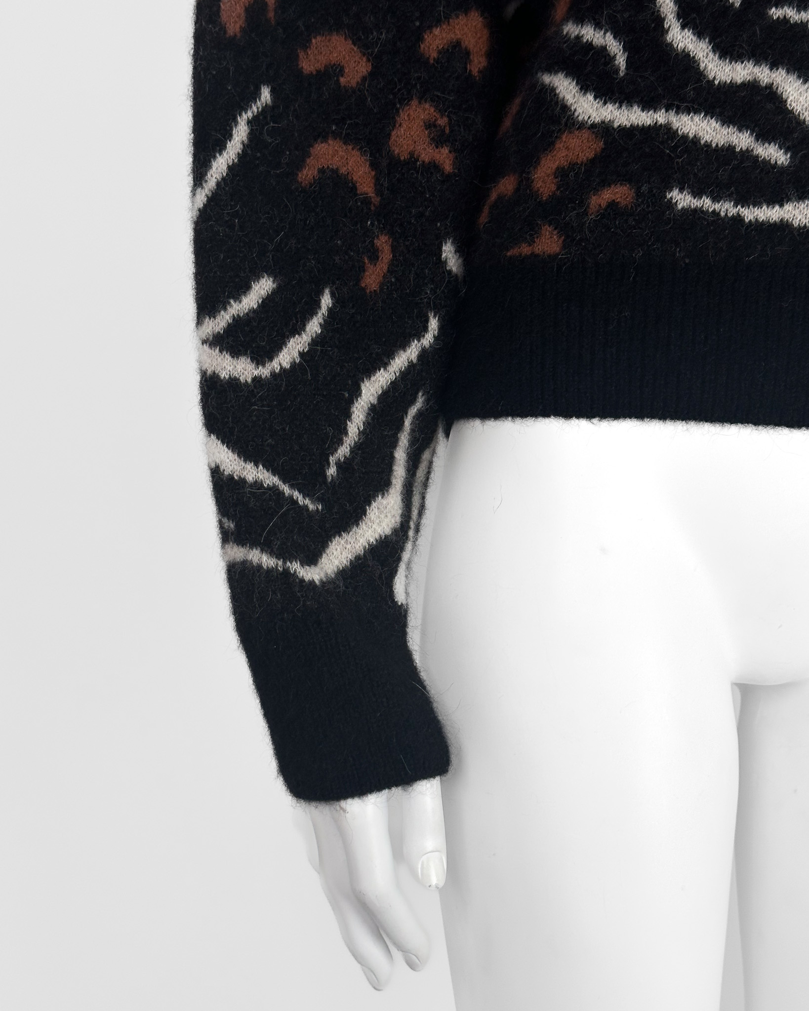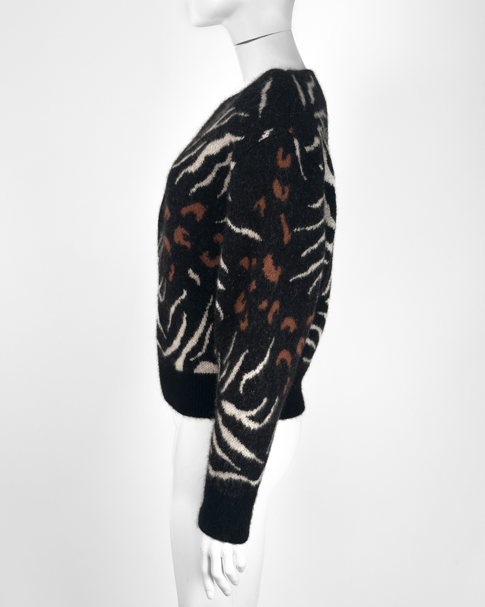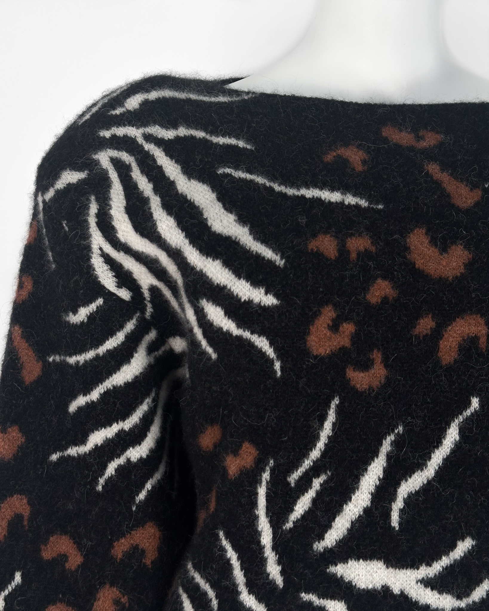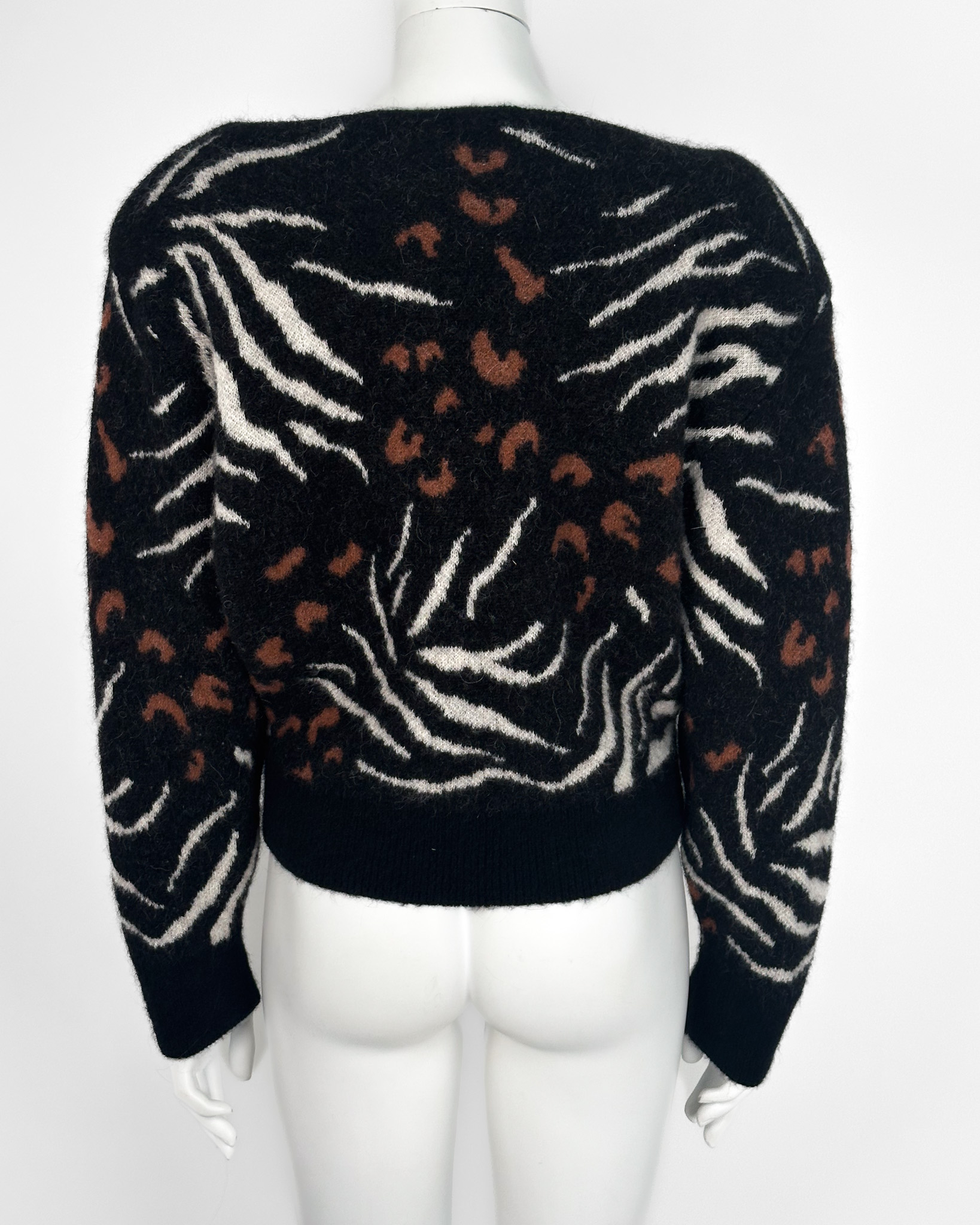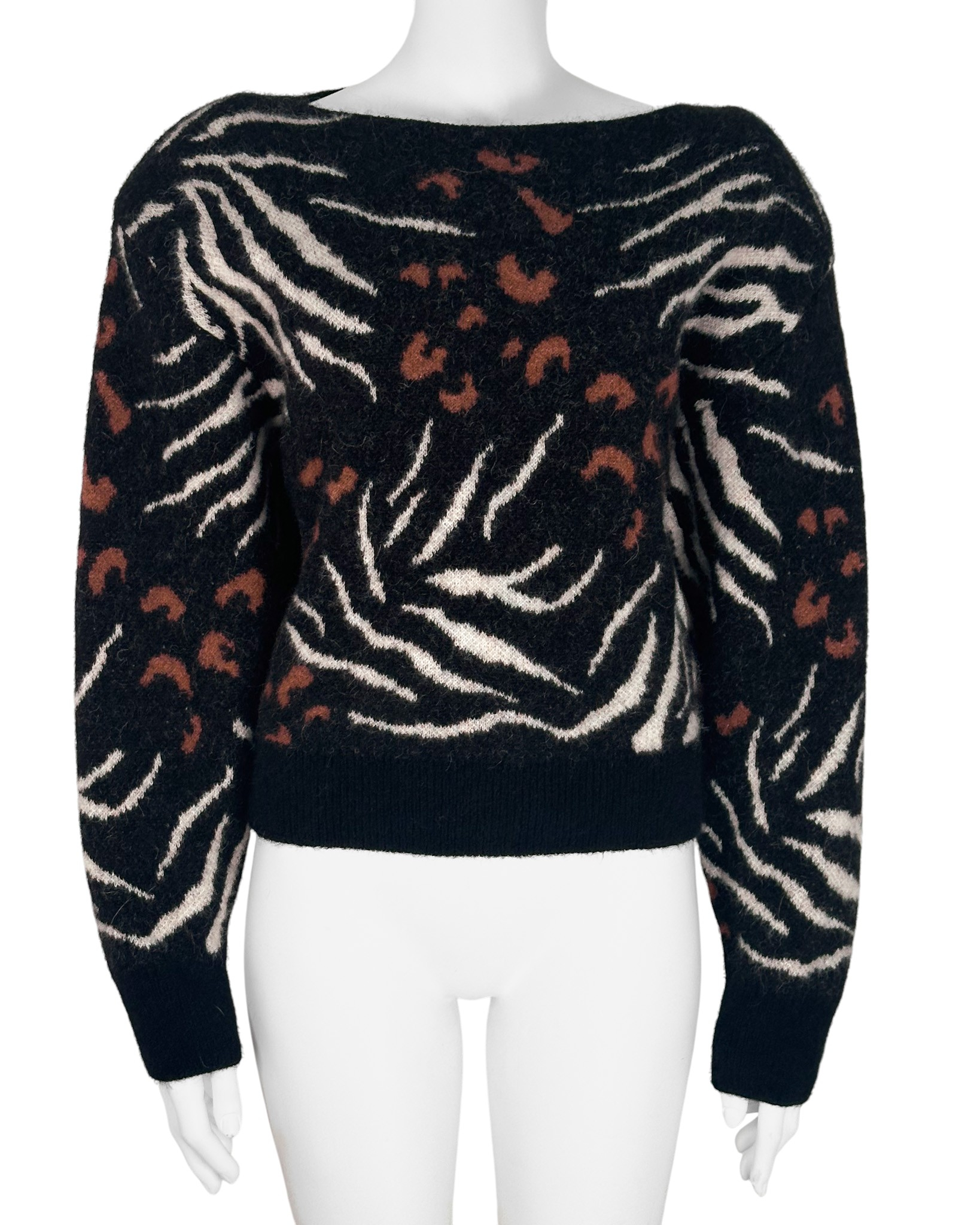 "Czarny sweter, motyw zwierzęcy, poduszki na ramionach, nietoperzowy rękaw, 63% alpaka 30% nylon 7% wełna merino, rozmiar M