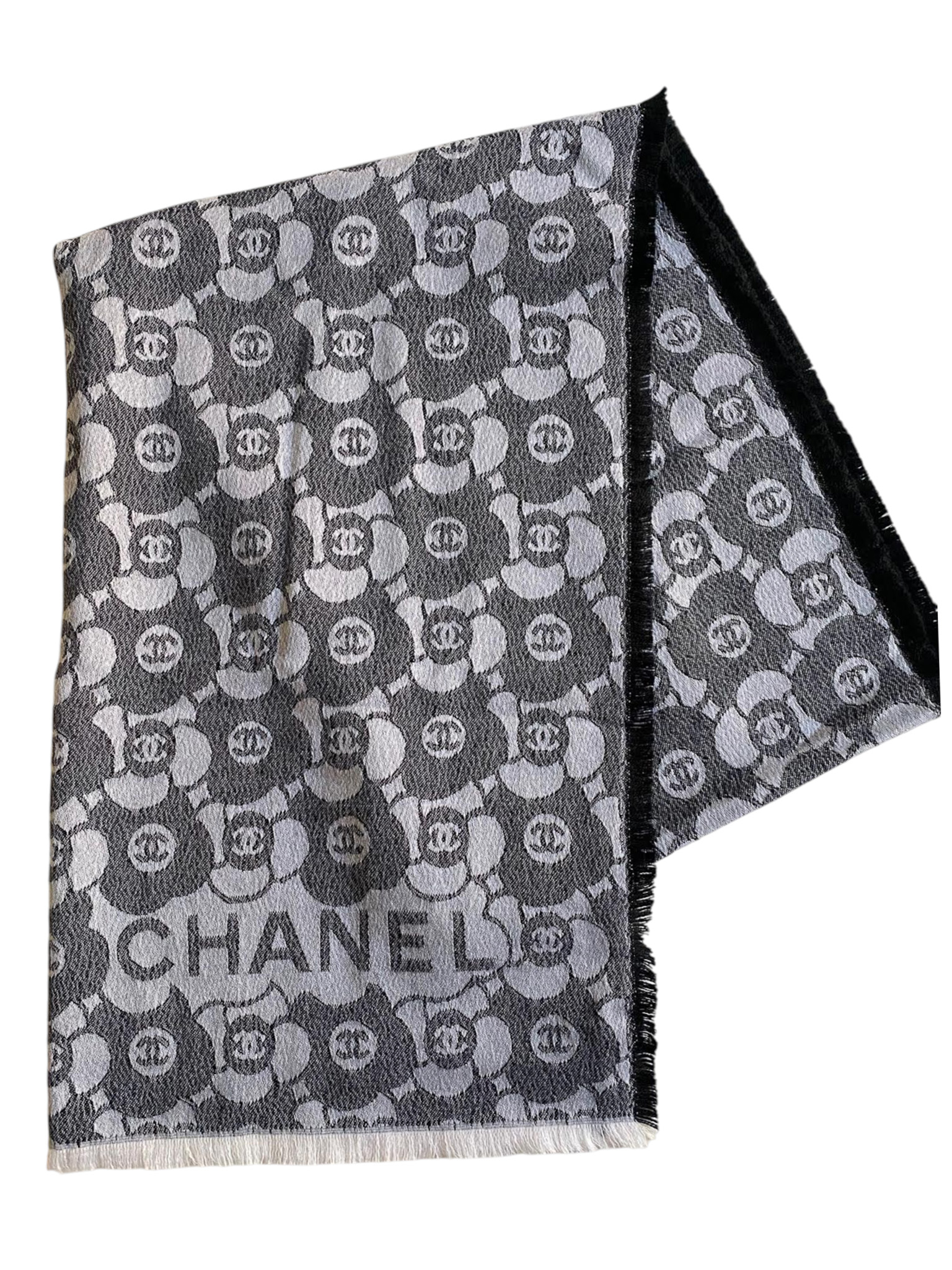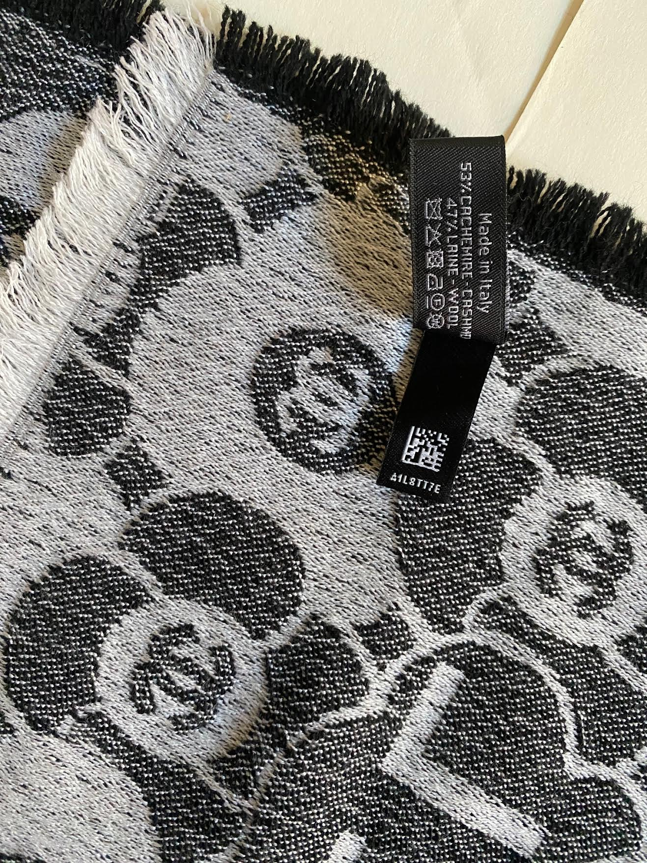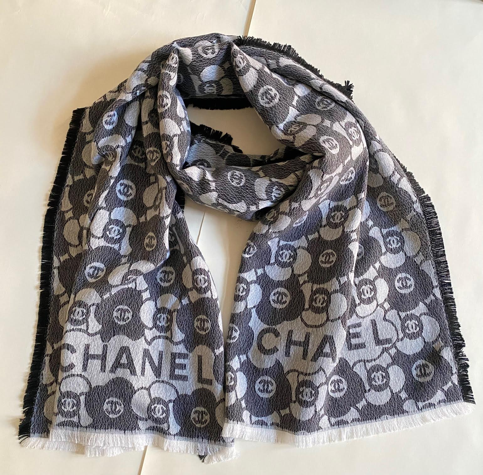 "Kaszmirowo-wełniany szal w odcieniach czerni, bieli oraz szarego, w zestawie z pudełkiem. Stan nowy. Wymiary: 180 cm x 65 cm. Skład: 53% kaszmir , 47% wełna."