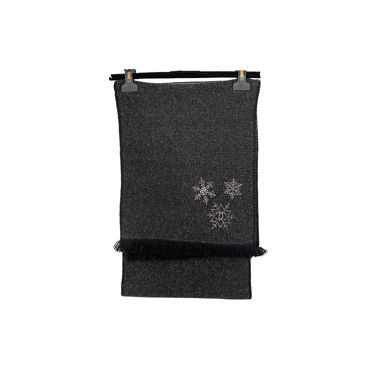 "szary połyskujący szalik, ozdobiony cyrkoniami w kształcie śnieżynek, obszyty drobnymi frędzelkami, brak metki ze składem. Wymiary: 190 cm x 32 cm"