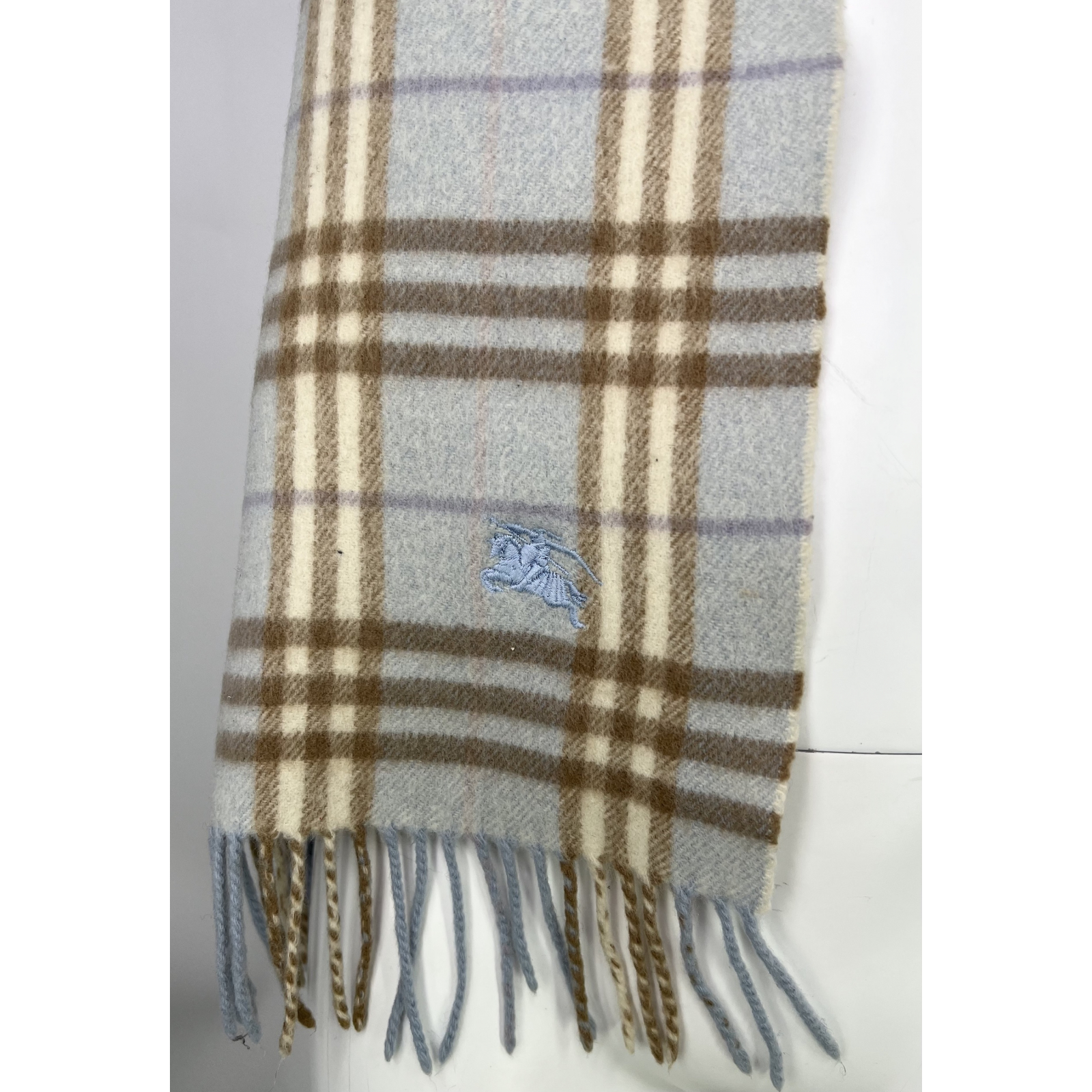 "szalik wełniany w kratkę błękitno-beżowo-fioletowo-ecru, skład: 52% lamb wool, 43% merino, 5% kaszmir, wymiary: szerokość 26 cm, długość 158 cm"