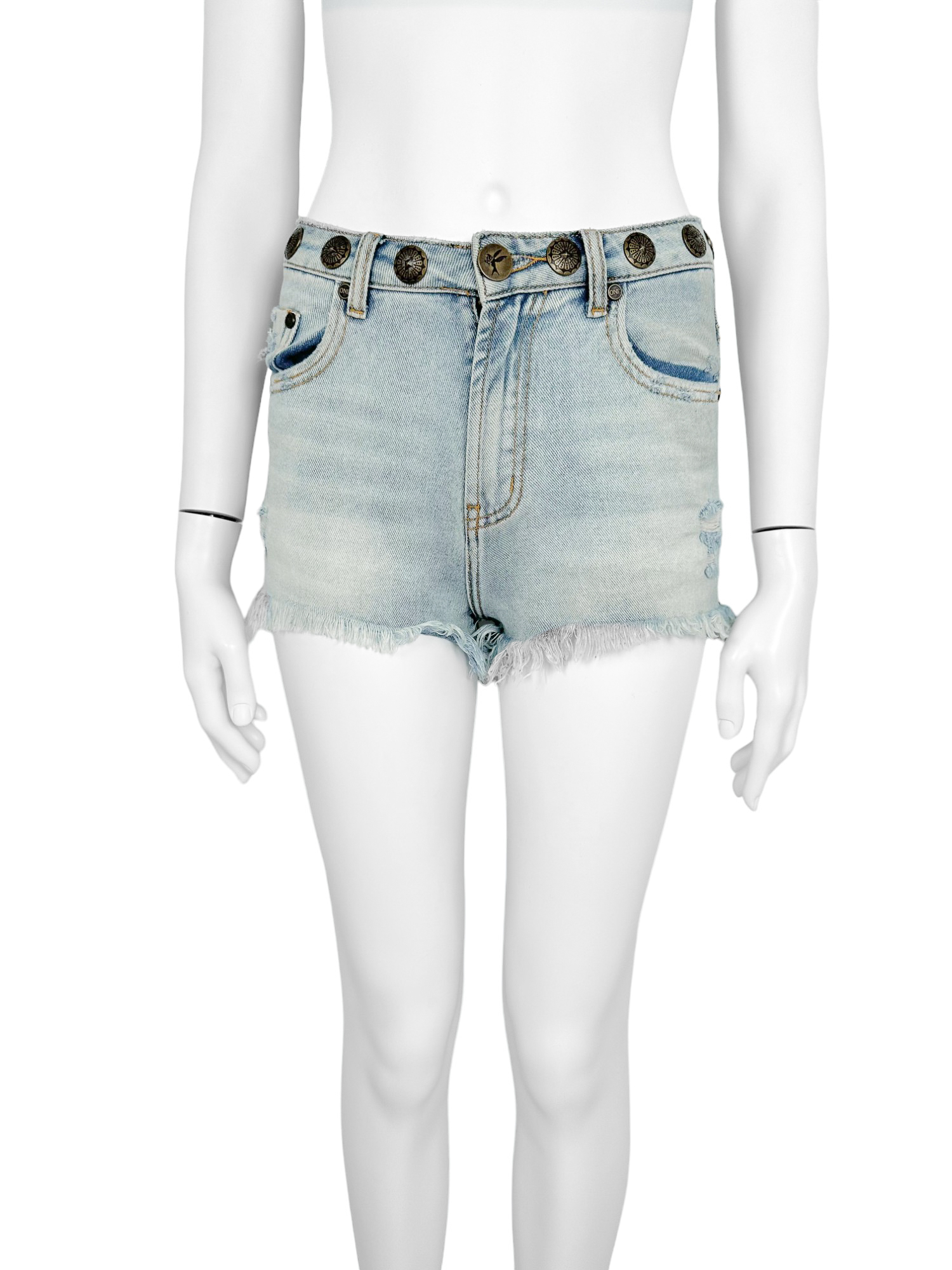 "Jasne jeansowe szorty, postrzępione, wysoki stan, rozmiar 24. W pasie duże złote nity. Wymiary: szerokość w pasie 35cm, długość całkowita 36cm."