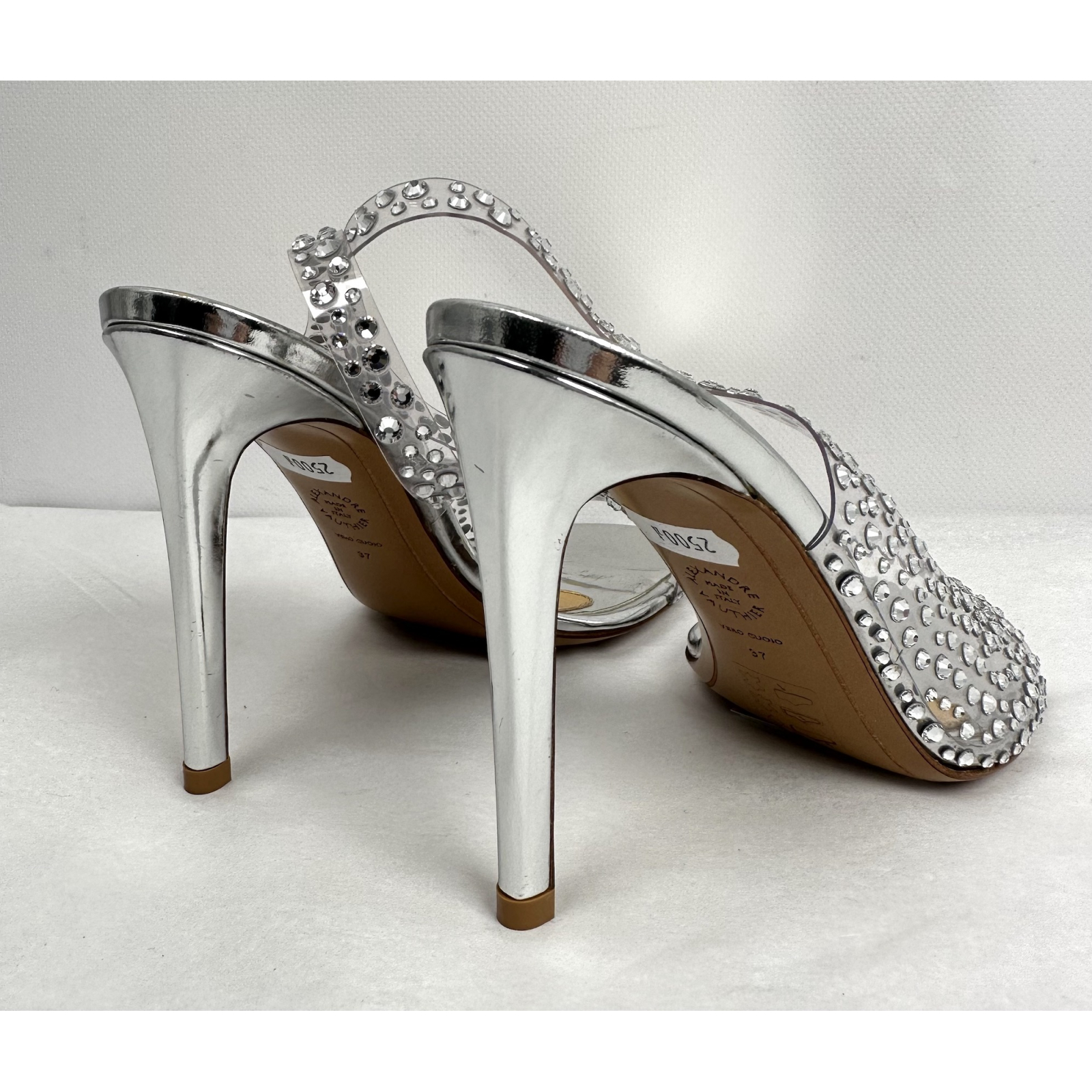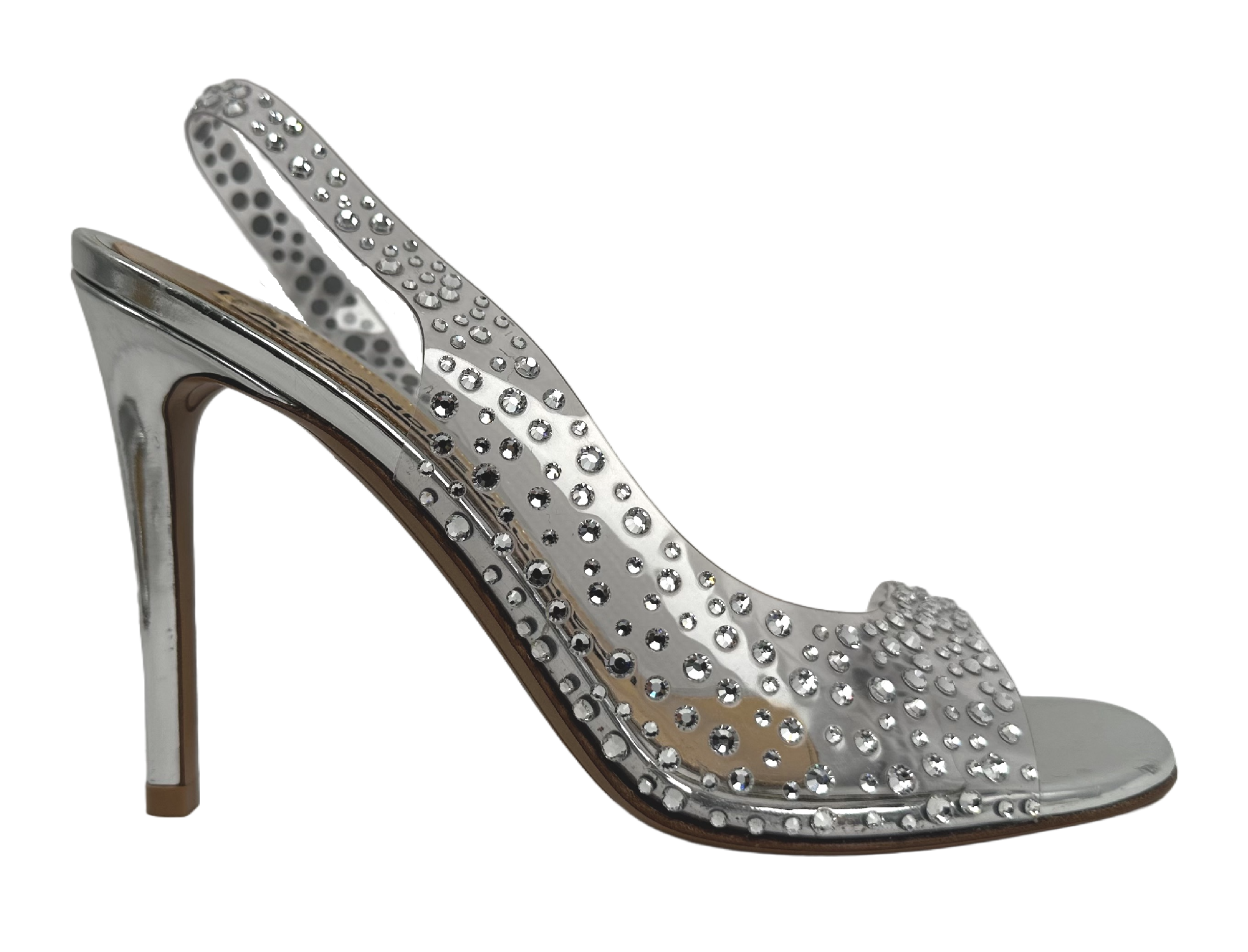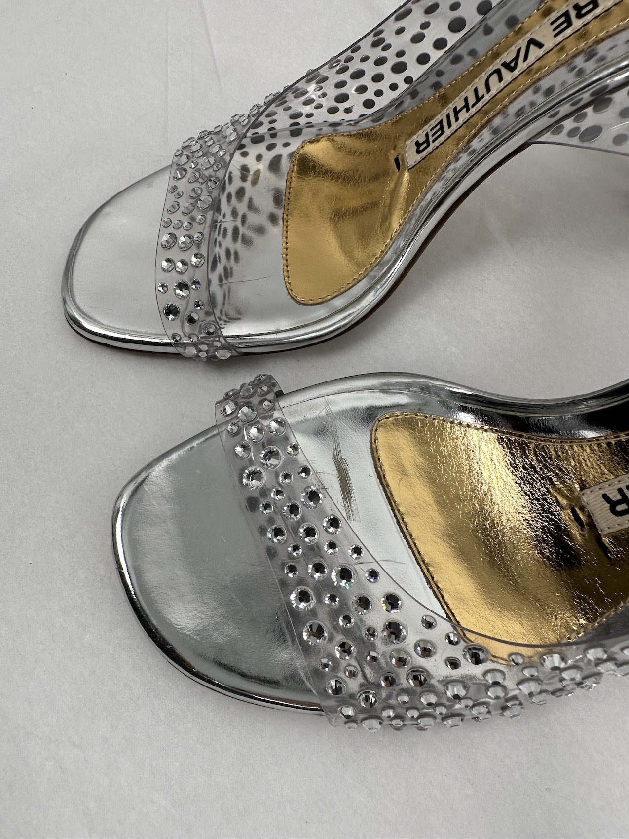 "srebrne szpilki wysadzane ozdobnymi kryształami, odkryta pięta oraz palce, złoto - srebrna wkładka. Rozmiar 37. Stan bardzo dobry, obcasy posiadają drobne rysy."