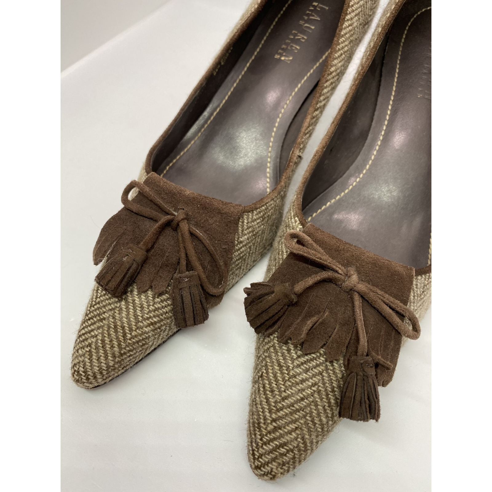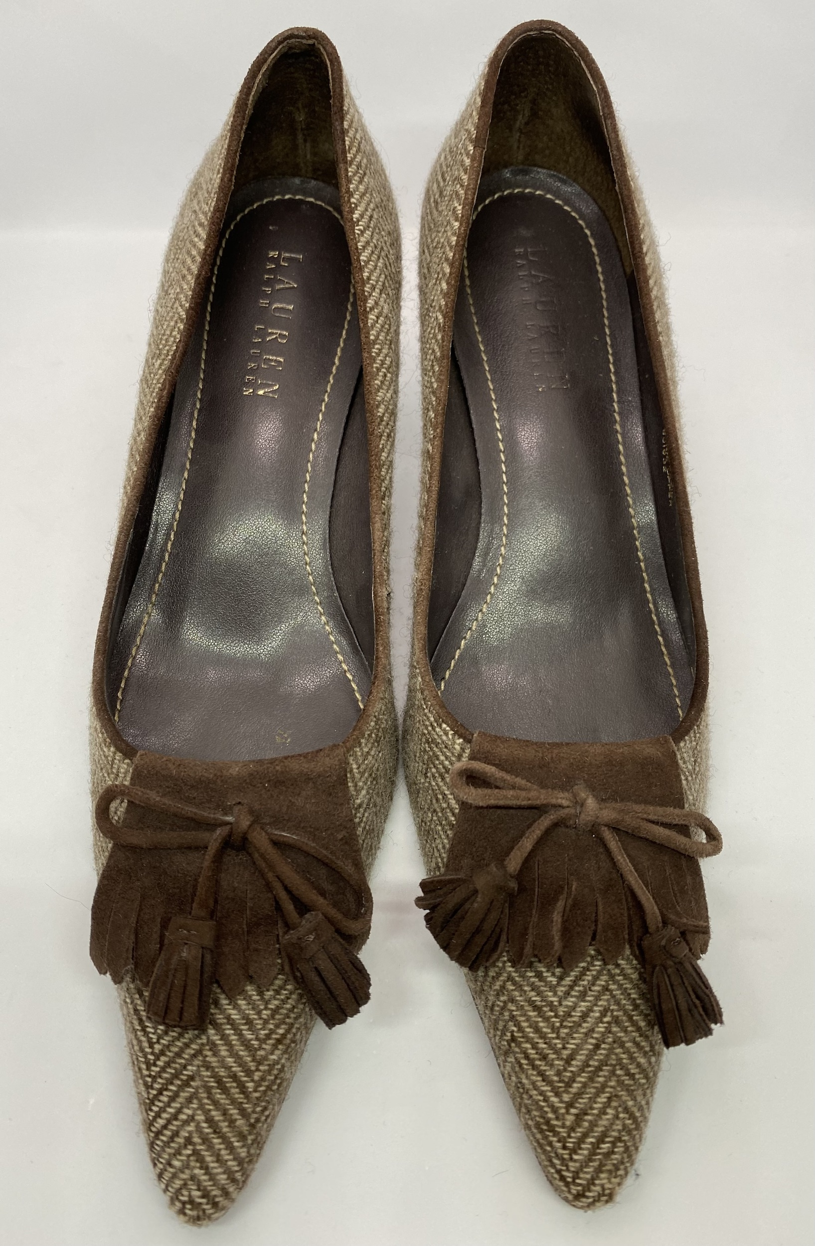"pantofle w szpic na niskim obcasie, wykonane z wełny, w brązowo-beżową jodełkę, na przodzie zamszowe frędzle i chwost, rozmiar 7,5. Wysokość obcasa 7 cm."
