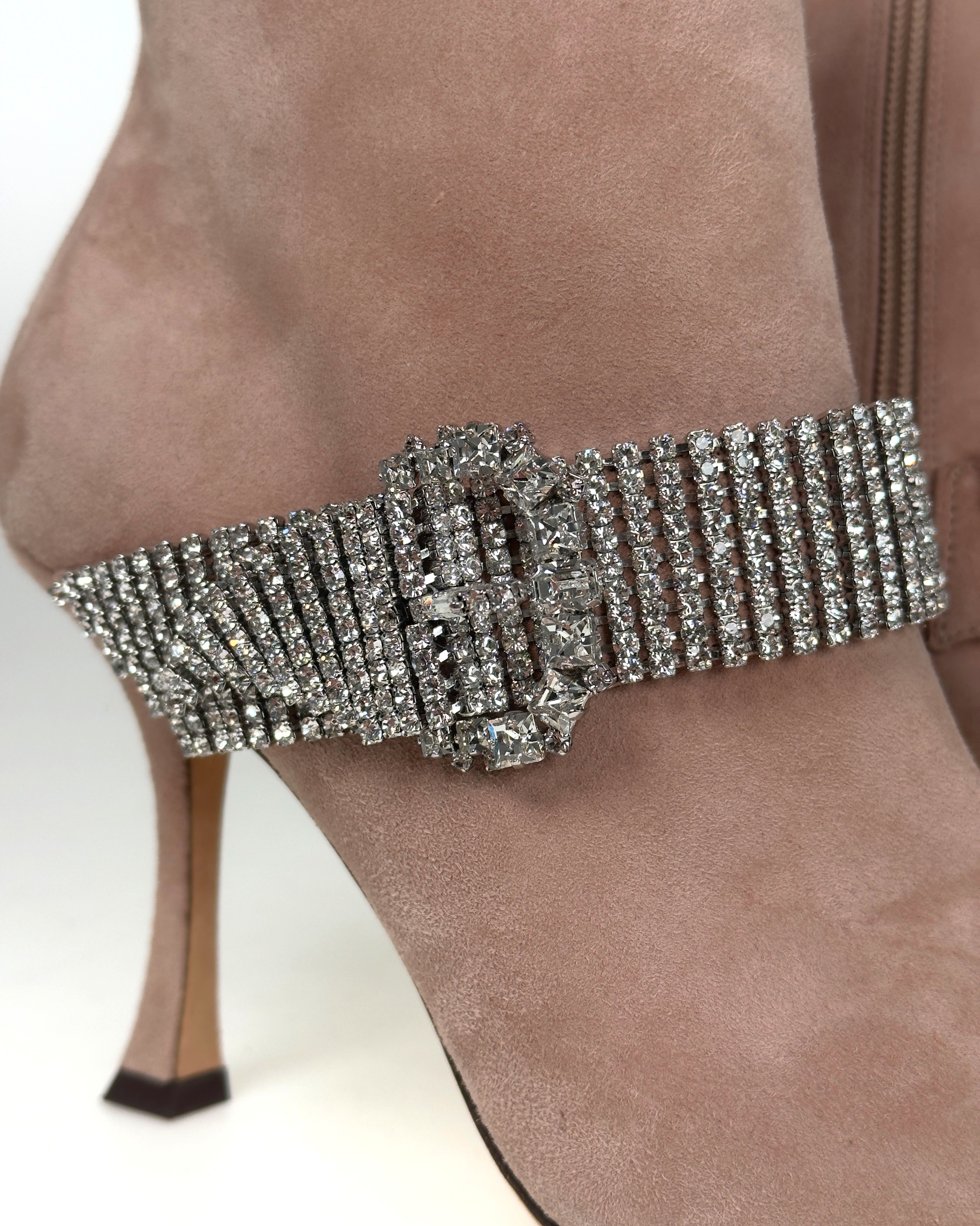 "Zamszowe szpilki w kolorze pudrowego różu, na szpilce, ozdobne klamry z kryształkami dookoła kostek. rozmiar 40. Stan bardzo dobry."
