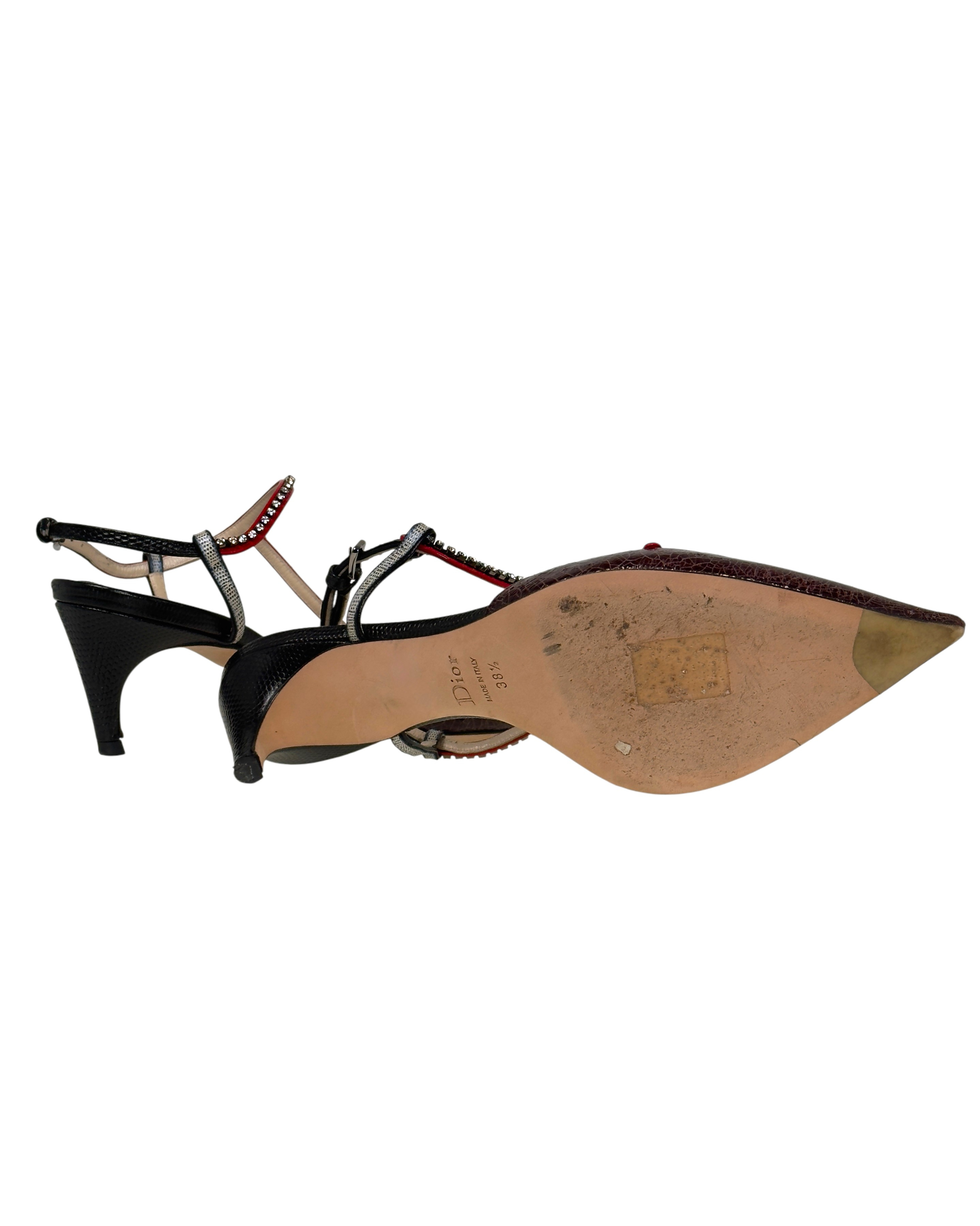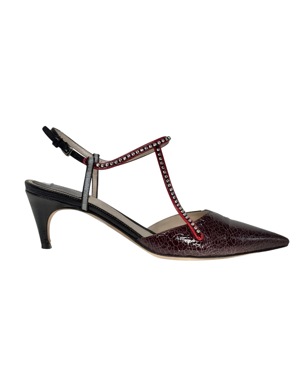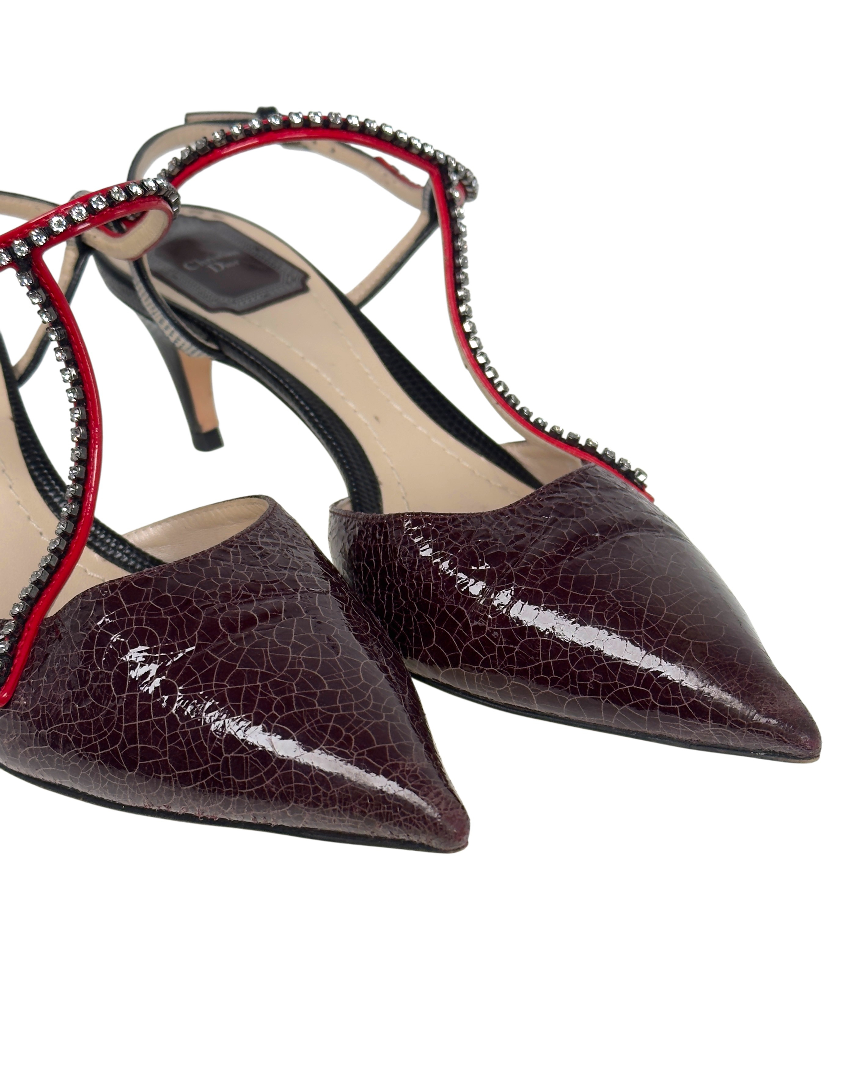 "Szpilki z odkrytą piętą, efekt spękanej lakierowanej skóry w kolorze burgundowym, asymetryczne cienkie paseczki w kolorze czerwony i czarnym, paski wysadzane lśniącymi kryształkami, regulowane zapięcie w kostce, obcas typu kaczuszka, rozmiar 38,5"