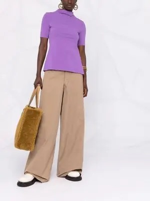 "Bawełniany fioletowy t-shirt z krótkim rękawem, dopasowany krój, regulowane wycięcie na plecach, półgolf, wykończony licznymi przeszyciami, złote detale. Rozmiar z metki M. Skład: 92% bawełna organiczna, 8% elastan. Wymiary: szerokość mierzona od pachy do pachy 42cm, długość całkowita 60cm."