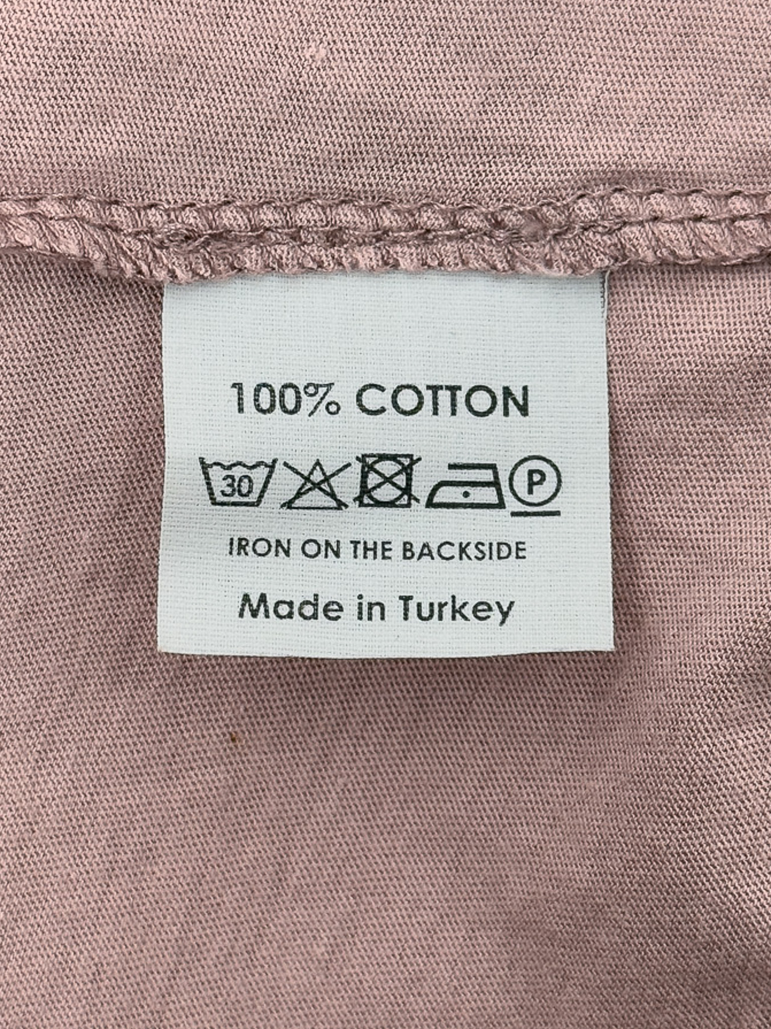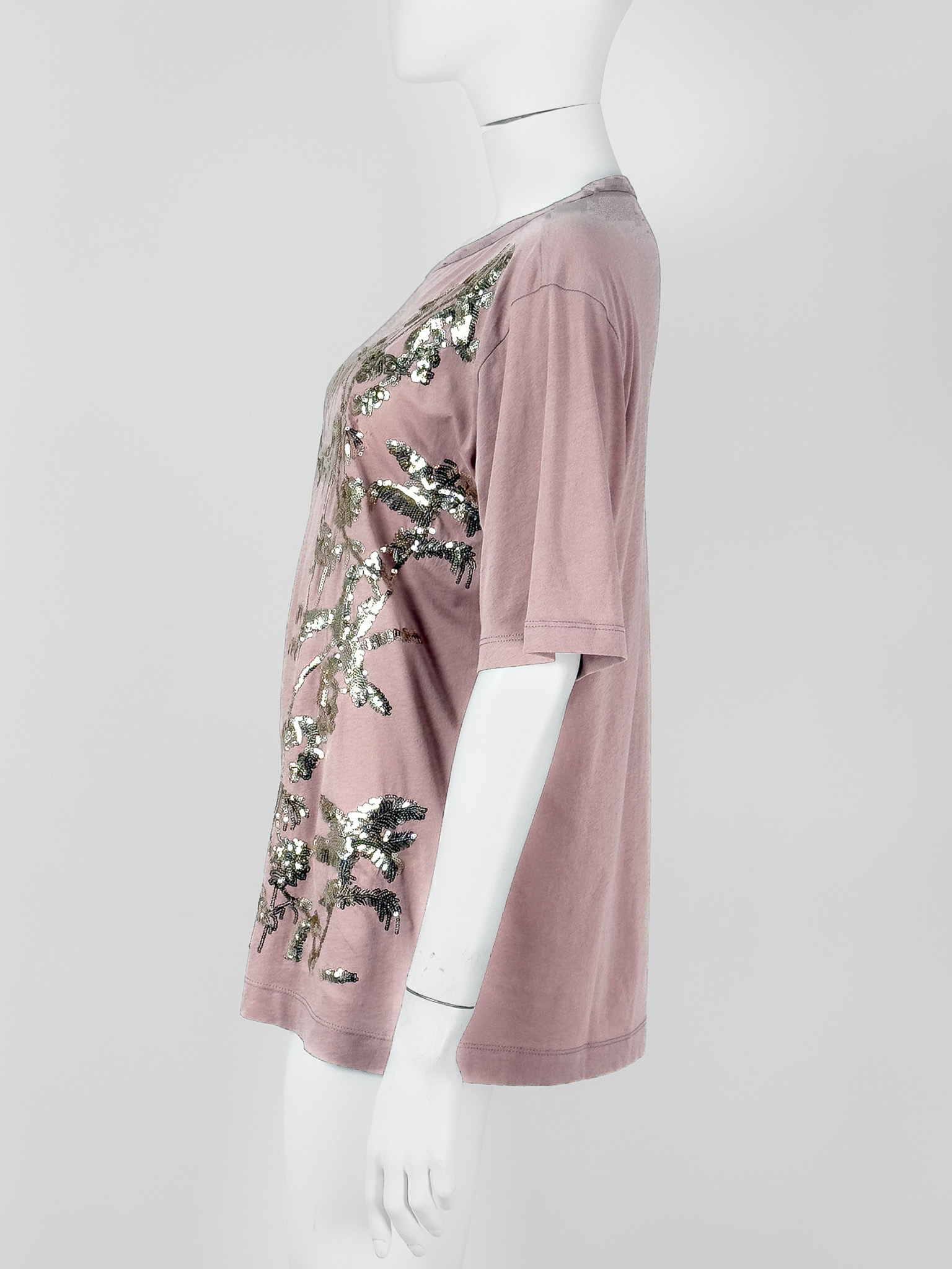 "Bawełniany t-shirt w kolorze bladego różu ozdobiony grafiką palm wysadzanych złotymi cekinami, prosty krój, zaokrąglony dekolt wykończony ściągaczem. Stan dobry, posiada plamę w okolicy biustu. Rozmiar z metki S. Skład: 100% bawełna. Wymiary: szerokość mierzona od pachy do pachy 55cm, długość całkowita 64cm."