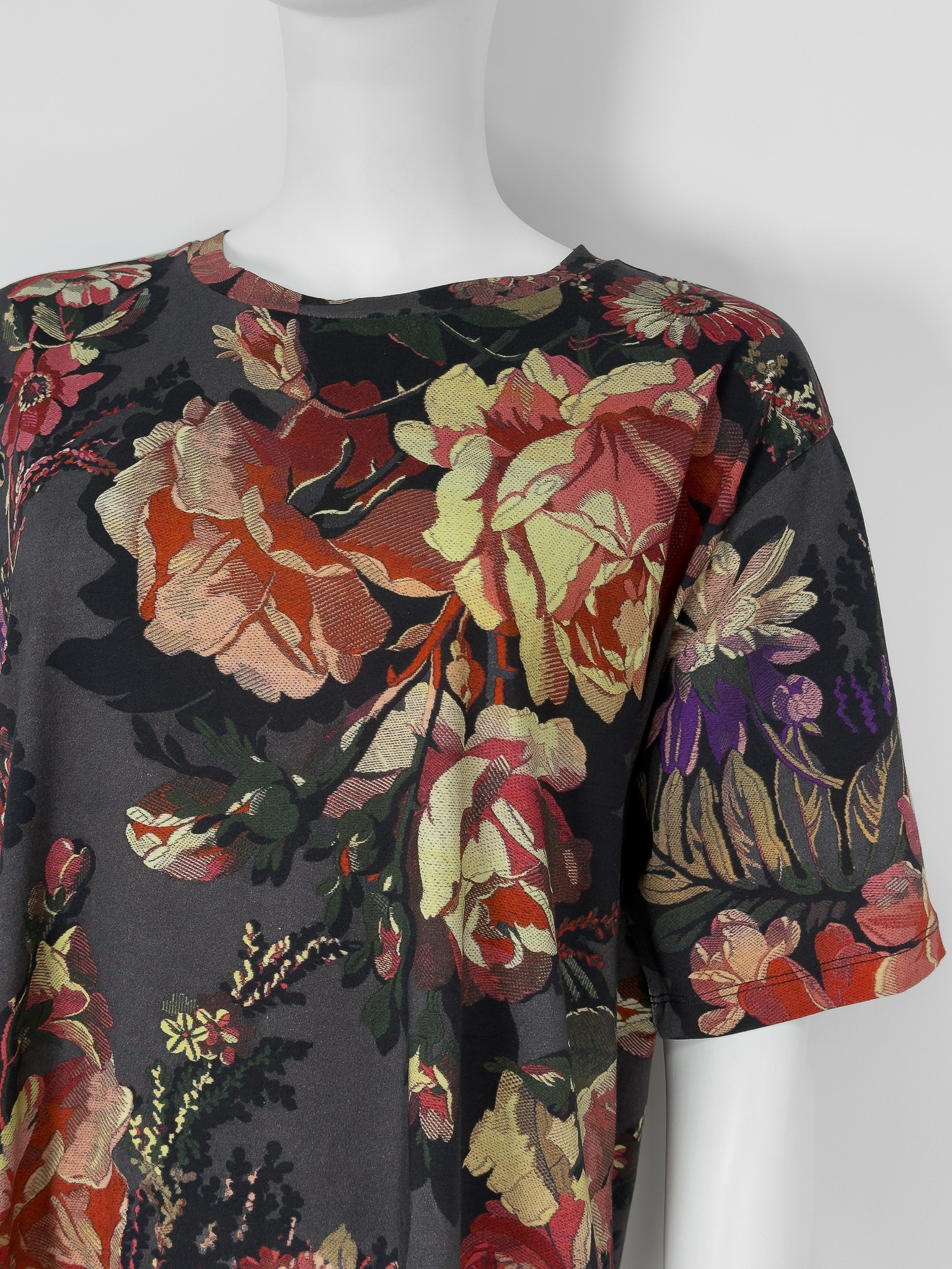 "Ciemnoszary bawełniany t-shirt ozdobiony różowo-fioletowo-czerwoną grafiką kwiatów, prosty krój, zaokrąglony dekolt. Stan bardzo dobry. Rozmiar z metki L. Skład: 100% bawełna. Wymiary: szerokość mierzona od pachy do pachy 59cm, długość całkowita 66cm."