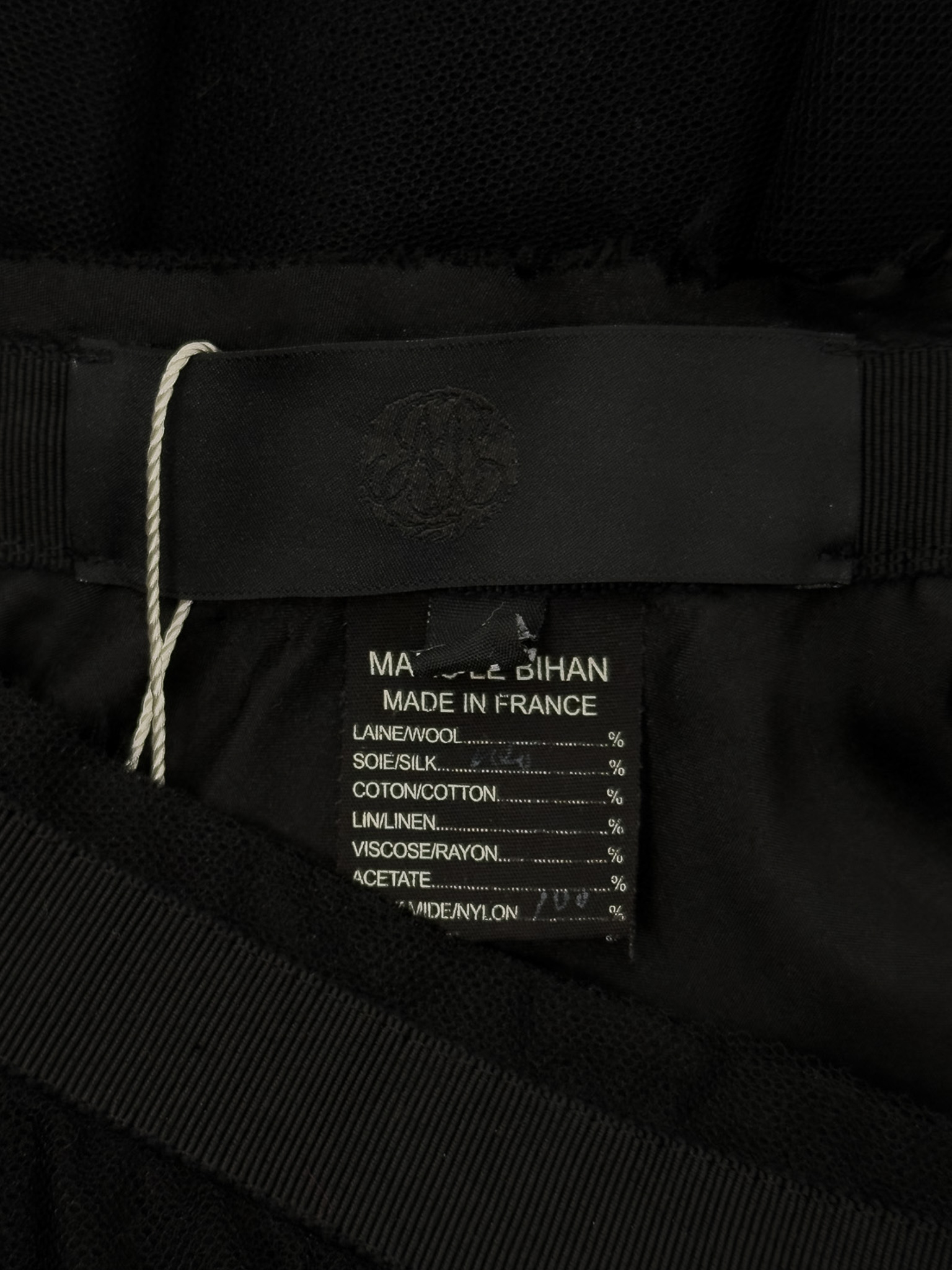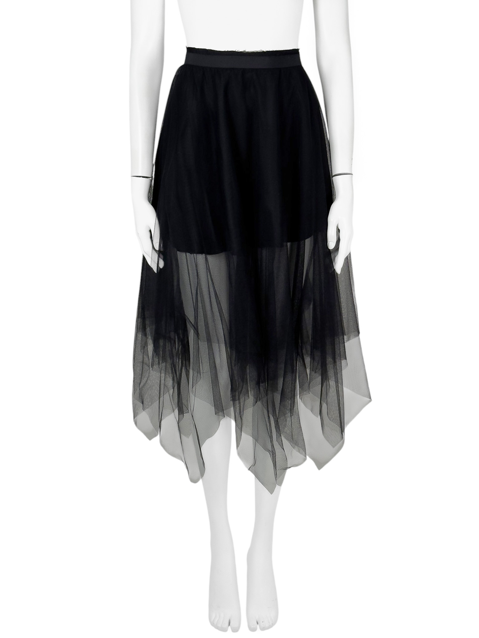 "Czarna tiulowa spódnica z krótszą podszewką, częściowo transparentna, czarna wstążka w pasie, zapinana na kryty suwak oraz haftkę. Rozmiar z metki FR 44. Stan bardzo dobry. Wymiary: szerokość w pasie 44cm, długość całkowita 83cm."