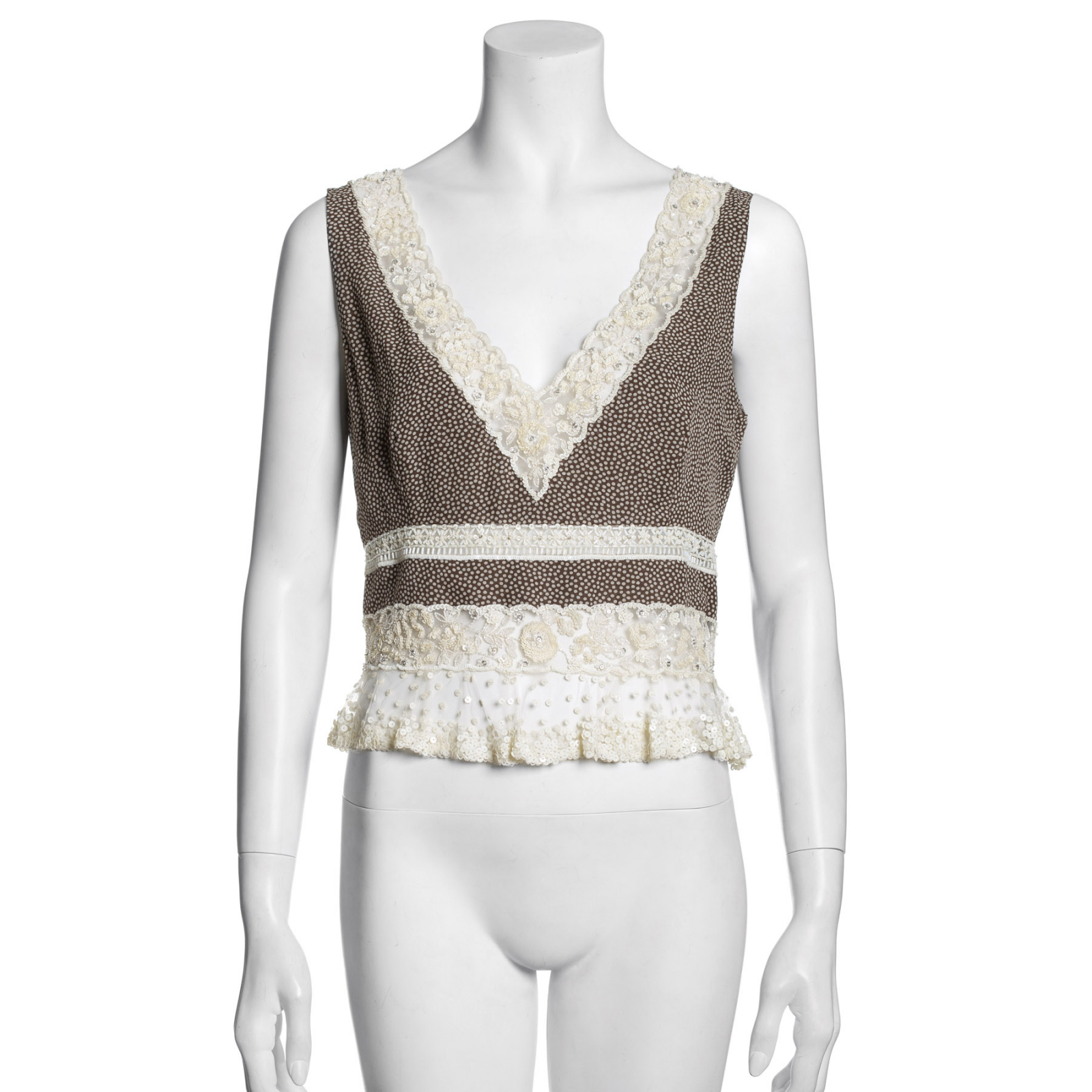 "beżowy top w kropeczki z ecru ozdobami, 100% jedwab, it 10; wymiary: biust 45 cm, szer. dołu 37 cm, dł. całkowita 49 cm"