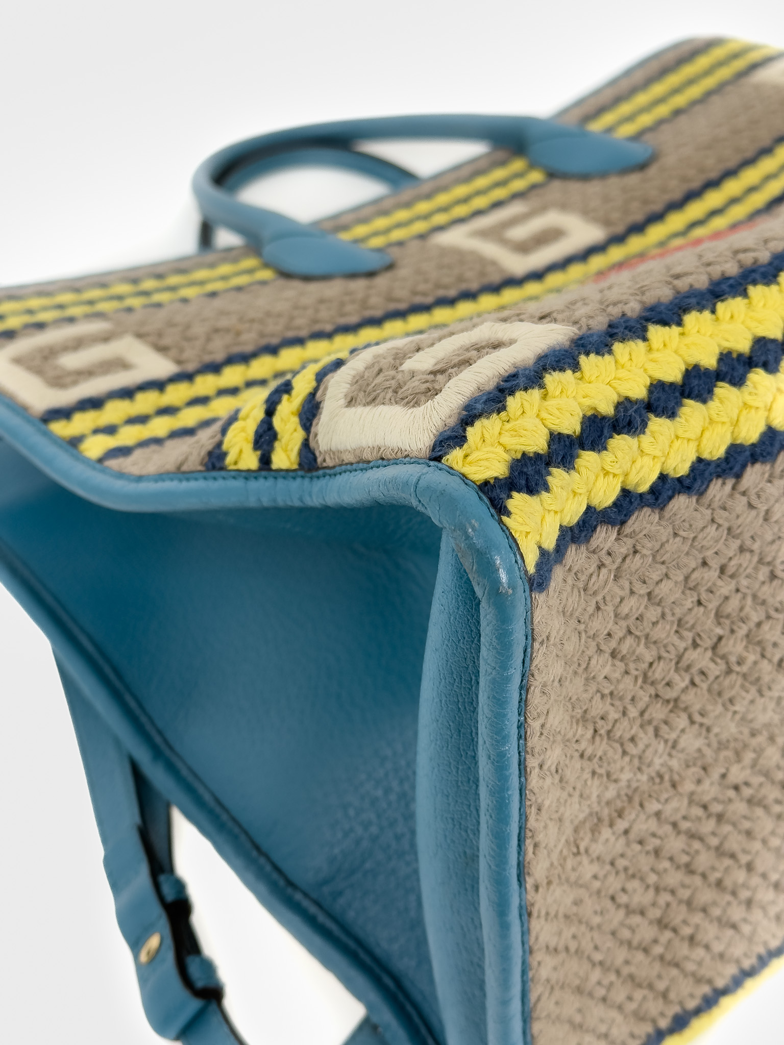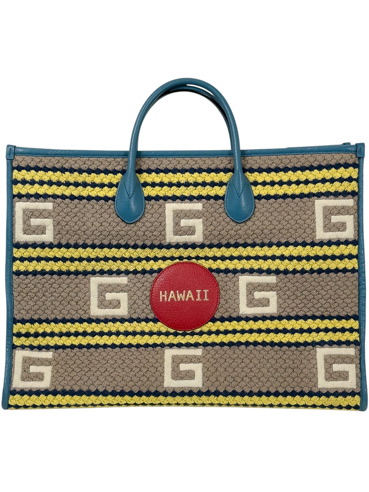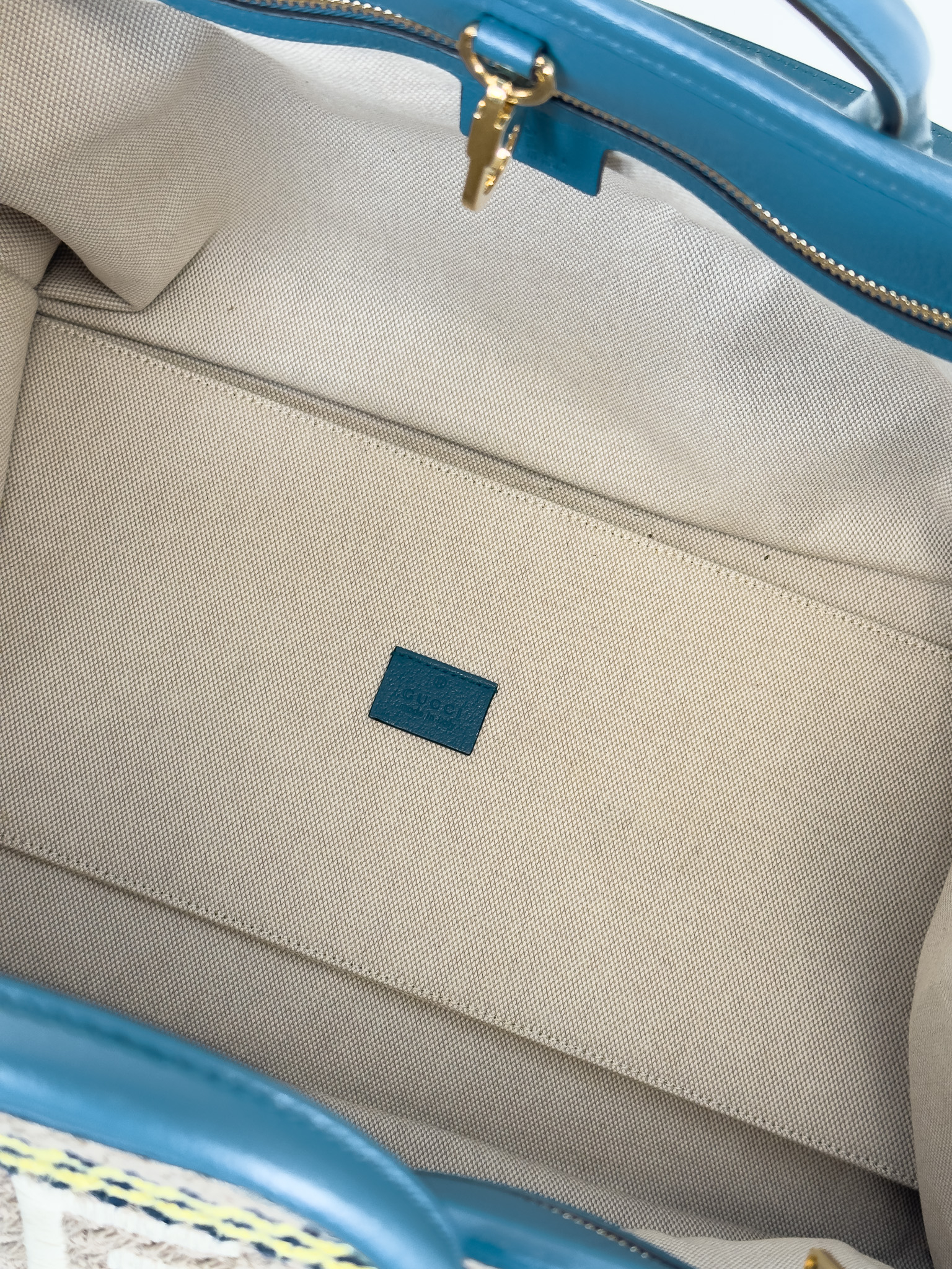 "Duża pleciona torba plażowa do ręki/ na ramię, w odcieniach beżu, żółci oraz granatu, wykończona skórą w kolorze niebieskim, ozdobiona kremowymi inicjałami marki oraz skórzaną czerwoną okrągłą naszywką w centralnej części z napisem "HAWAII", jedna duża komora z dwoma kieszeniami wewnątrz, prostokątny kształt, w zestawie z dowodem zakupu z komisu Dream Big. Stan bardzo dobry, posiada przetarcia na rogach. Wymiary: szerokość 43,5cm, wysokość 31cm, głębokość 20cm."
