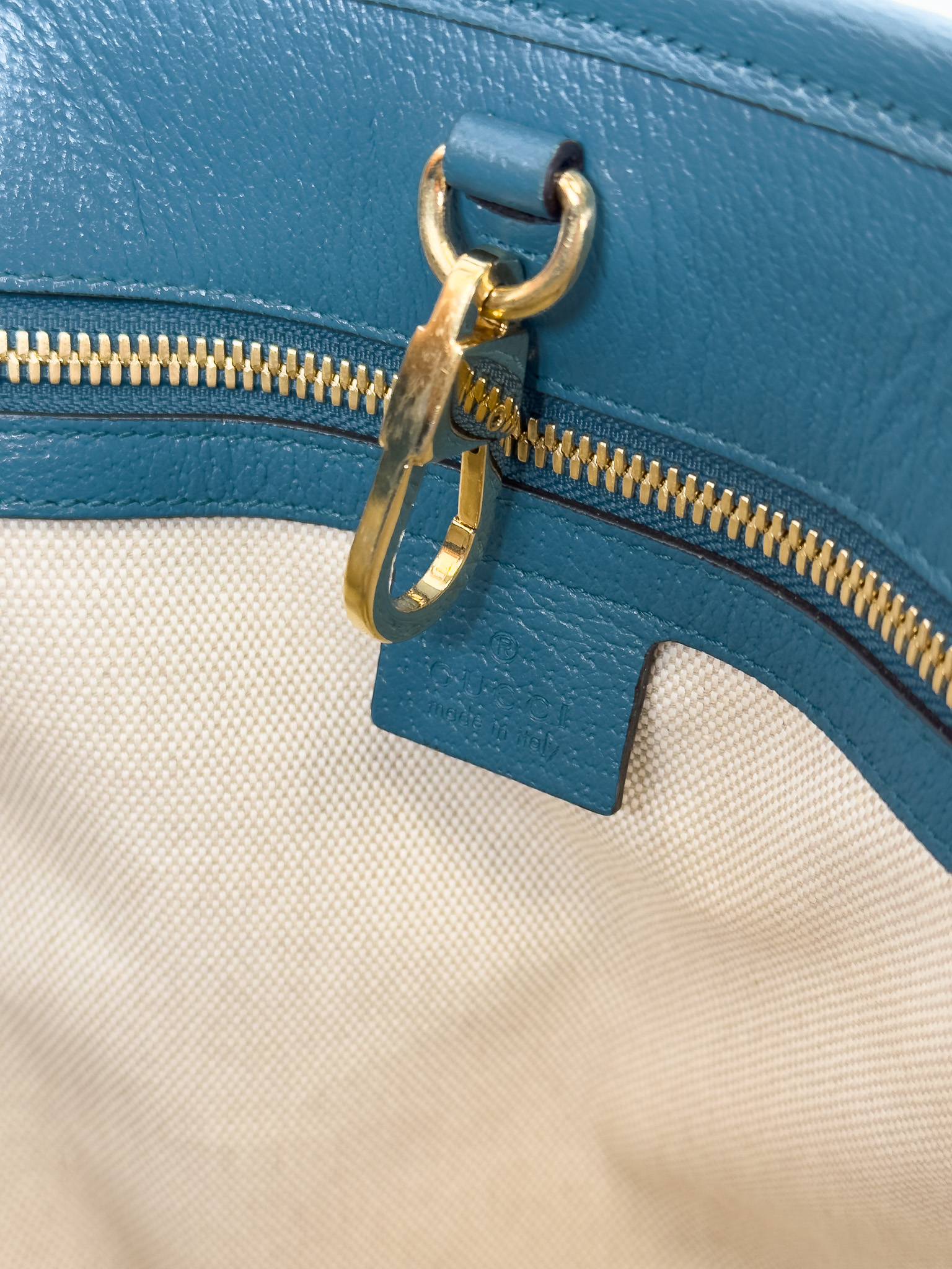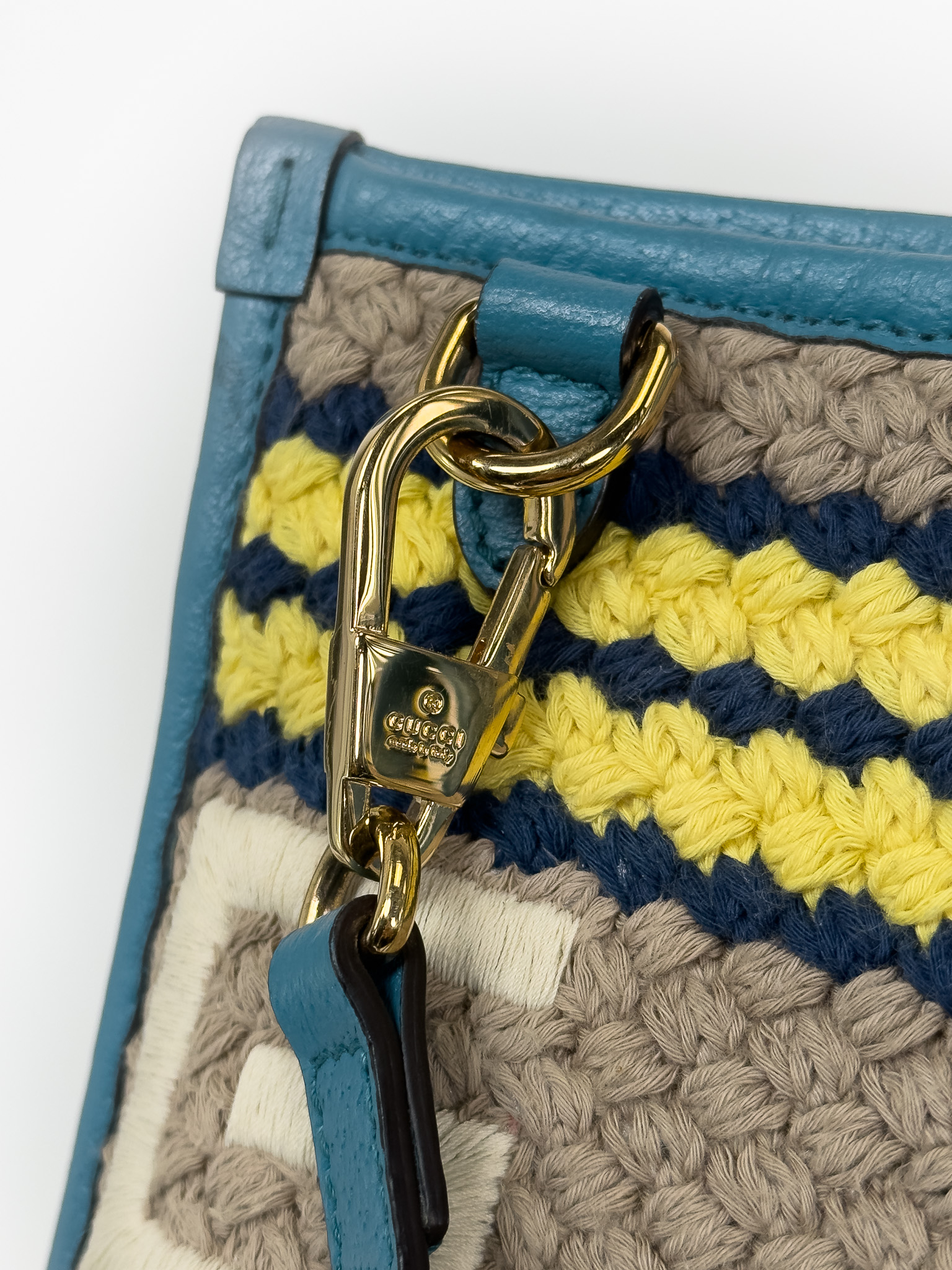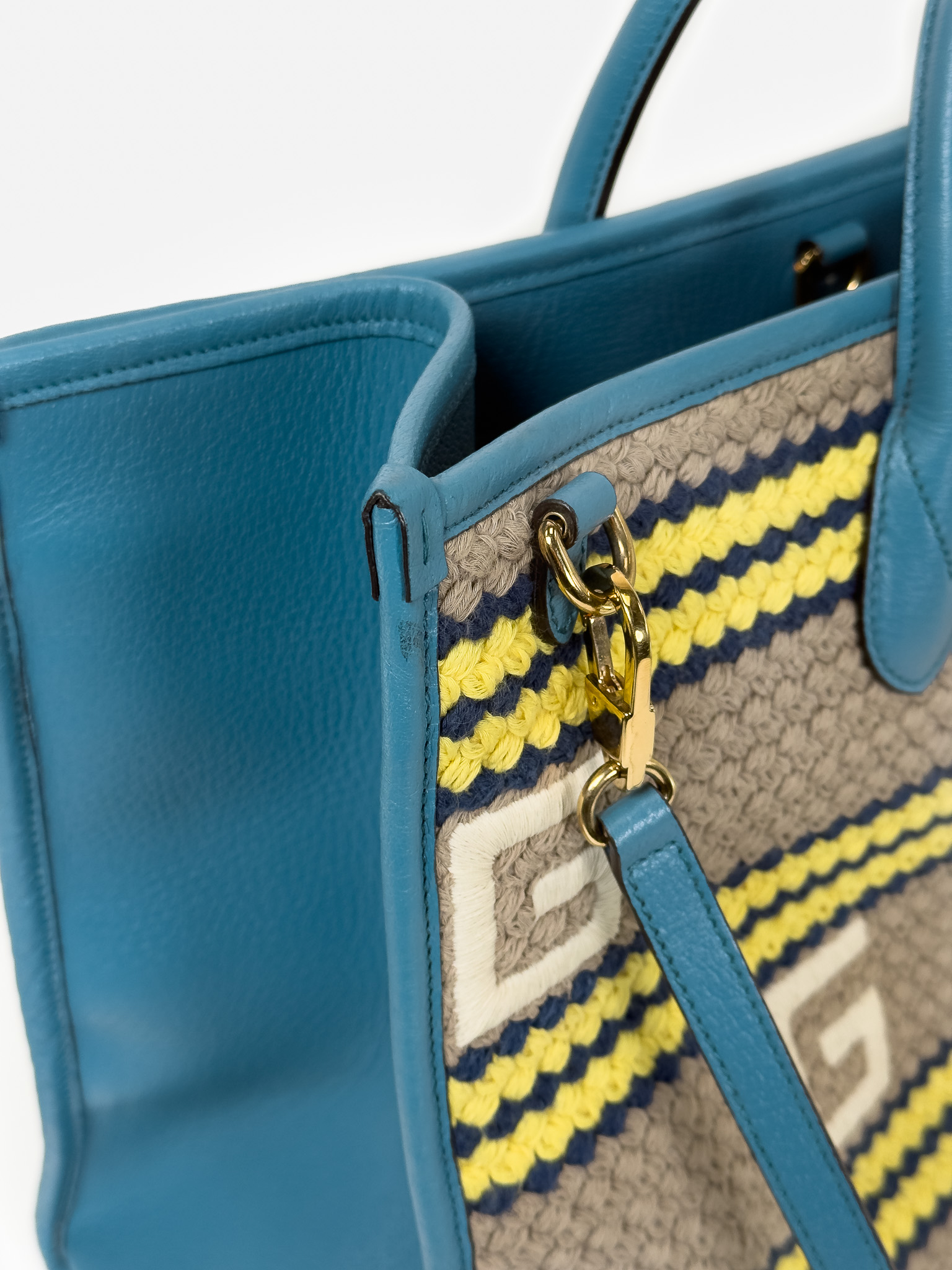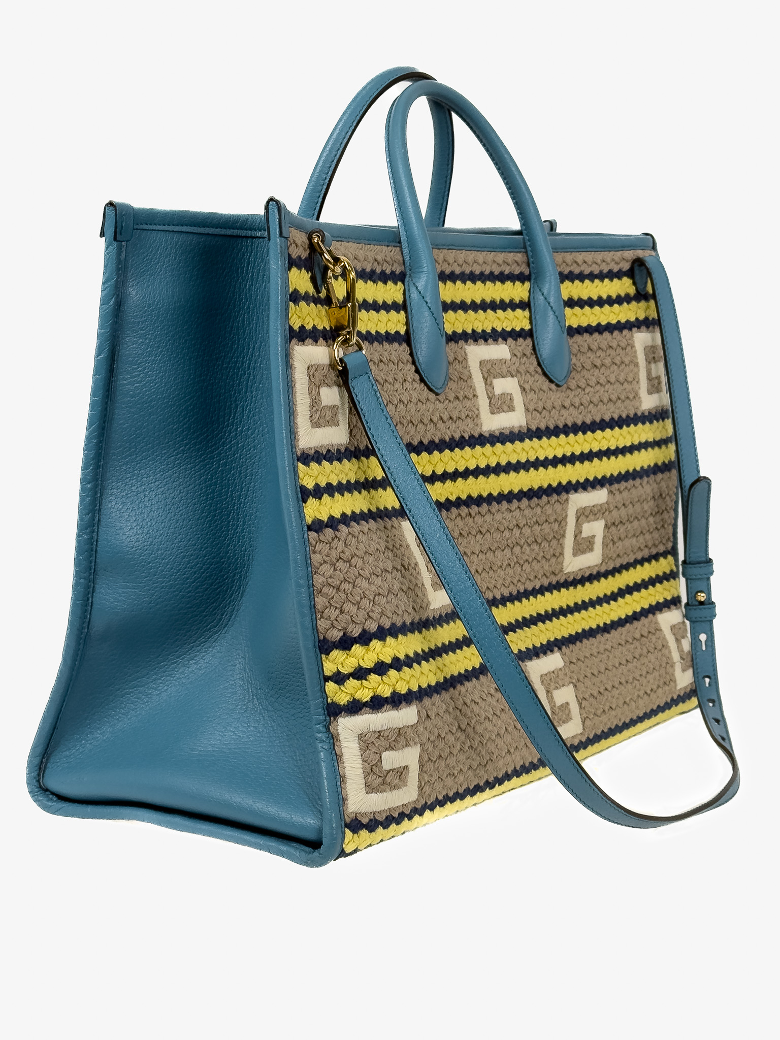 "Duża pleciona torba plażowa do ręki/ na ramię, w odcieniach beżu, żółci oraz granatu, wykończona skórą w kolorze niebieskim, ozdobiona kremowymi inicjałami marki oraz skórzaną czerwoną okrągłą naszywką w centralnej części z napisem "HAWAII", jedna duża komora z dwoma kieszeniami wewnątrz, prostokątny kształt, w zestawie z dowodem zakupu z komisu Dream Big. Stan bardzo dobry, posiada przetarcia na rogach. Wymiary: szerokość 43,5cm, wysokość 31cm, głębokość 20cm."