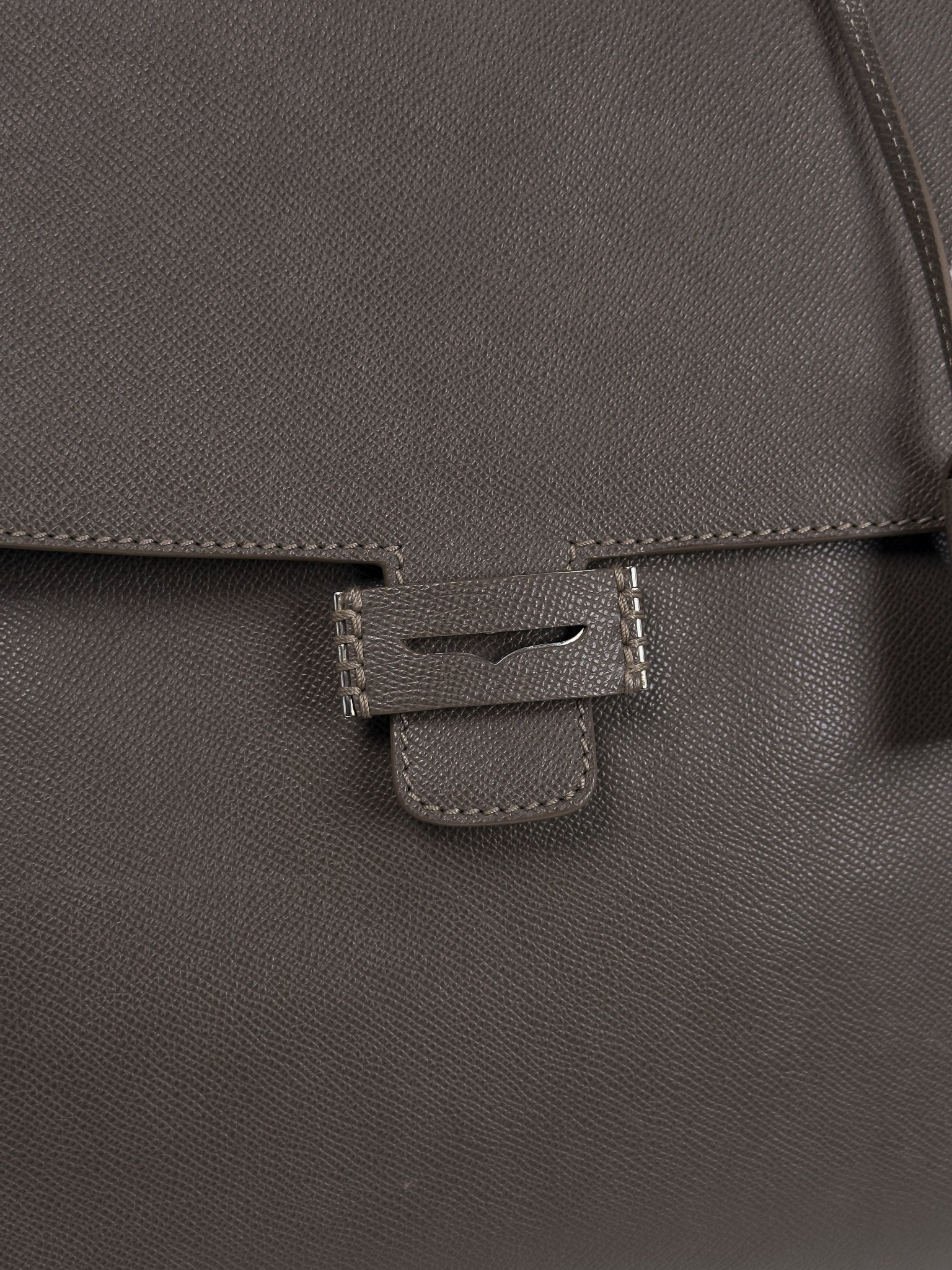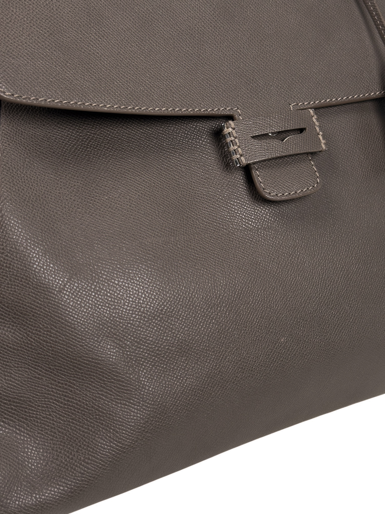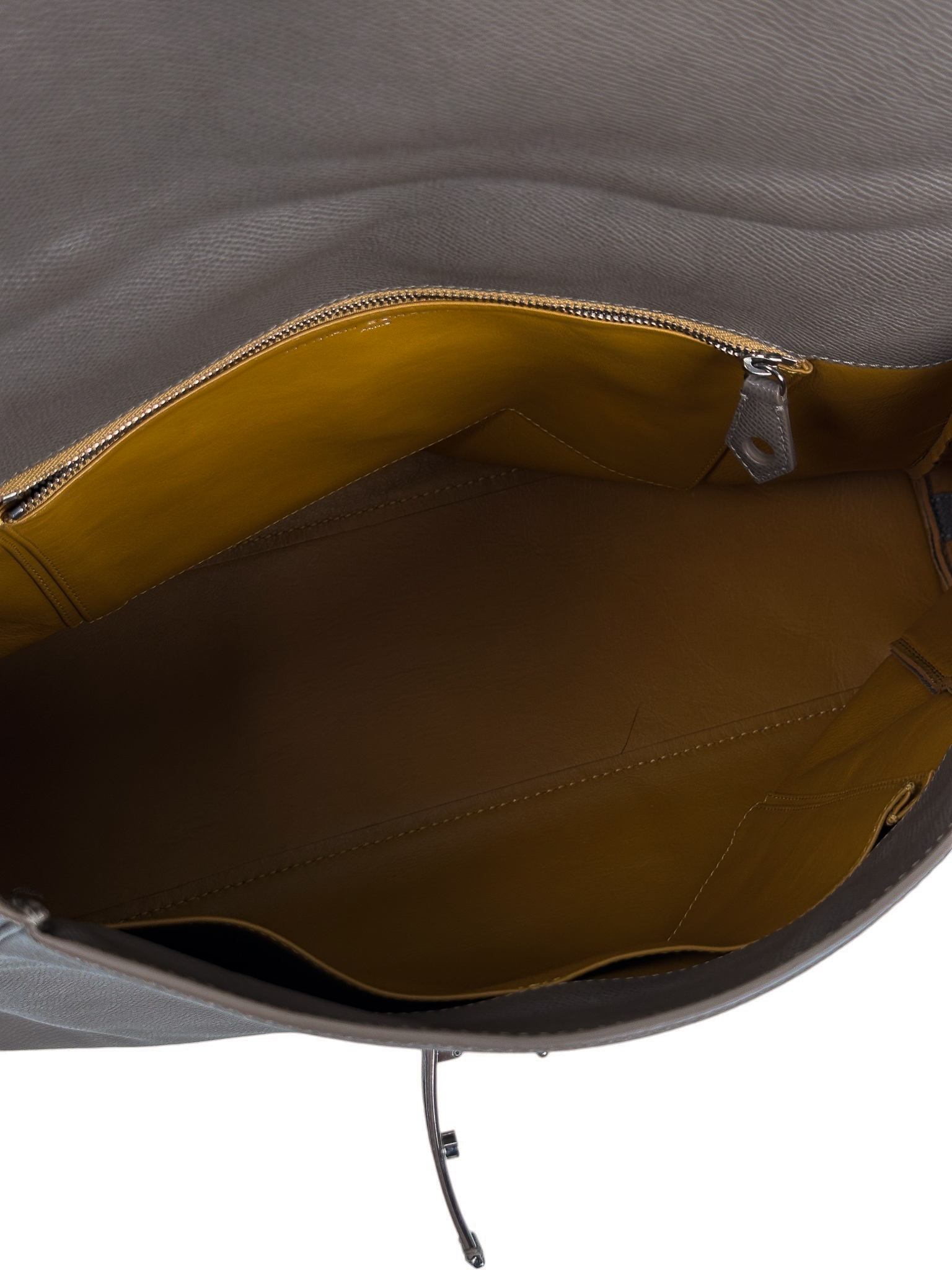 "Szara torba MYRIAM SCHAEFER w kształcie trapezu z dodatkowym długim paskiem, zapinana na klapkę, wewnątrz musztardowa. Kieszonka na suwak i dwie kieszonki otwarte. Wymiary:szer. 39 cm. wys.30 szer. bok cm. 14 cm. Wymiary podstawy: 41 cm. x 13 cm."