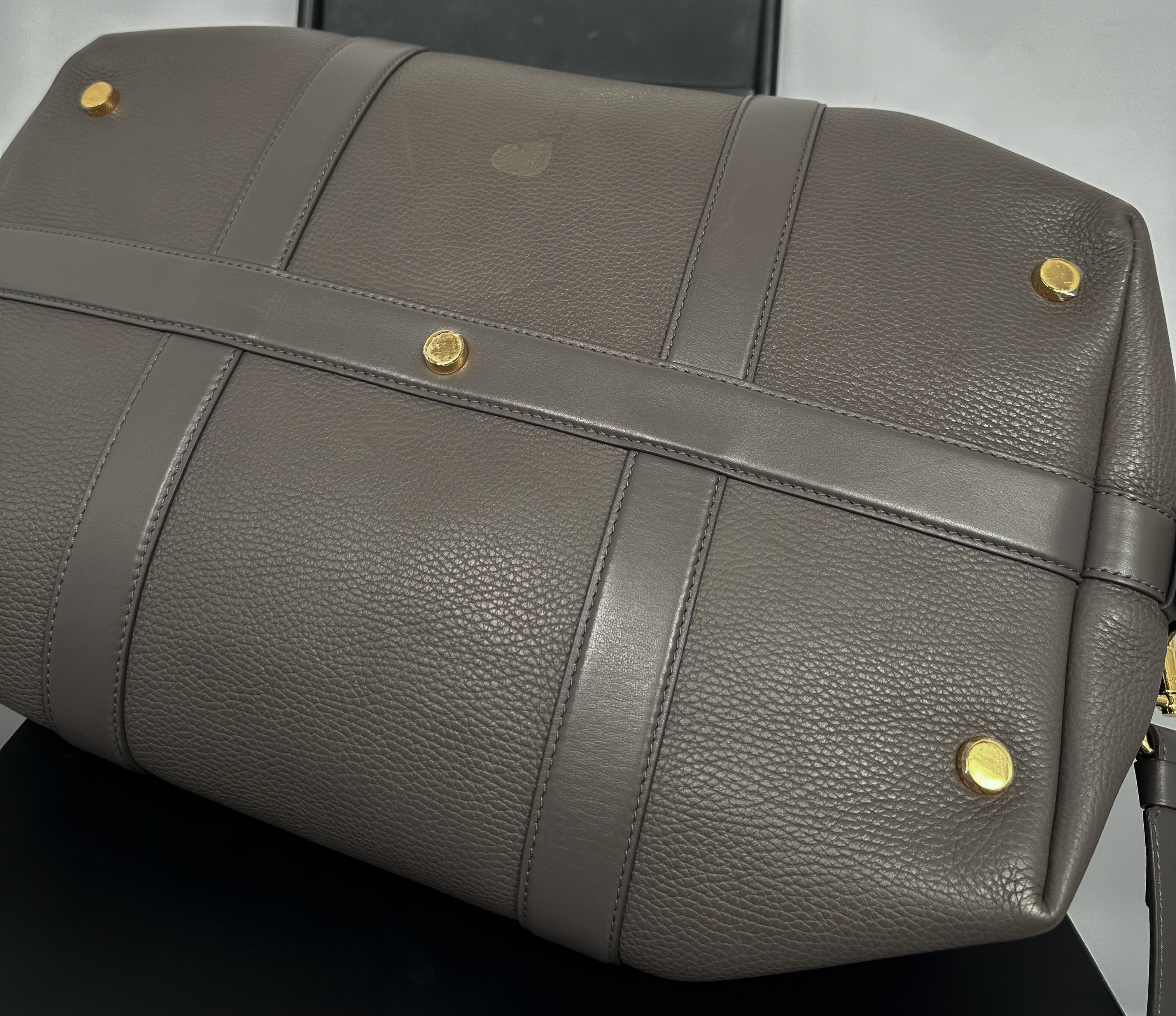 "Skórzana torba podróżna w kolorze taupe, dwa uchwyty do ręki w górnej części, zapinana na duży logowany złoty suwak wykończony skórzaną wstawką, regulowany pasek na ramię, pięć złotych logowanych nóżek od spodu, jedna komora, czarne materiałowe wnętrze z trzema kieszeniami, używana. Stan bardzo dobry, delikatnie zabrudzone wnętrze oraz spód torebki. Wymiary: szerokość 45cm , wysokość 26cm, głębokość 24cm."