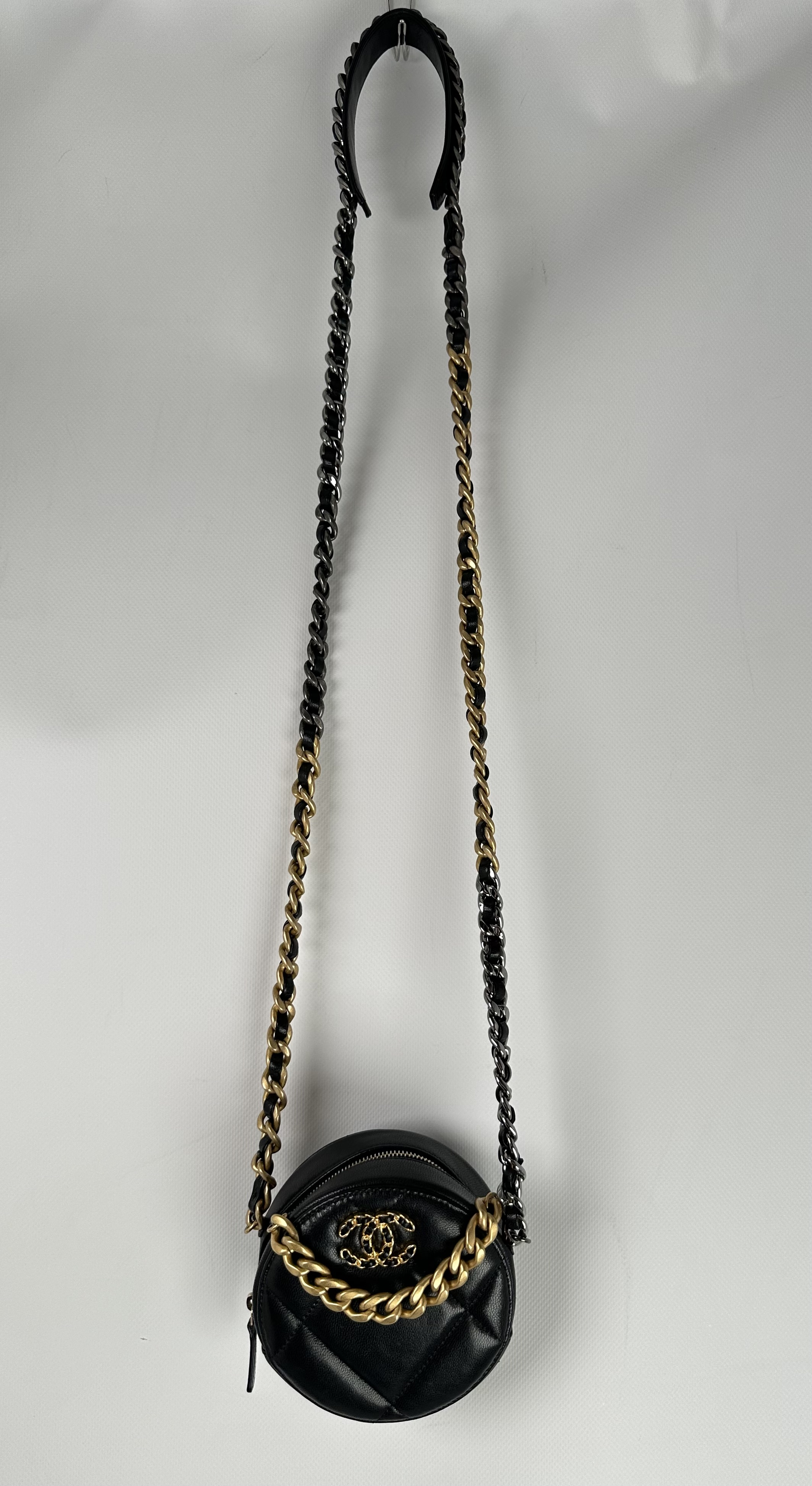 "Czarna skórzana pikowana okrągła torebka, mała, ozdobiona dużym złotym łańcuchowym logo marki na przodzie, skórzano-łańcuchowy matowo-błyszczący pasek na ramię oraz do ręki w odcieniach srebra oraz złota z szerszą skórzaną wstawką, zapinana na złoty suwak, bordowe materiałowe wnętrze, jedna komora z kieszenią wewnątrz, używana. Stan bardzo dobry, delikatne użytkowania widoczne na skórze oraz łańcuchu."