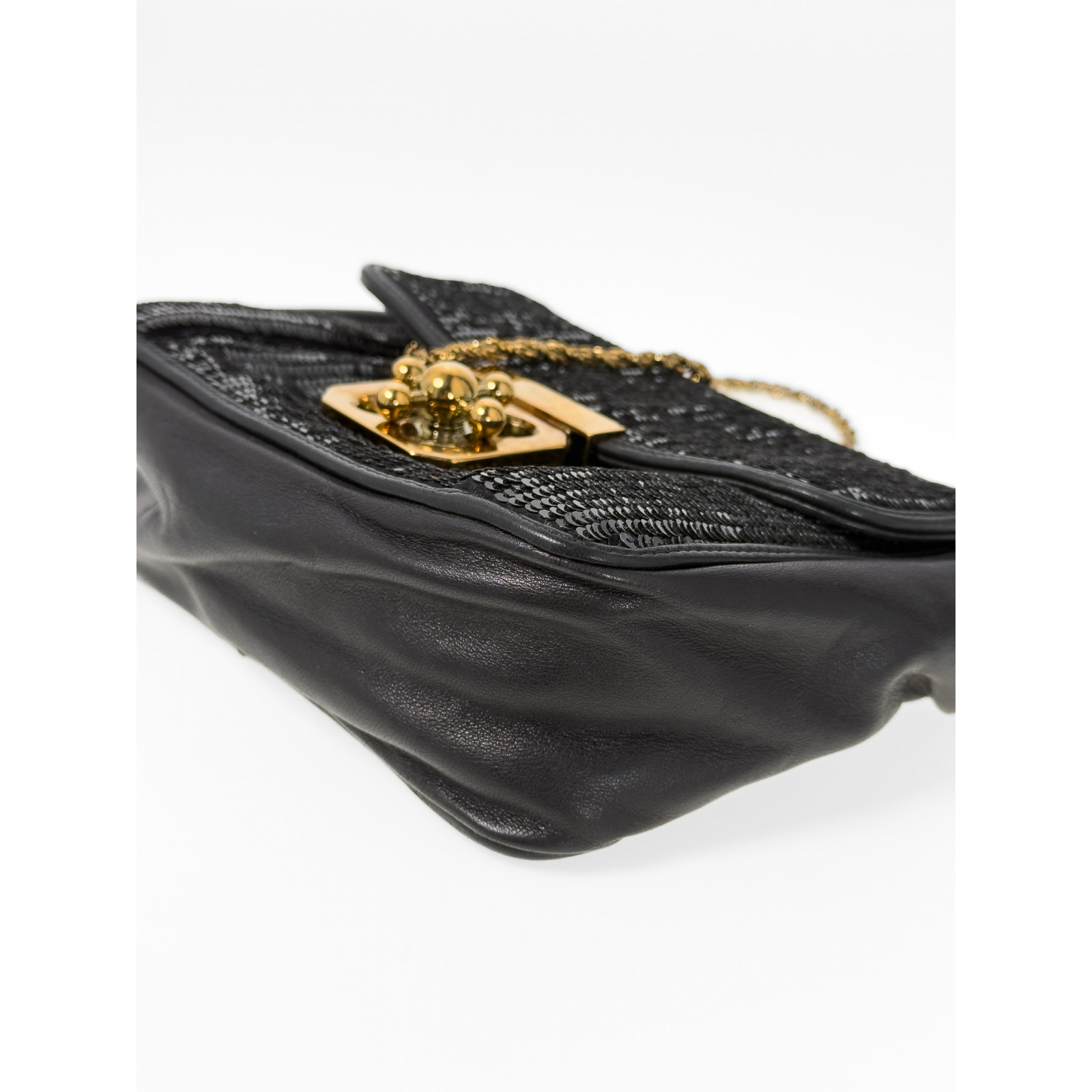 "Czarna skórzana torebka na ramię wysadzana połyskującymi cekinami, złote przekręcane zapięcie w kształcie kwiata z logo marki w centralnej części, miękka skóra, cienki łańcuchowy złoty pasek na ramię, jedna komora z kieszenią wewnątrz, w zestawie z workiem przeciwkurzowym. Stan dobry, posiada rysy na metalowych elementach, delikatne przetarcia na rogach. Wymiary: szerokość 20cm, wysokość 17cm, głębokość 7cm."