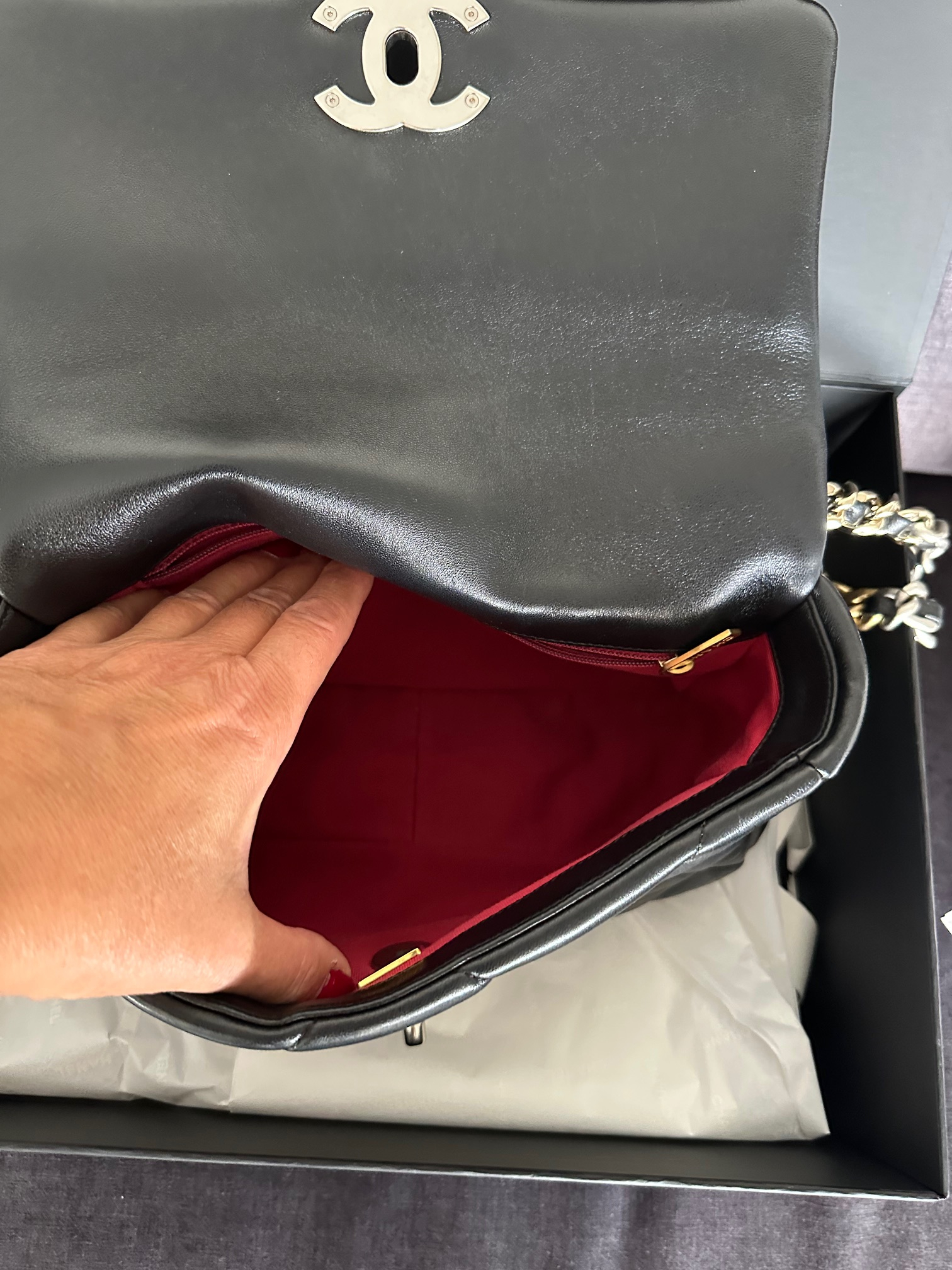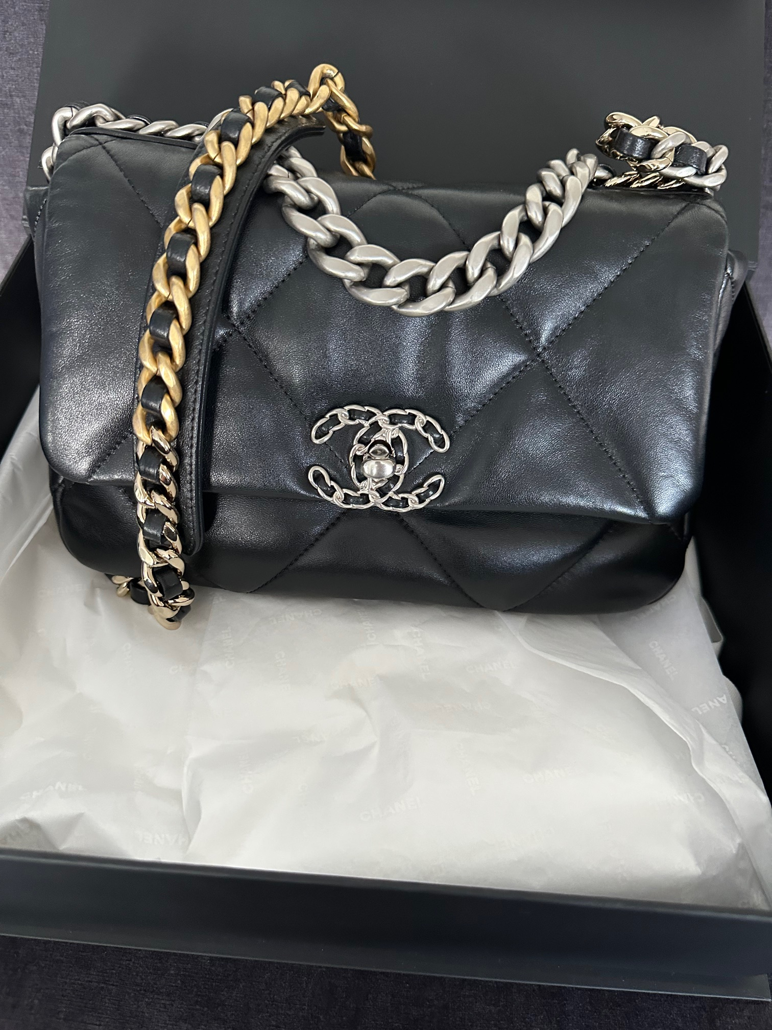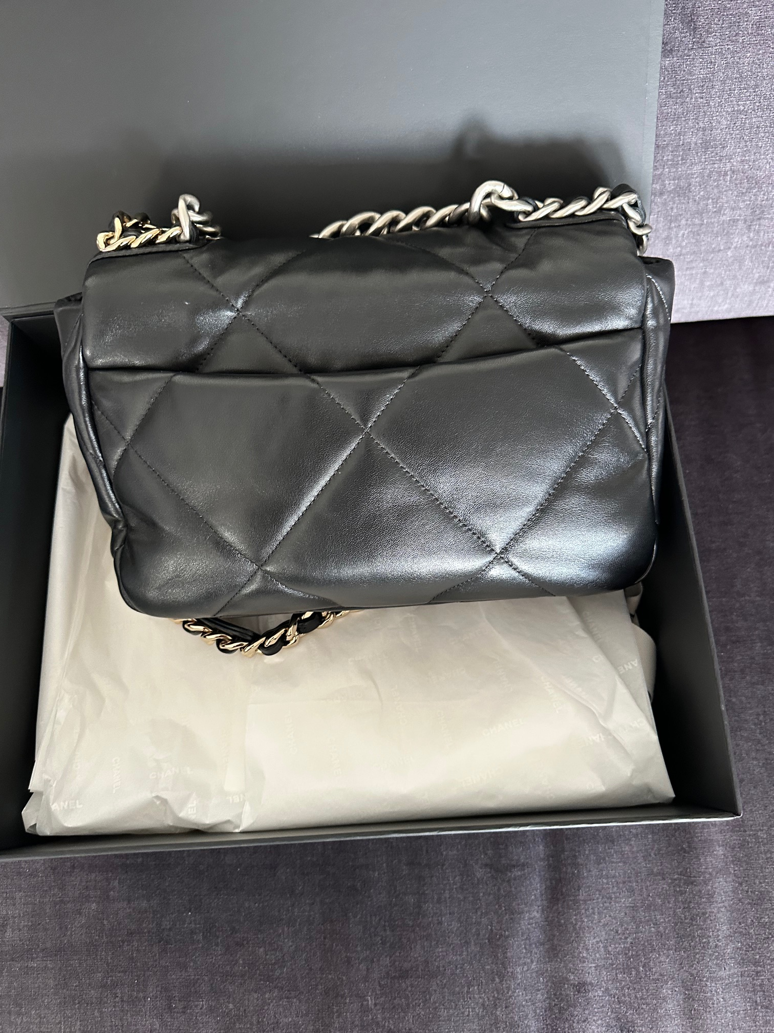 "Czarna torebka ze skóry jagnięcej. Logo CC w kolorze srebrnym oraz łańcuch w kolorze srebrnym, postarzanego złota oraz szampańskiego złota - Chanel 19, rozmiar small. Zakupiona w 2024 roku w Berlinie. W zestawie z rachunkami. Stan bardzo dobry, jedyny ślad użytkowania to plama od błyszczyka w kieszonce. Wymiary torebki: 26 x 16 x 9."