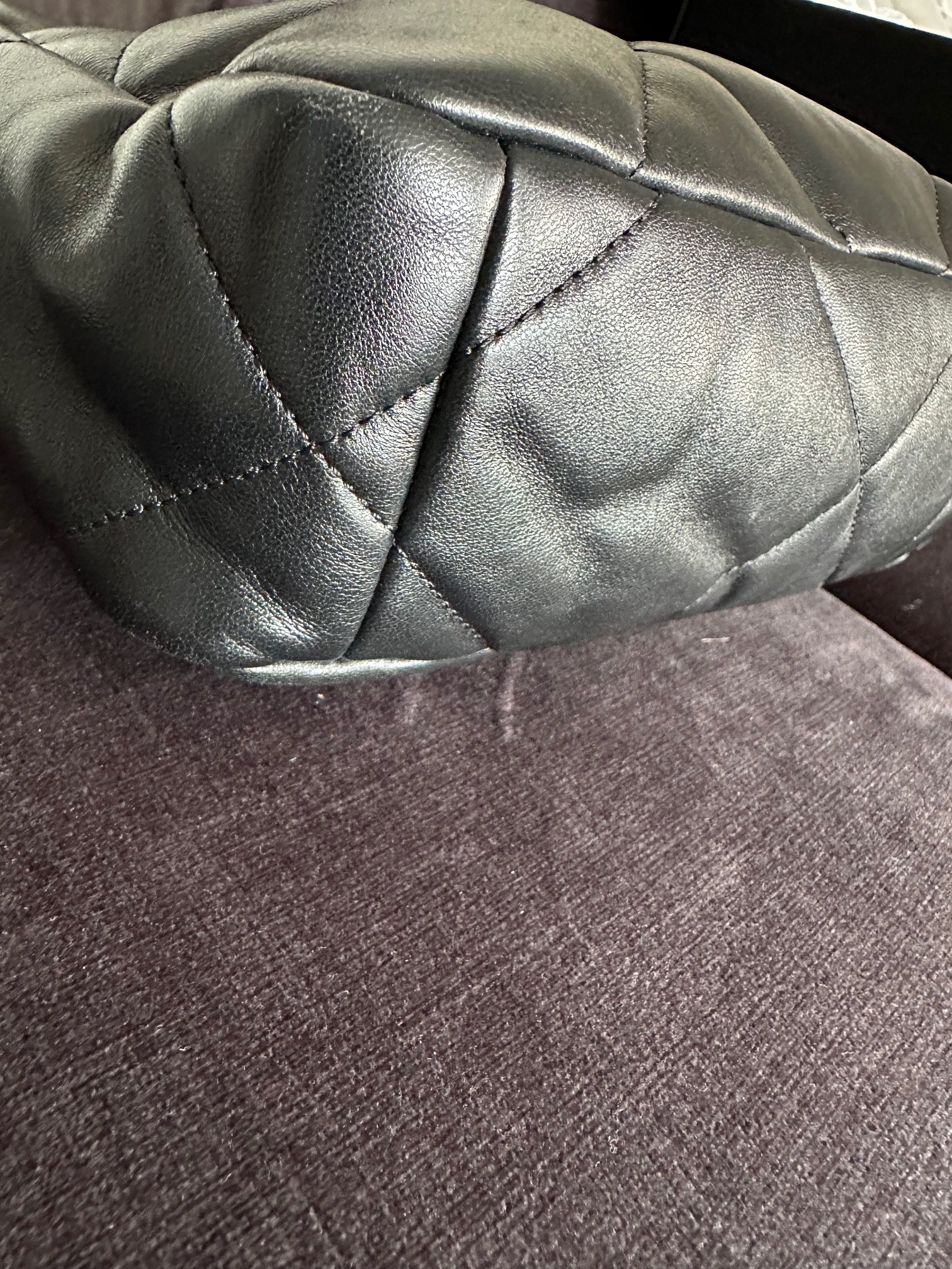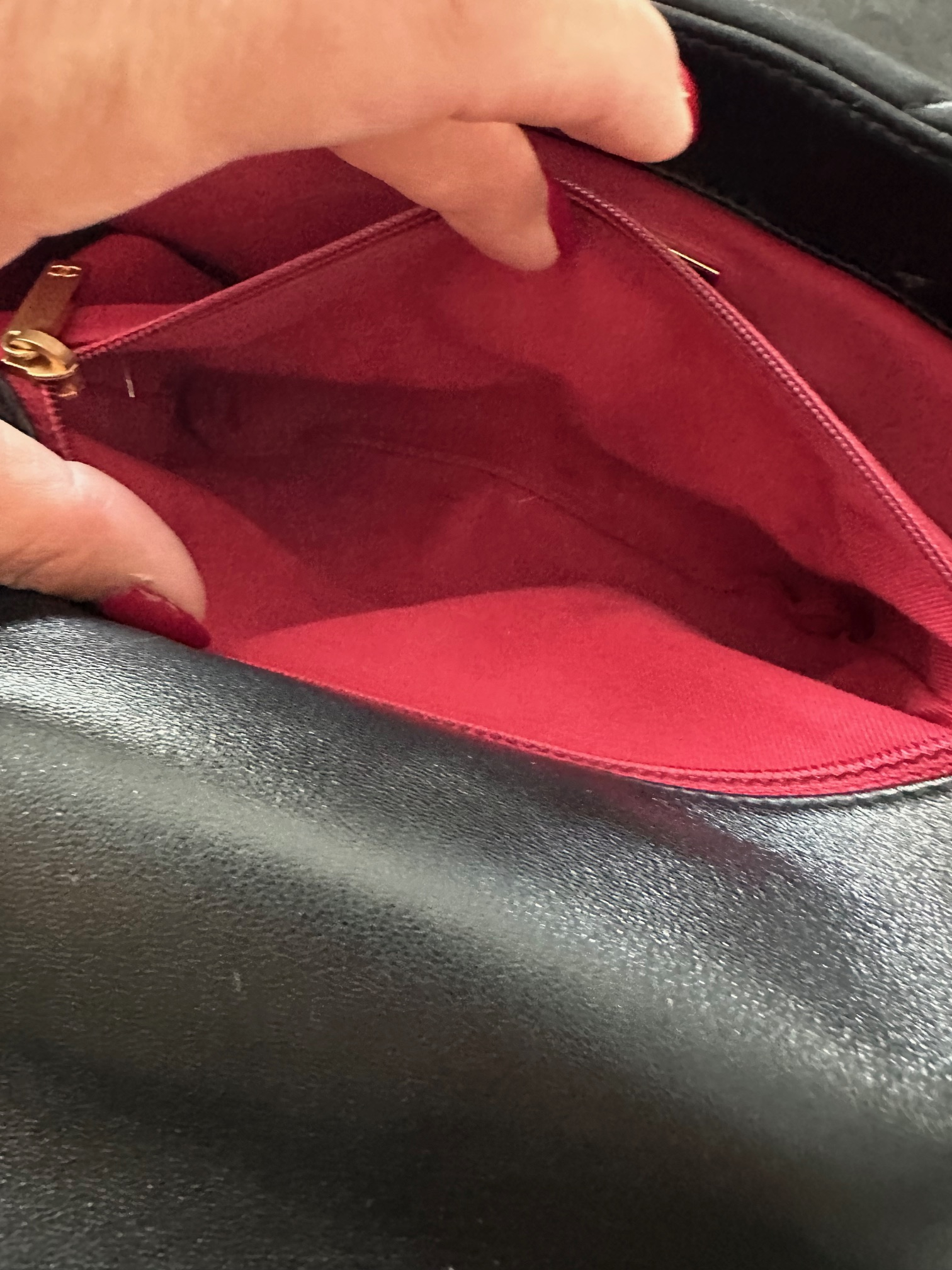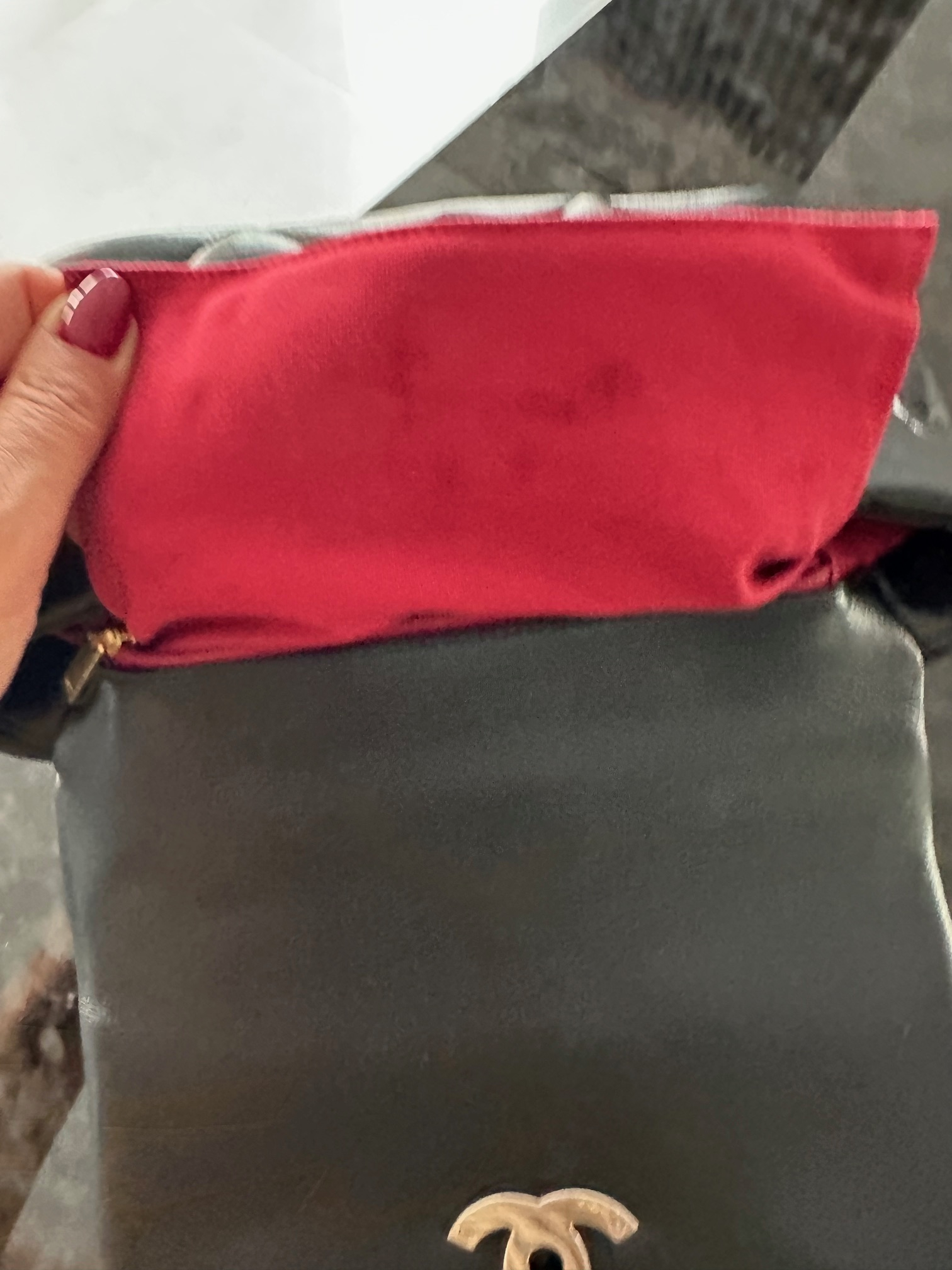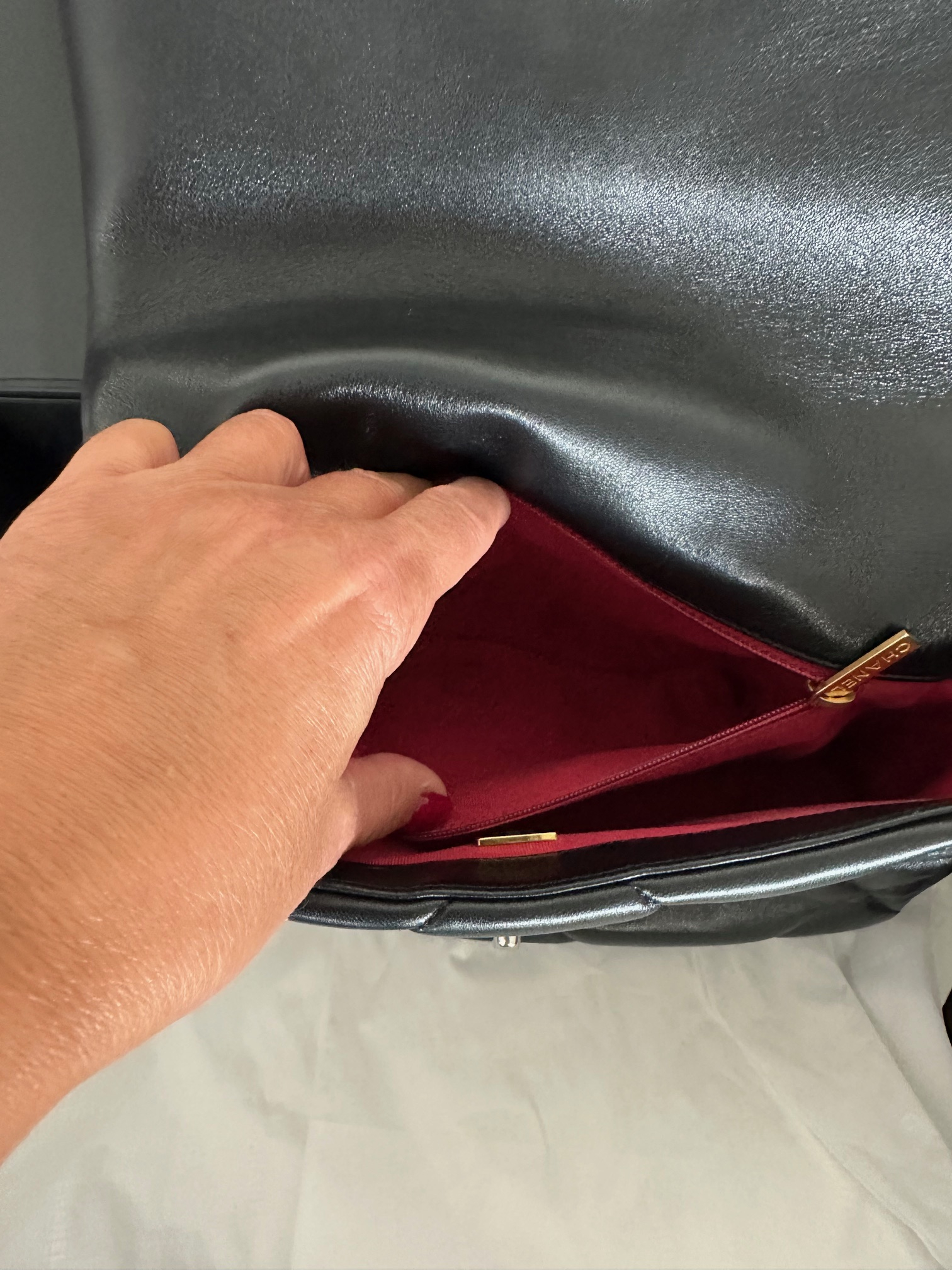 "Czarna torebka ze skóry jagnięcej. Logo CC w kolorze srebrnym oraz łańcuch w kolorze srebrnym, postarzanego złota oraz szampańskiego złota - Chanel 19, rozmiar small. Zakupiona w 2024 roku w Berlinie. W zestawie z rachunkami. Stan bardzo dobry, jedyny ślad użytkowania to plama od błyszczyka w kieszonce. Wymiary torebki: 26 x 16 x 9."