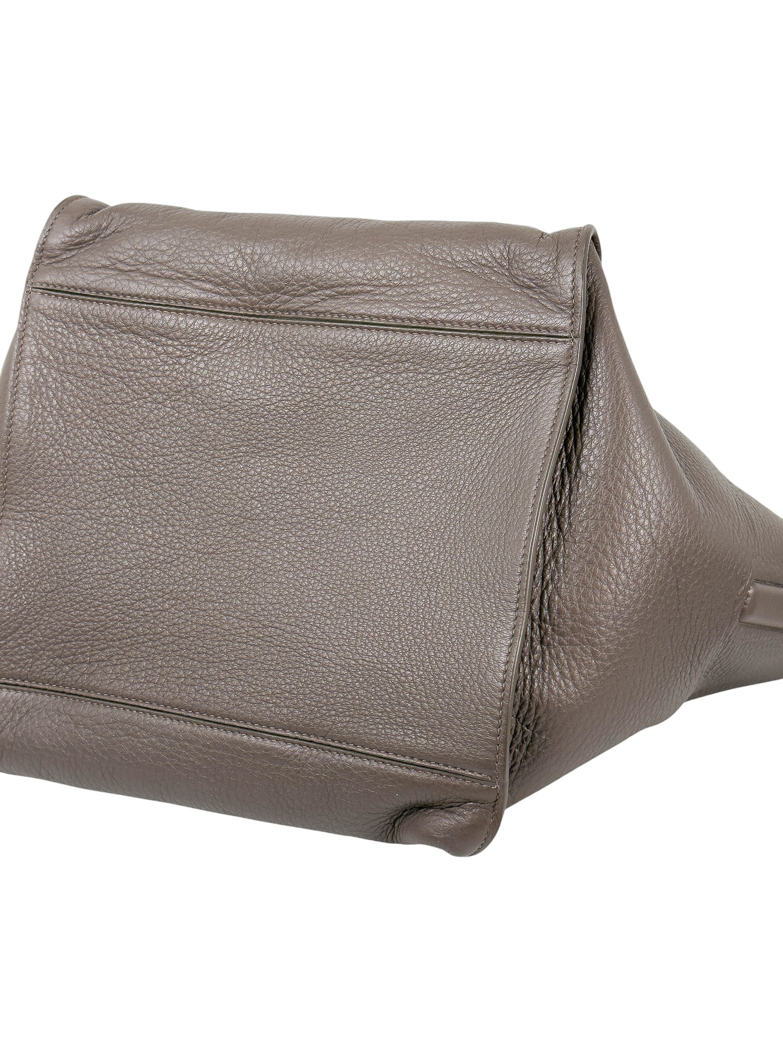 "Skórzana torebka w kolorze taupe ozdobiona ściąganym futrem/kożuchem, groszkowa skóra, dwa uchwyty do ręki/ na ramię, srebrne okucia, zamszowe wnętrze, jedna duża komora, dwie kieszenie, zapinana na logowany karabińczyk w zestawie z workiem przeciwkurzowym. Stan idealny. Wymiary: szerokość 28cm, wysokość 34cm, głębokość 31cm."