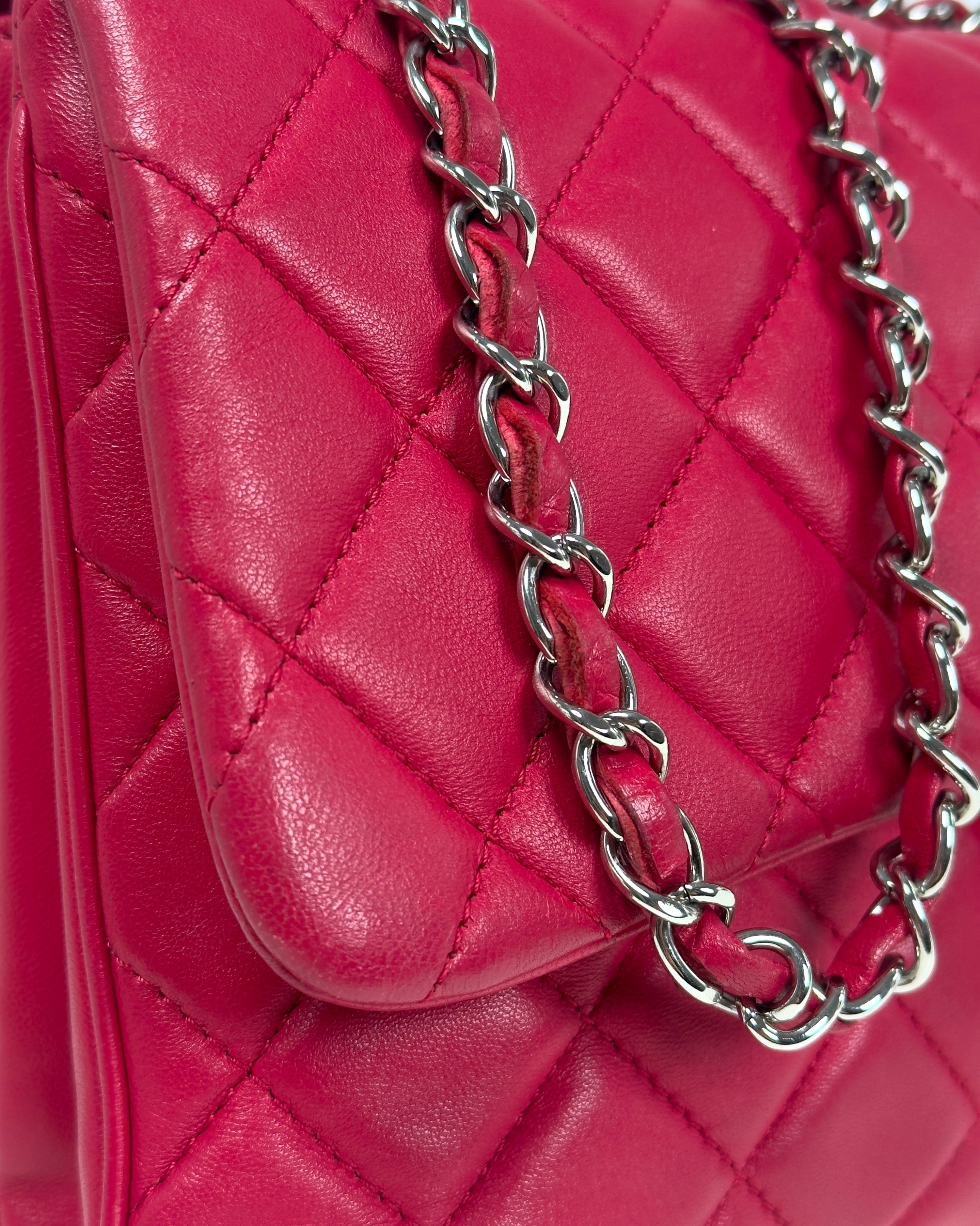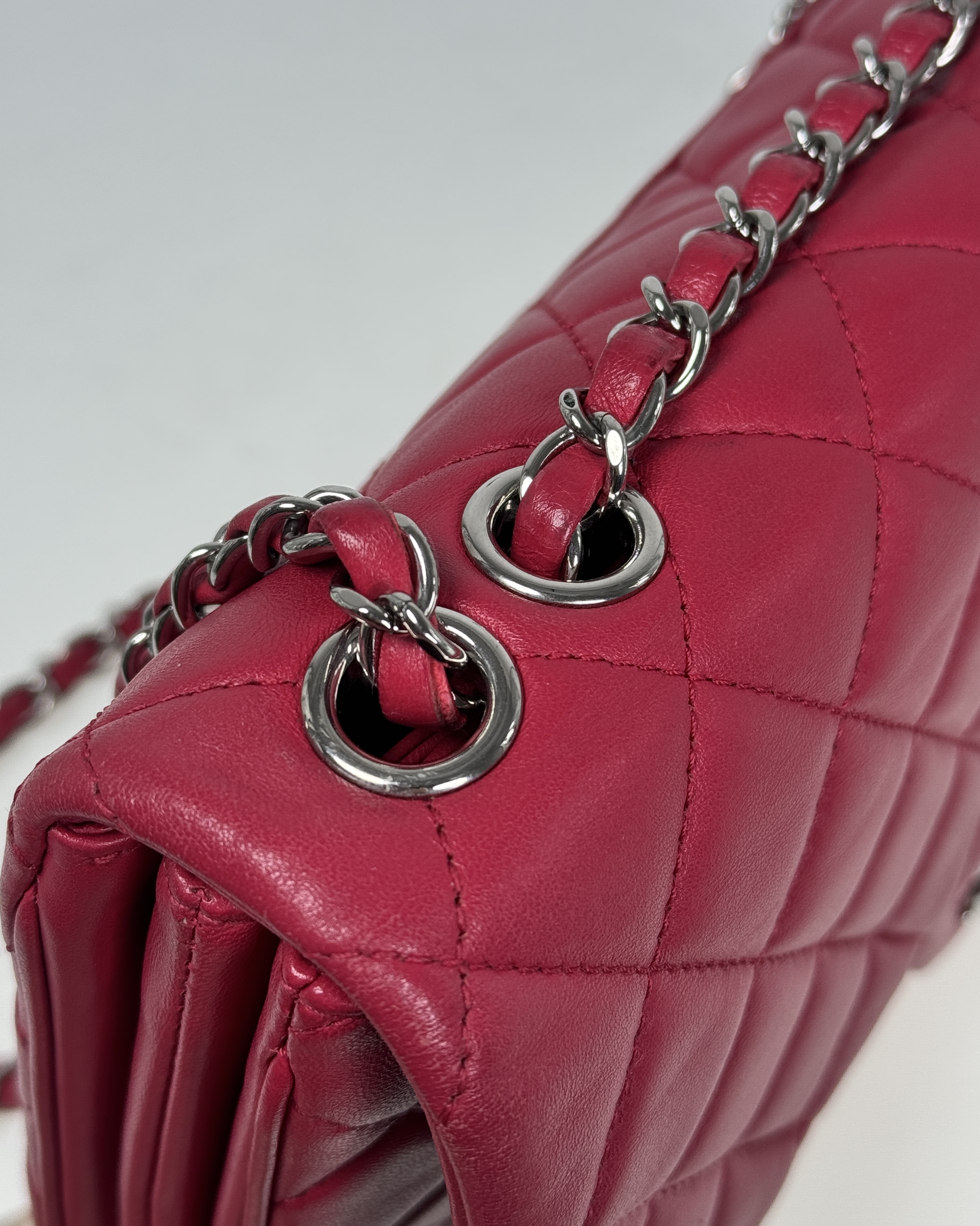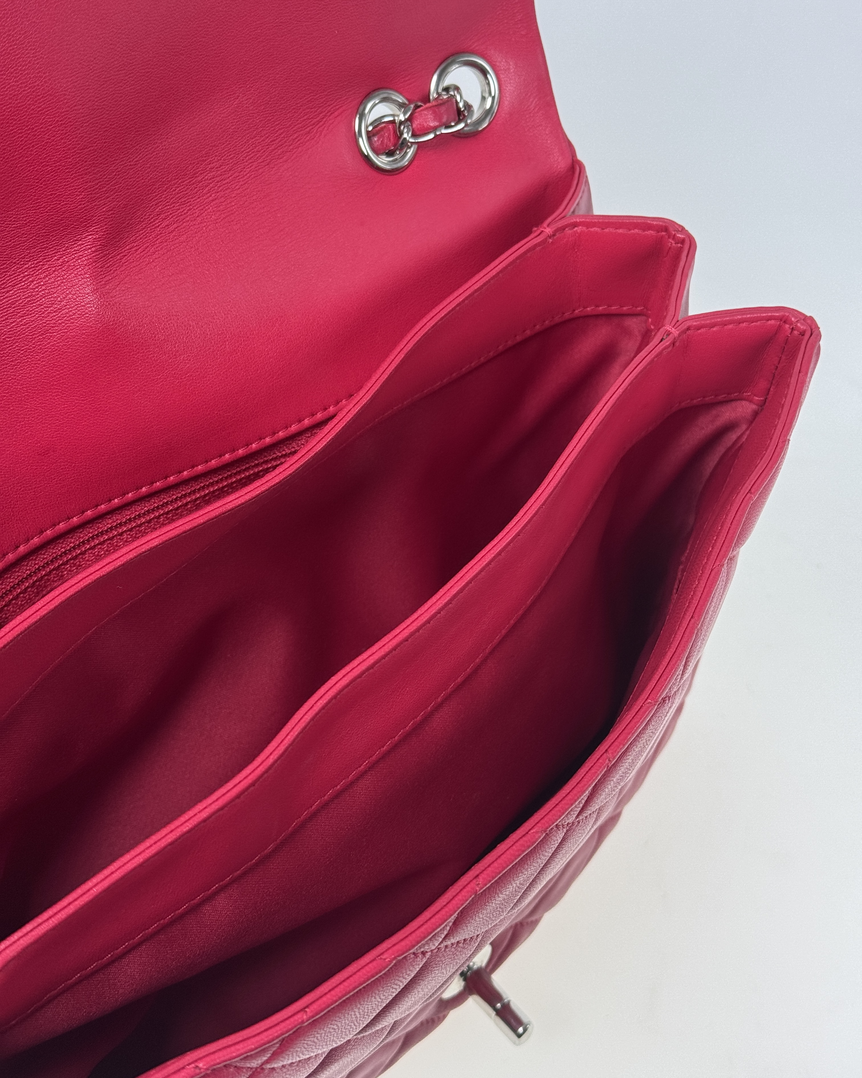 "Chanel Classic Flap - torebka wykonana z miękkiej, pikowanej skóry jagnięcej w intensywnym różowym odcieniu. Model zapinany na charakterystyczne zapięcie CC Turnlock w kolorze srebrnym. Torebka posiada klasyczną klapę, w środku dwie przegrody oraz kieszonkę na zamek. Stan bardzo dobry, posiada kartę autentyczności."