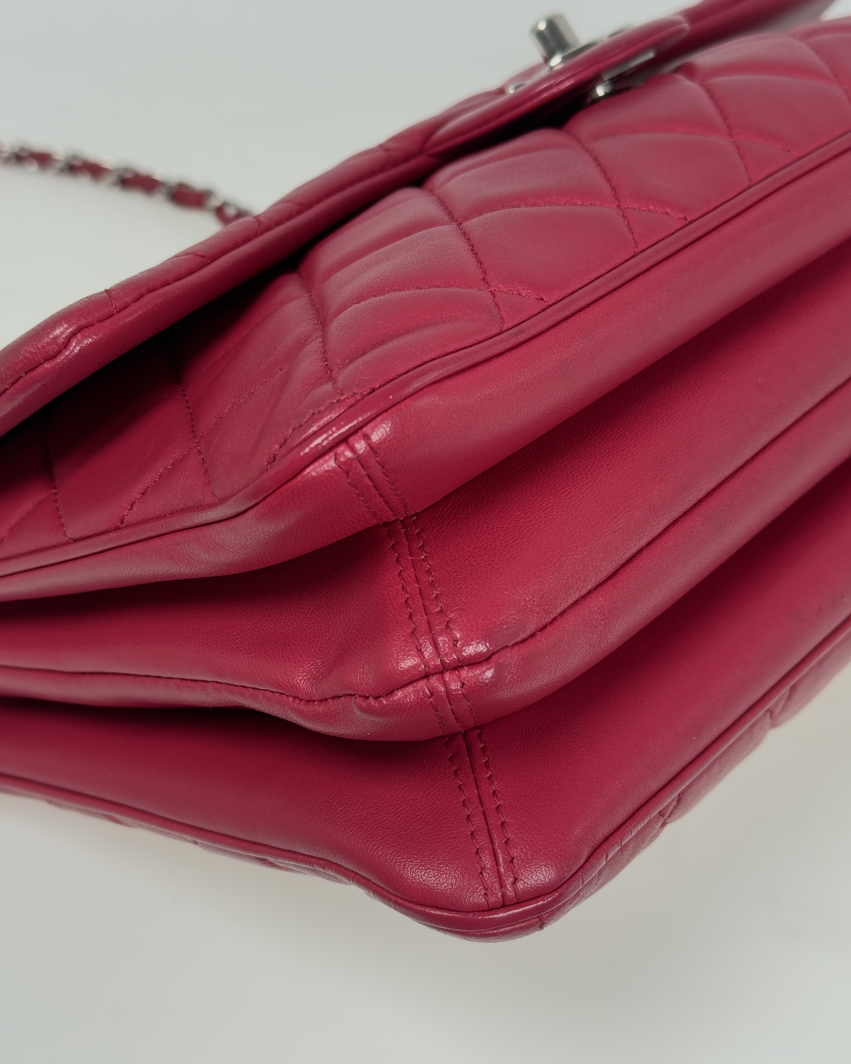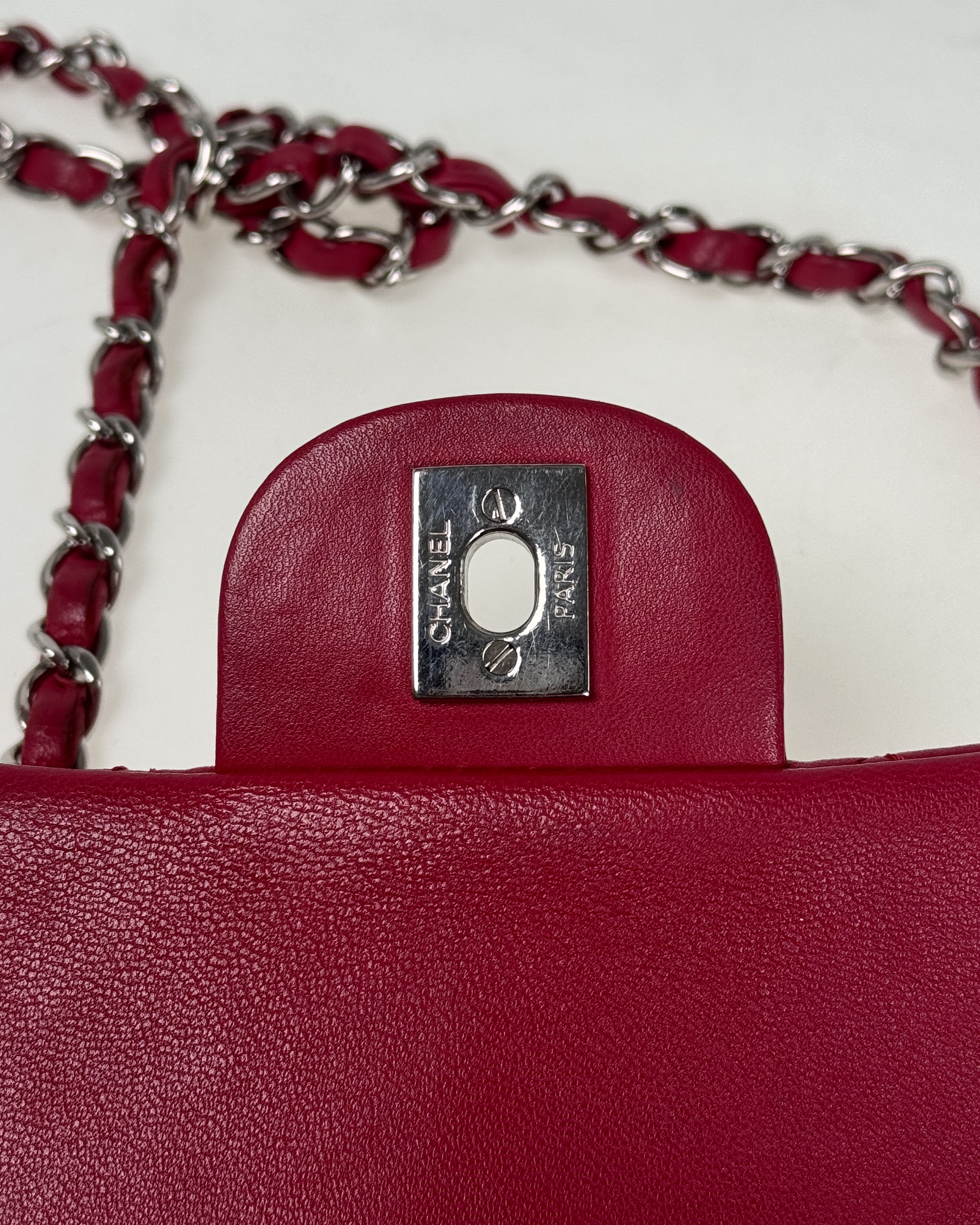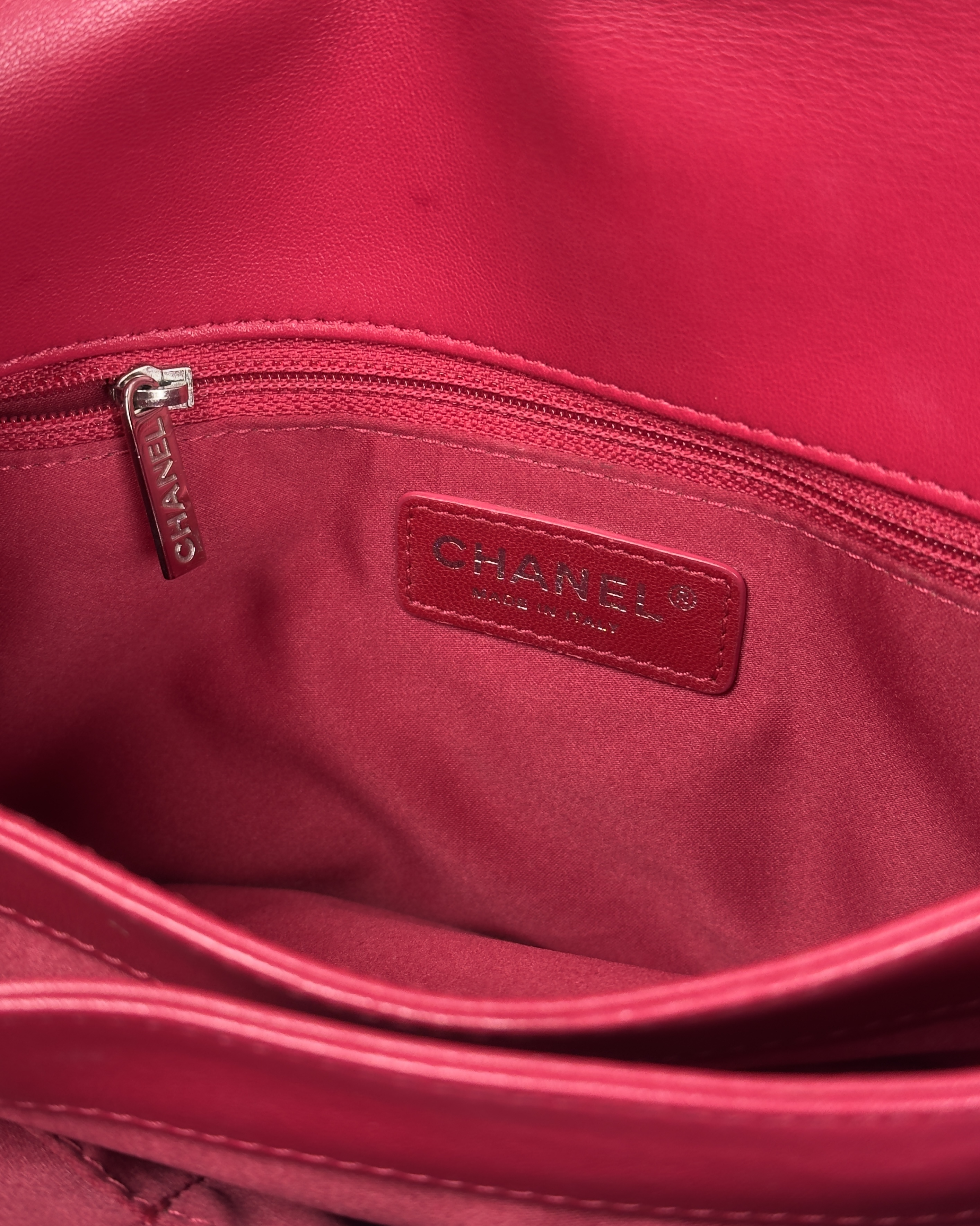 "Chanel Classic Flap - torebka wykonana z miękkiej, pikowanej skóry jagnięcej w intensywnym różowym odcieniu. Model zapinany na charakterystyczne zapięcie CC Turnlock w kolorze srebrnym. Torebka posiada klasyczną klapę, w środku dwie przegrody oraz kieszonkę na zamek. Stan bardzo dobry, posiada kartę autentyczności."