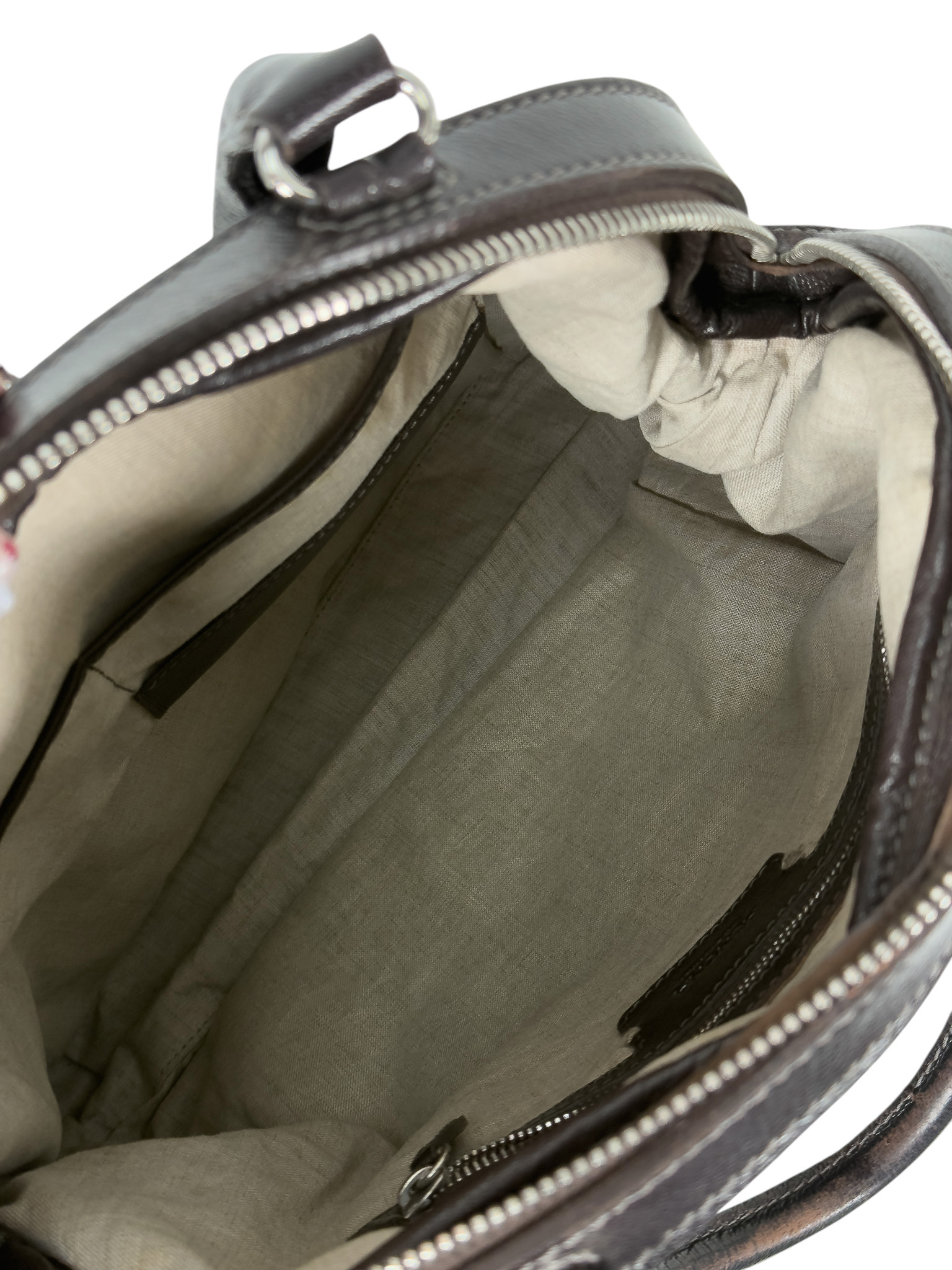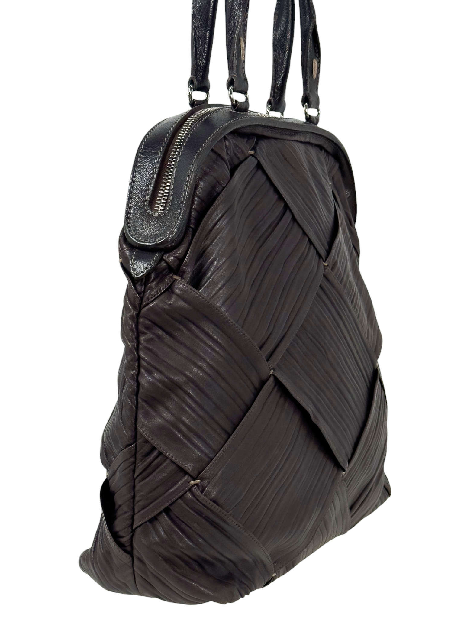 "Brązowa skórzana torebka, do ręki, na ramię, dwa uchwyty, zapinana na srebrny suwak, ozdobiona szerokim, delikatnie marszczonym pleceniem, jedna komora wewnątrz z trzema kieszeniami. Stan dobry, posiada przetarcia od spodu oraz przy suwaku i delikatne rysy na skórze. Wymiary: szerokość 36cm, wysokość 40cm, głębokość 13cm."